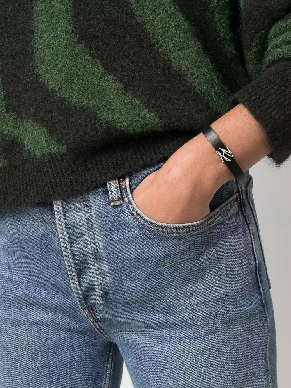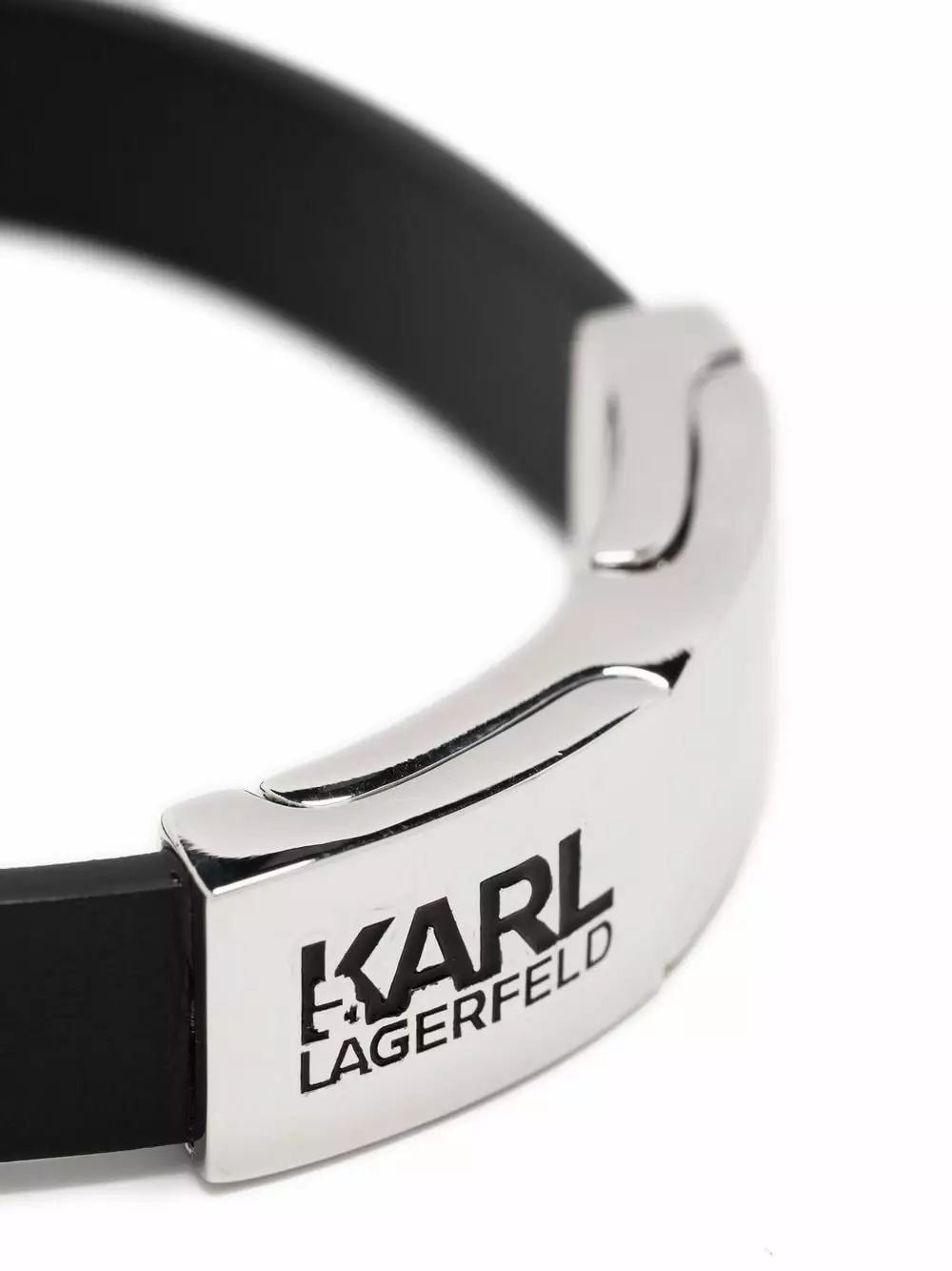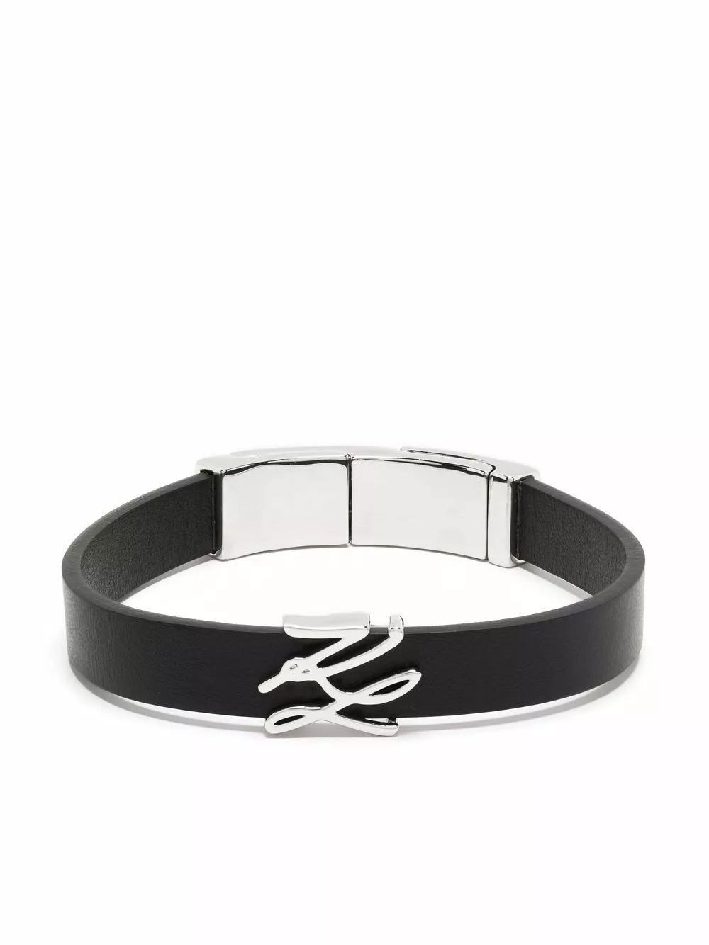 This black leather bracelet serves as an ode to designer Karl Lagerfeld. The accessory is detailed with a silver-tone logo plaque.