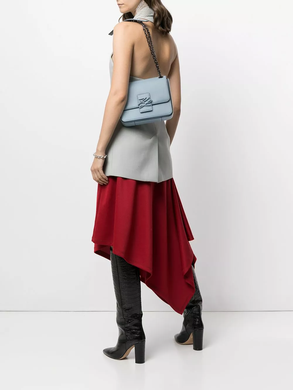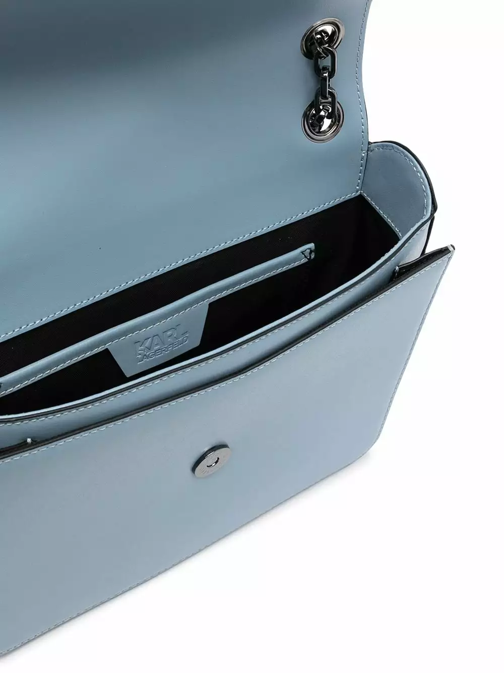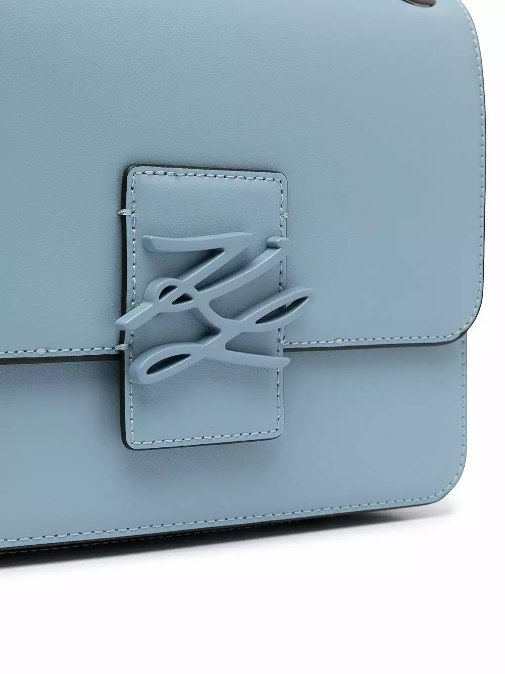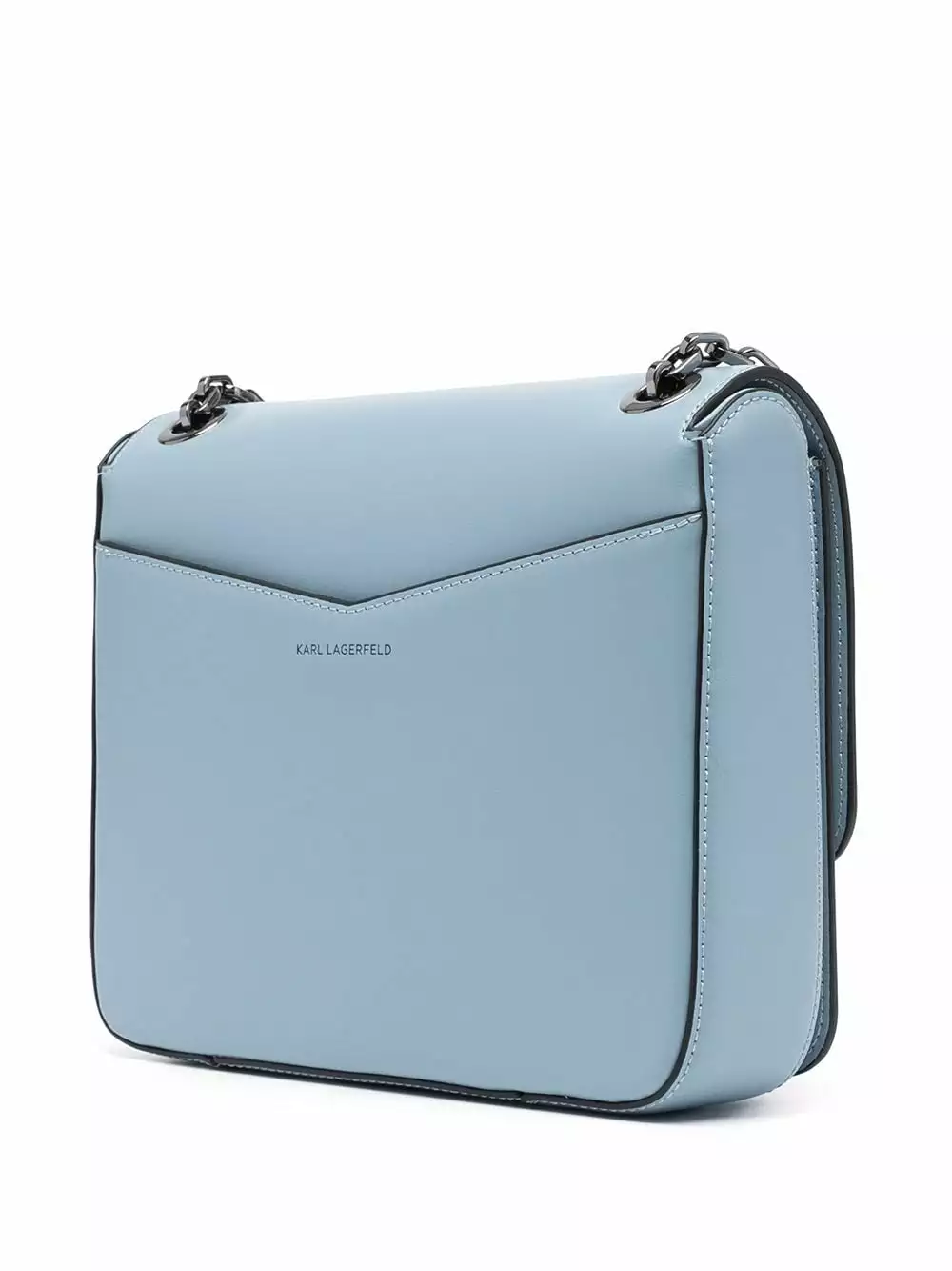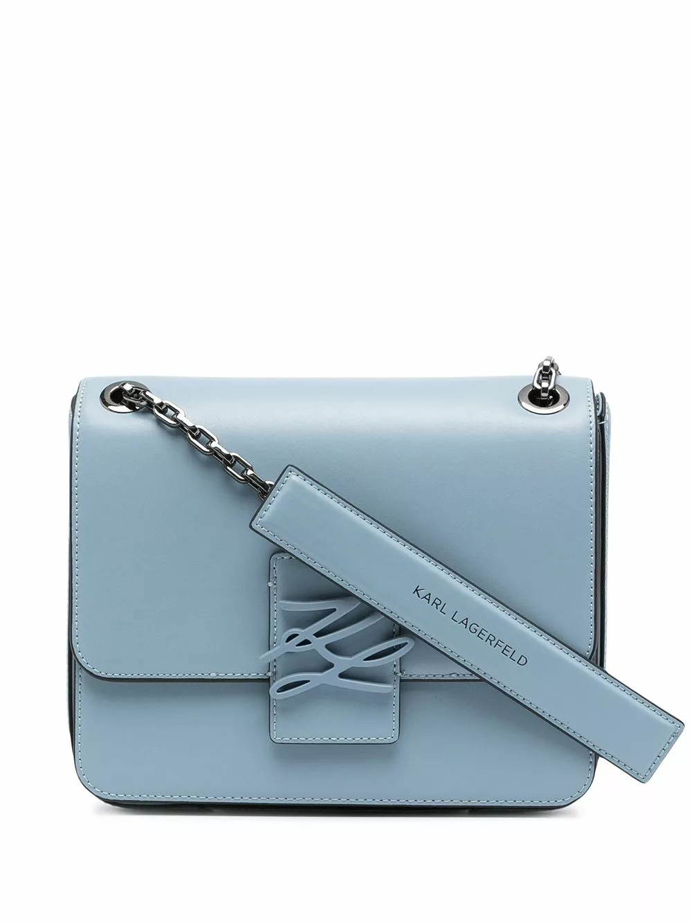 Sky blue Autograph shoulder bag from KARL LAGERFELD featuring a rectangular body, silver-tone hardware, a front flap closure, a magnetic fastening, patch pockets, a rear patch pocket, an internal logo patch, a full lining, a rear logo stamp, signature autograph plaque and leather and chain-link shoulder strap.