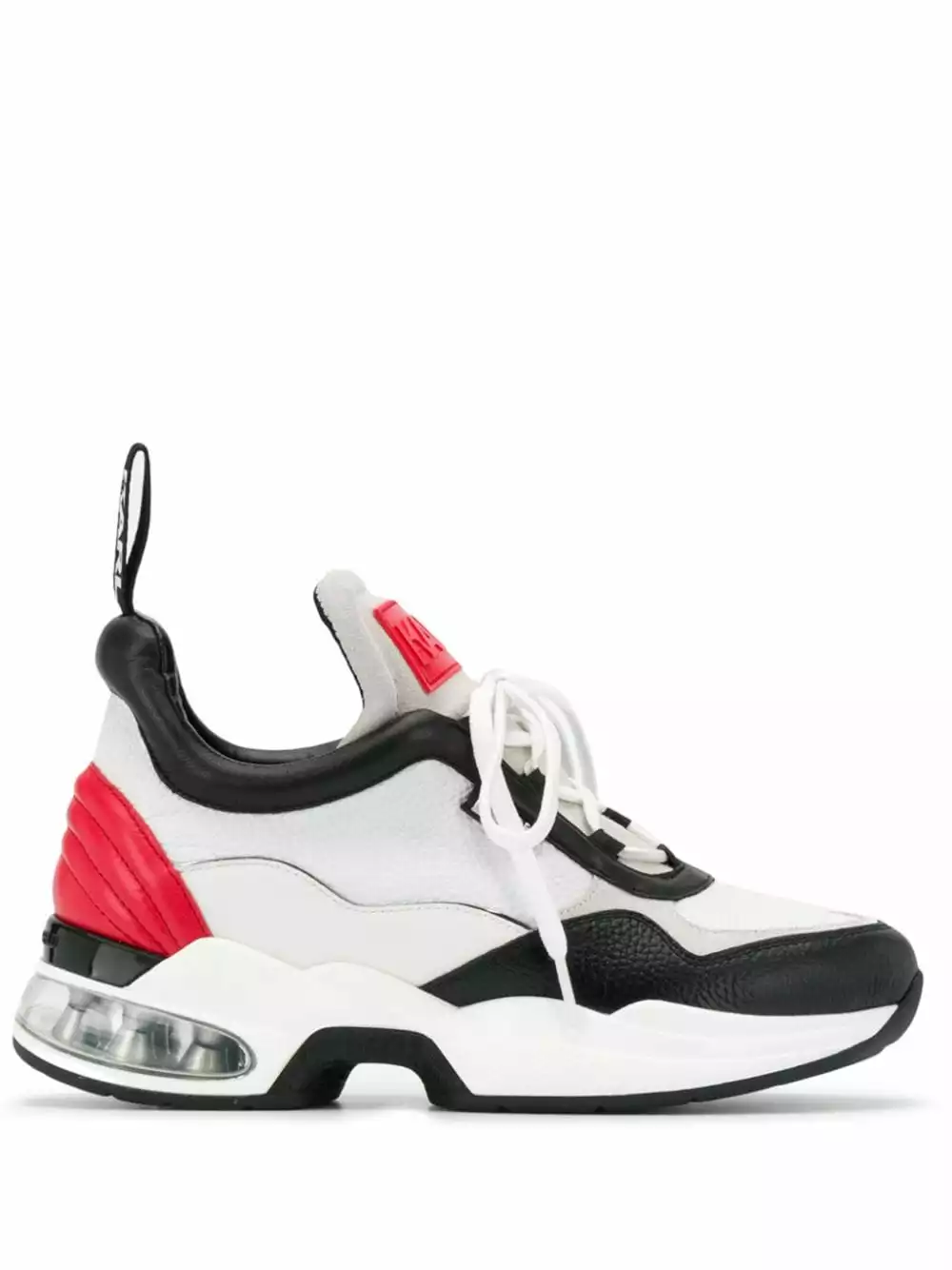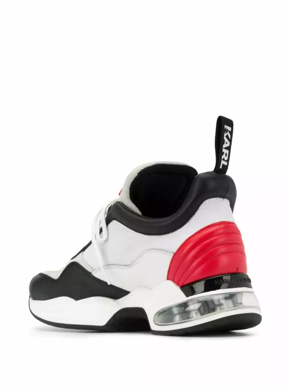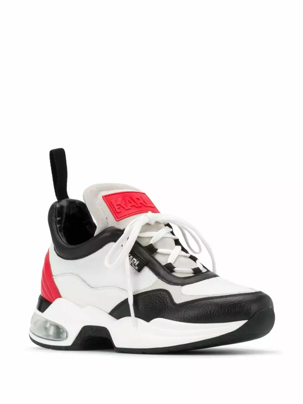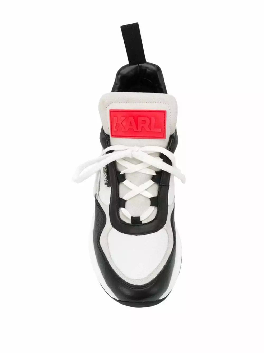 White leather sneakers from Karl Lagerfeld featuring a panelled colour block design, a round toe, a pull tab at the rear and a platform sole.