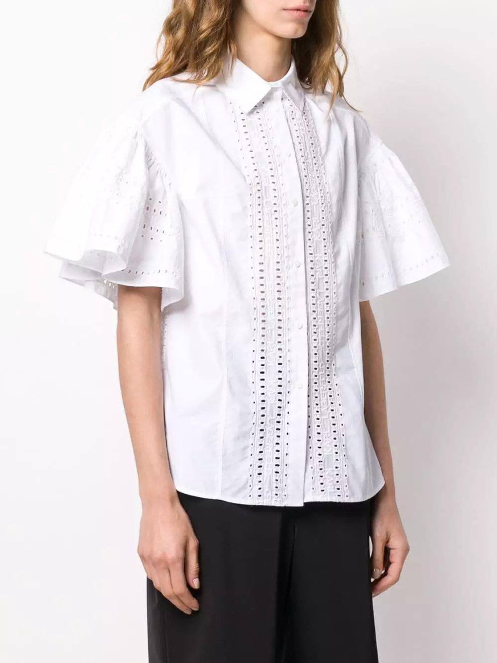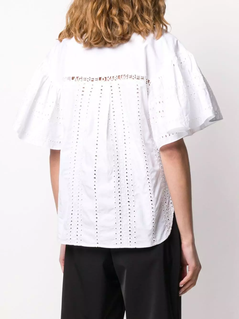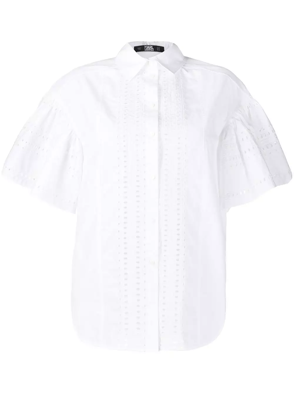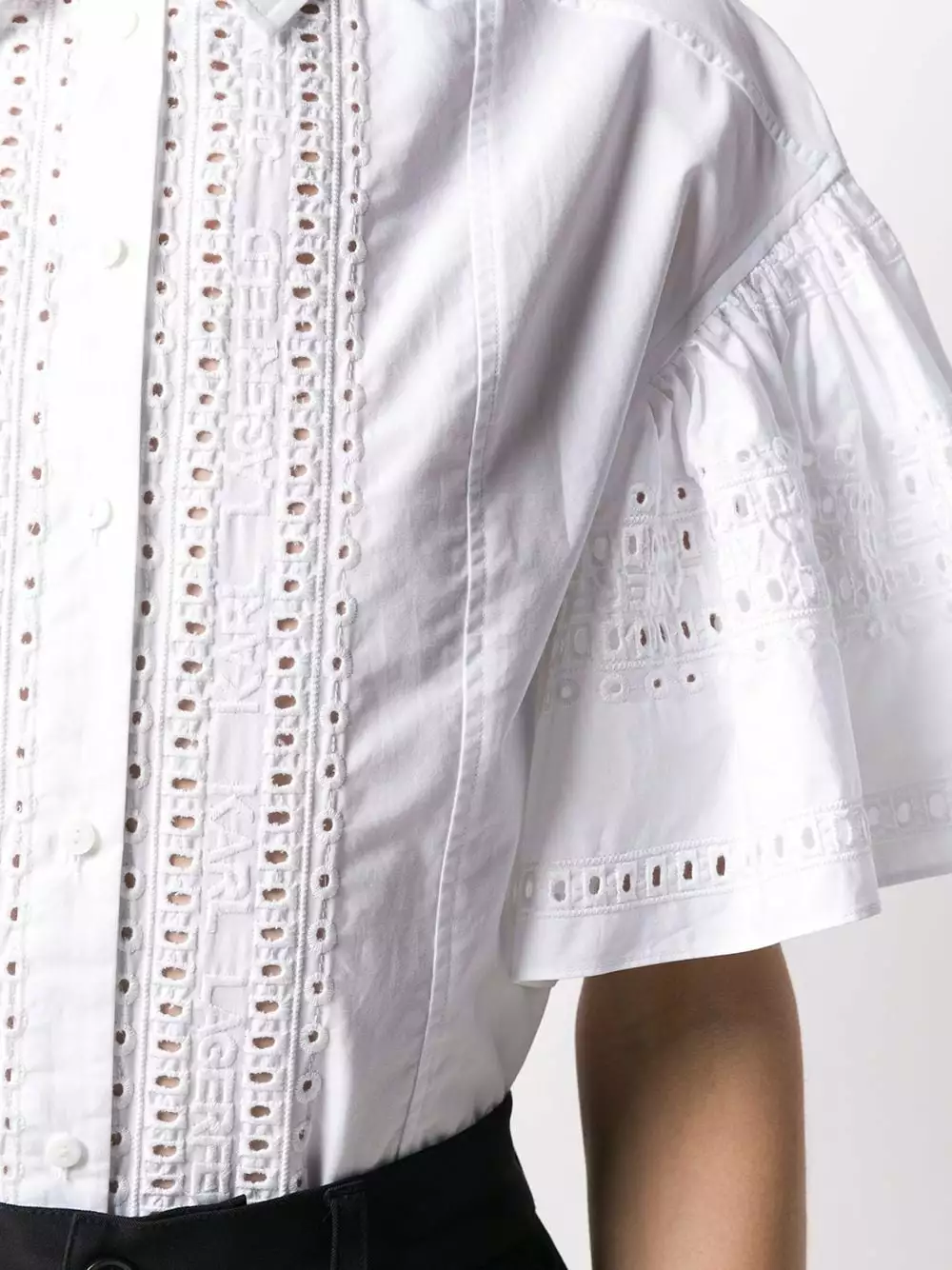White cotton embroidered poplin shirt from Karl Lagerfeld featuring an embroidered design, a spread collar, a concealed front fastening, short wide sleeves and a curved hem.