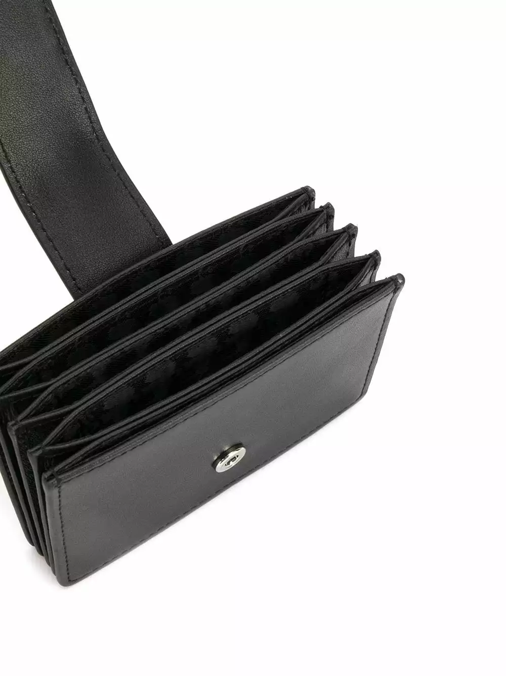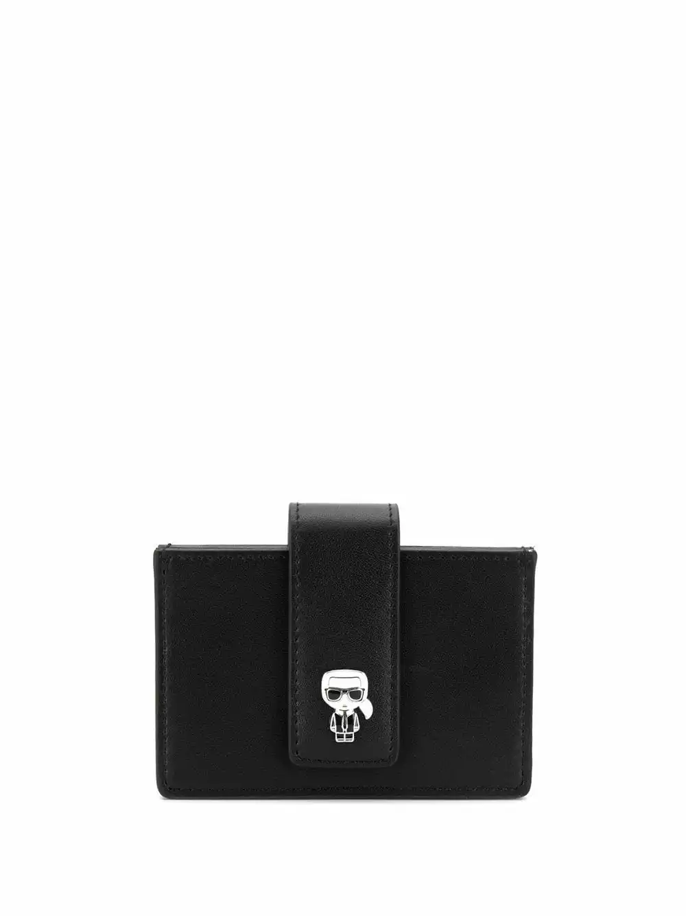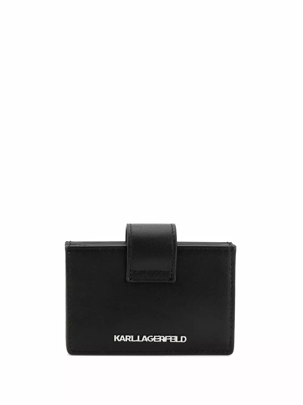 Black leather enamelled Karl wallet from Karl Lagerfeld featuring a foldover top with snap closure, multiple interior card slots and a monogram printed lining.
