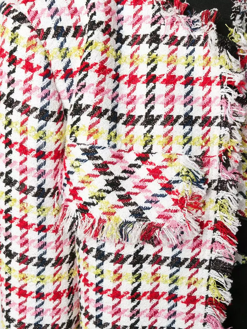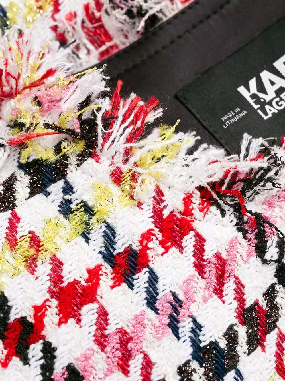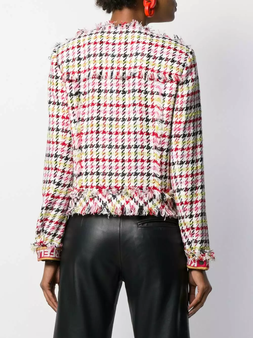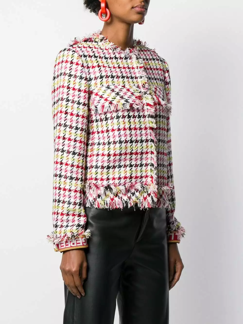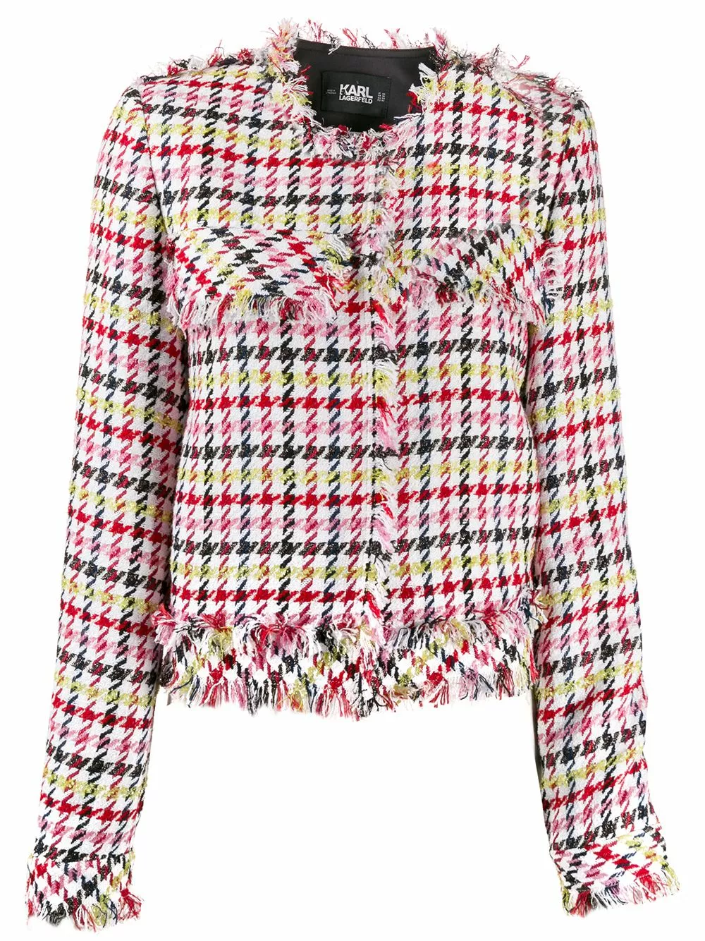 White wool fitted houndstooth boucle jacket from Karl Lagerfeld featuring a round neck, a concealed fastening, long sleeves, raw edges, a slim fit, a short length and a houndstooth pattern.