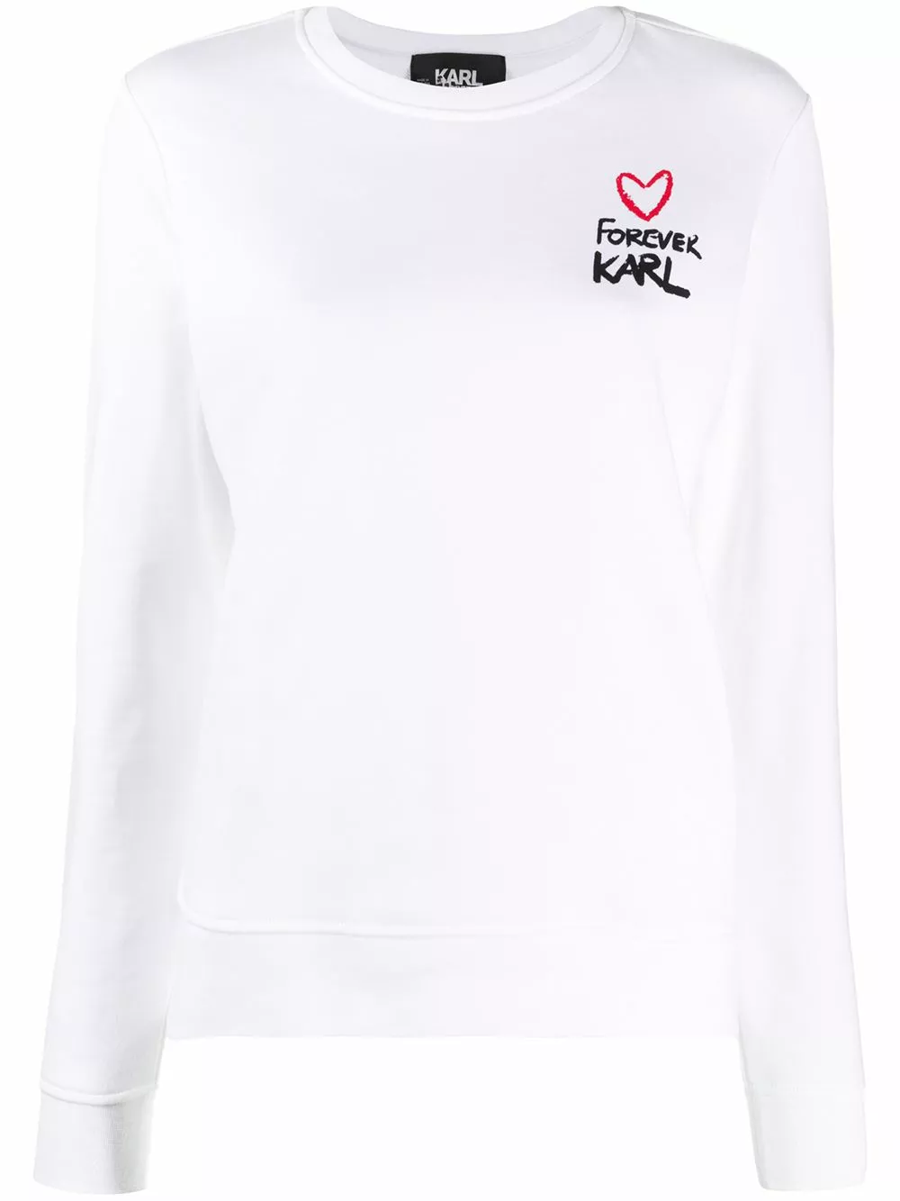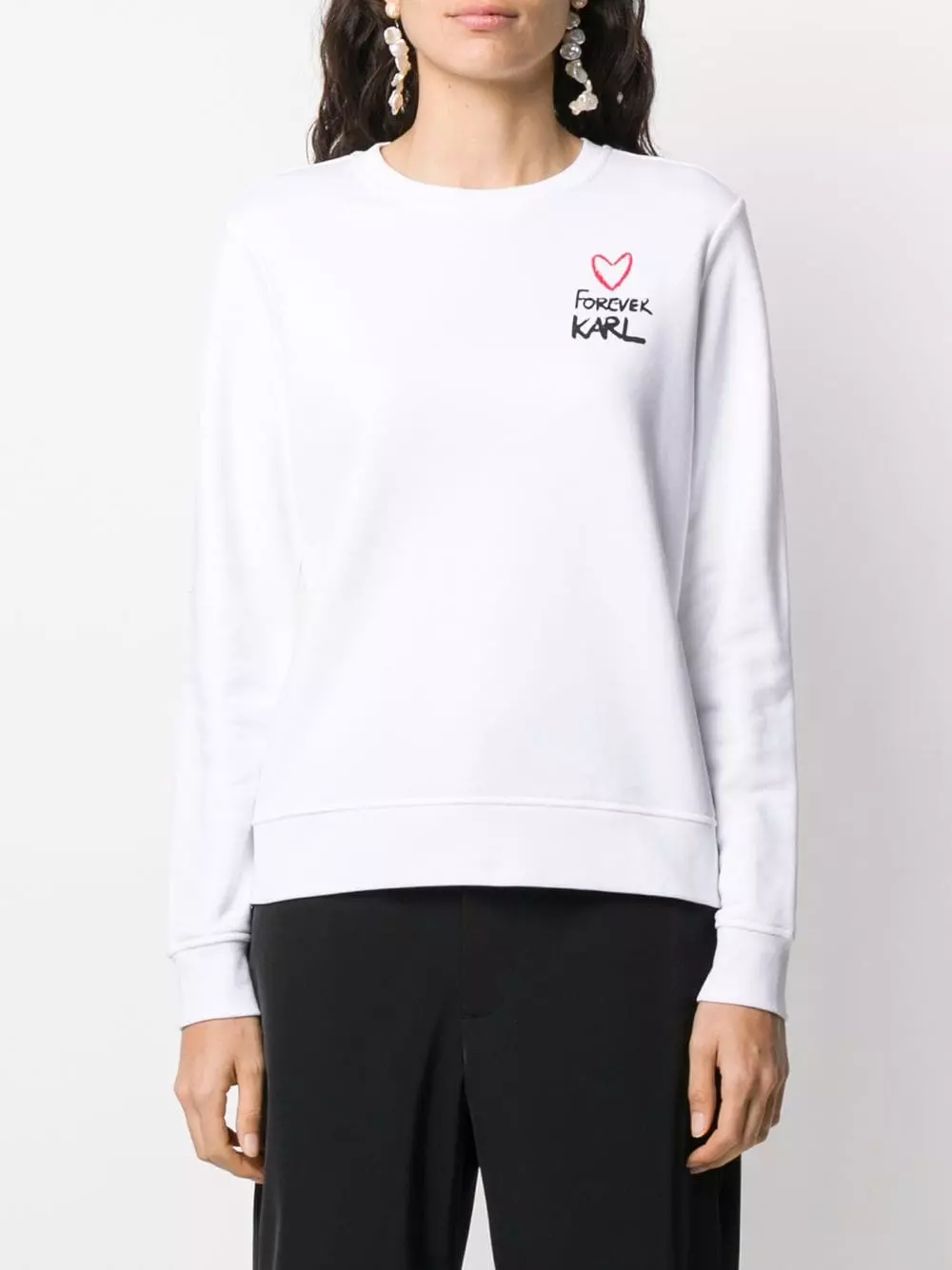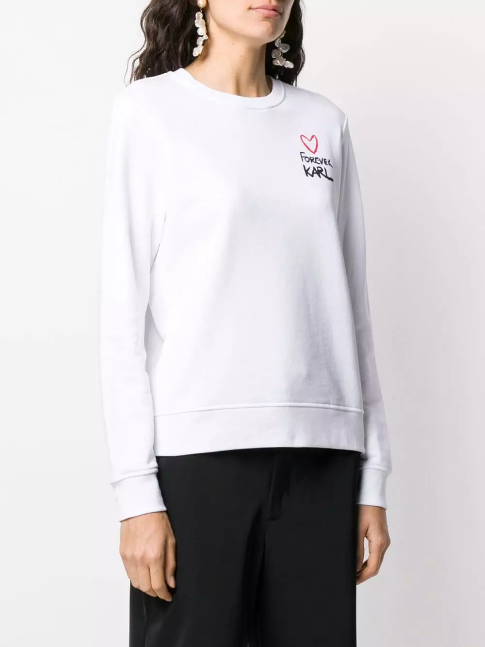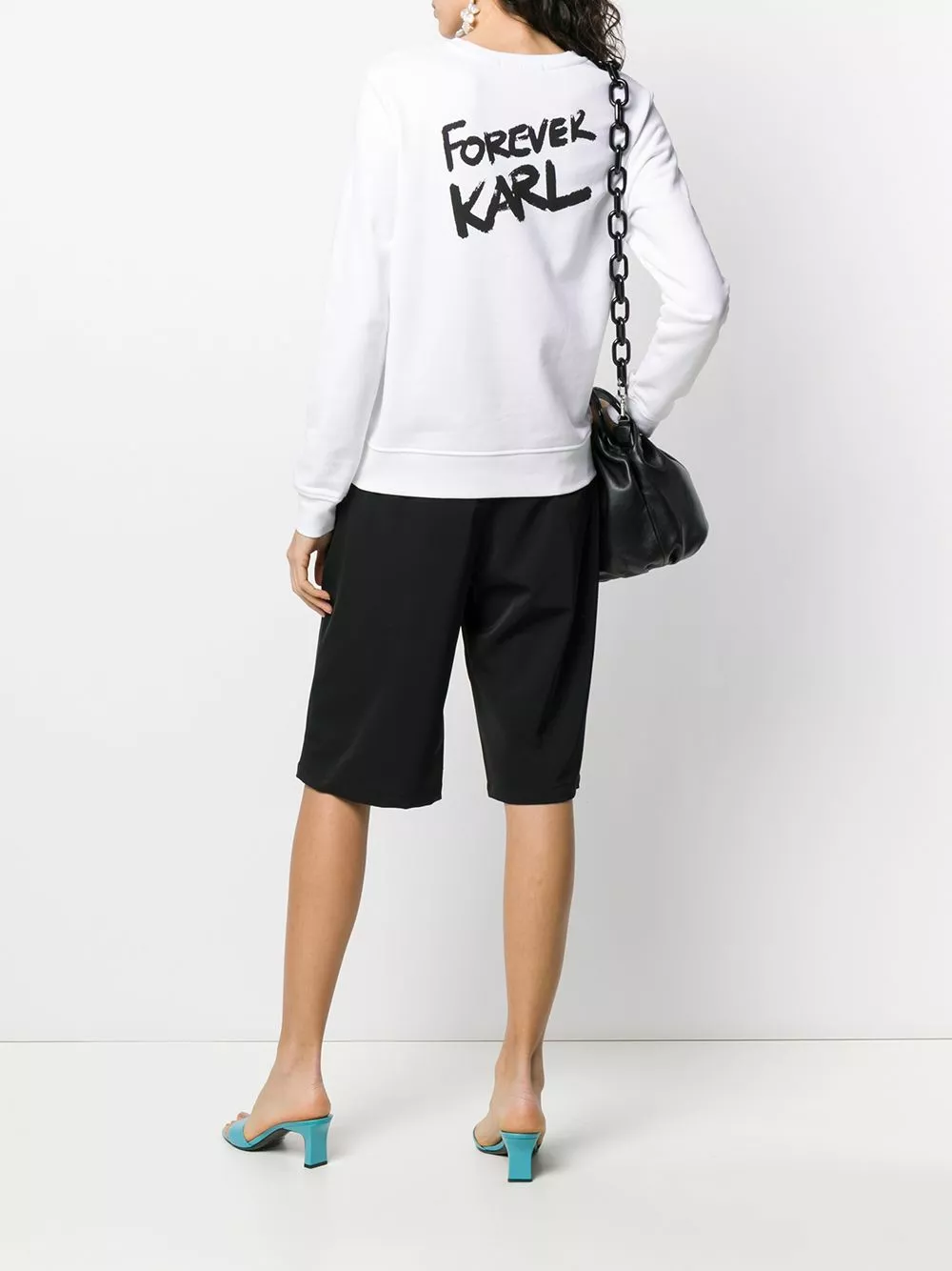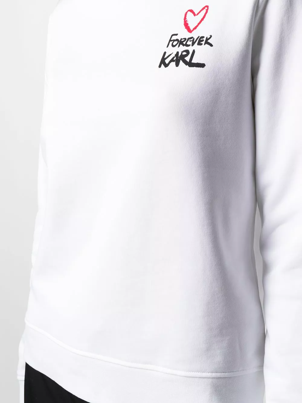 White cotton Forever Karl crew neck sweatshirt from Karl Lagerfeld featuring a print to the front, a print to the rear, a crew neck, long sleeves, fitted cuffs and a straight hem.