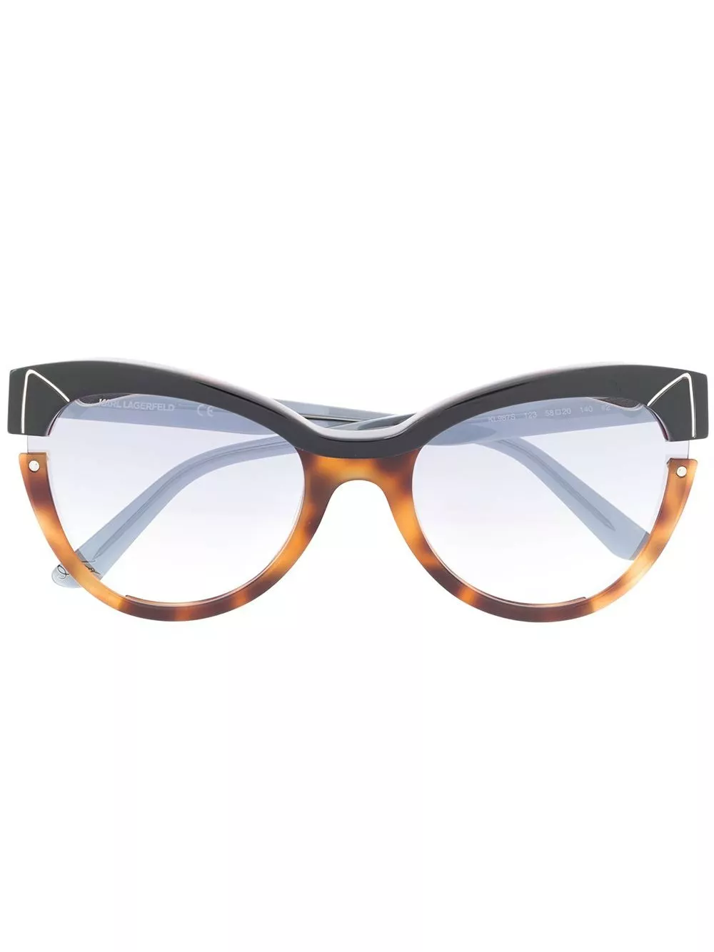 Havana brown and black Ikonik Choupette sunglasses from Karl Lagerfeld featuring cat eye frames, tinted lenses, a curved nose bridge and side logo branding. This item comes with a protective case.