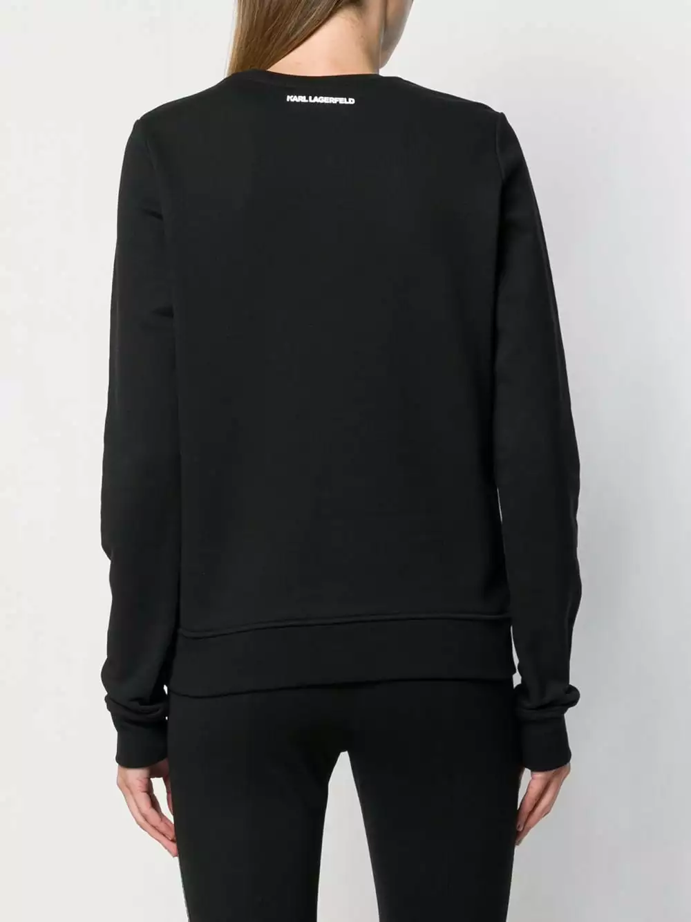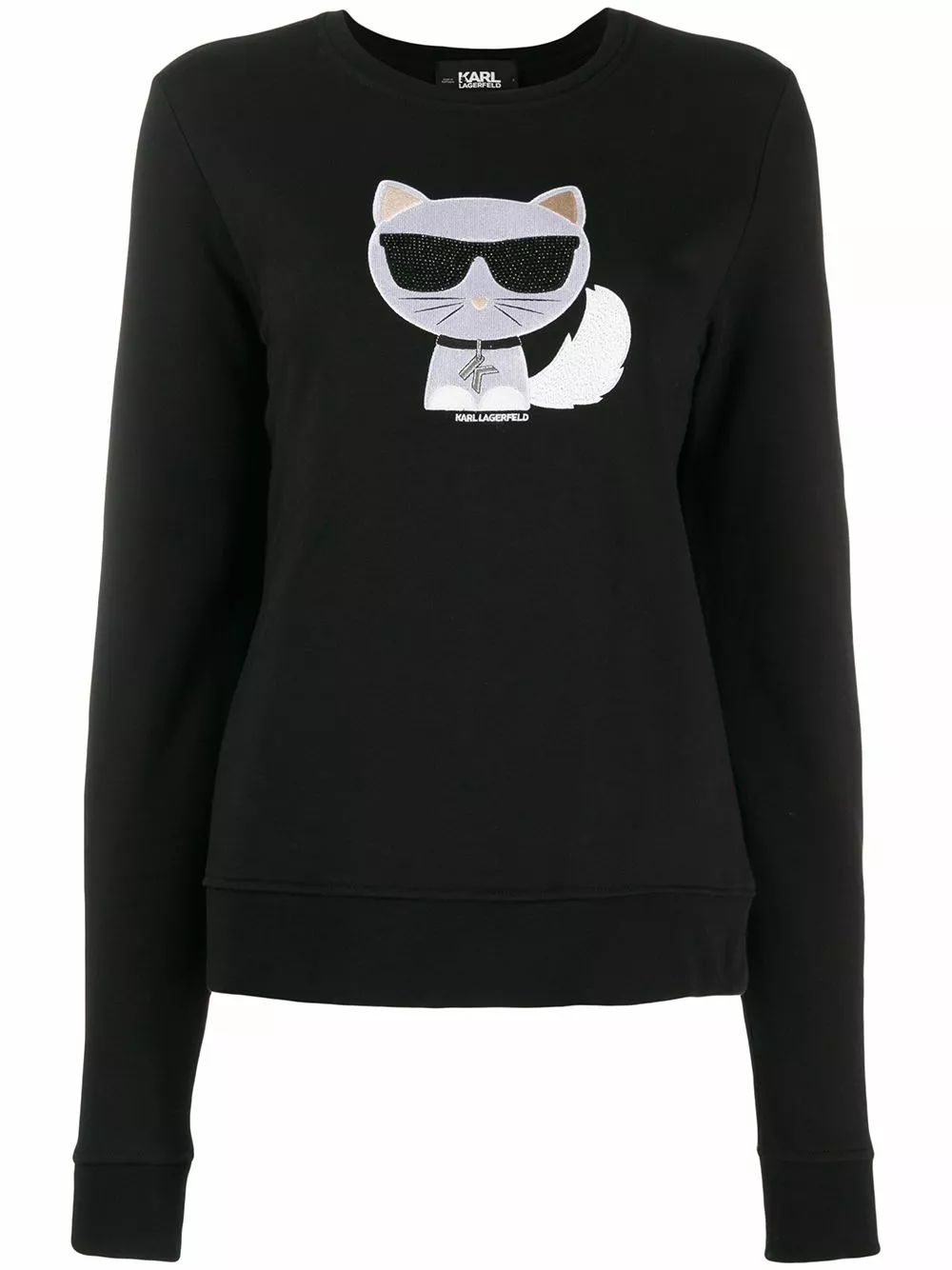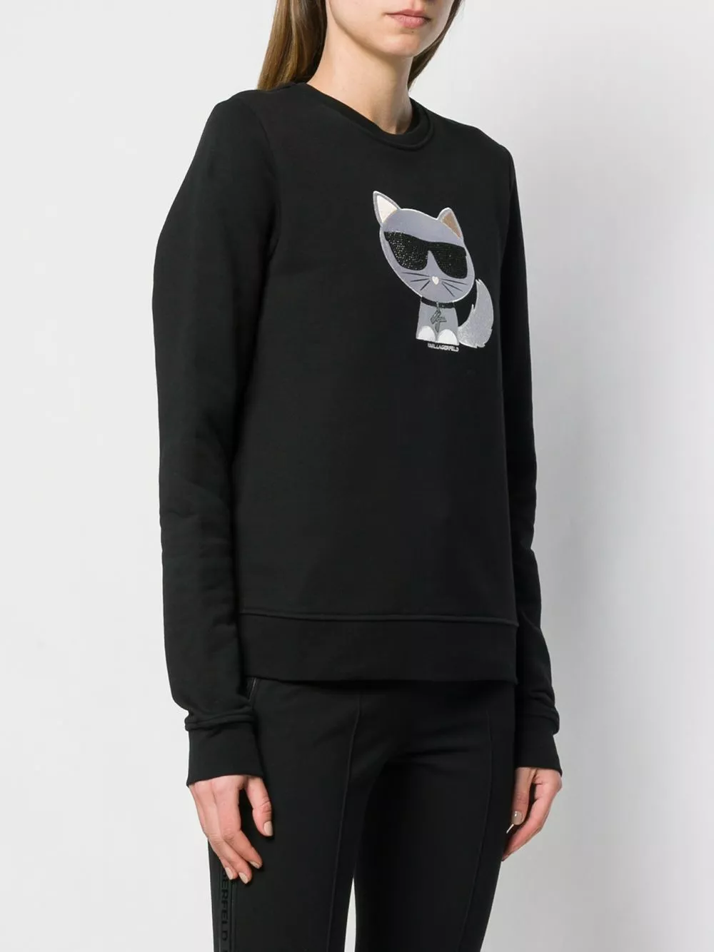 Black cotton Ikonik Choupette sweater from Karl Lagerfeld featuring a graphic print, a straight hem, a crew neck with welt finishing and long sleeves.