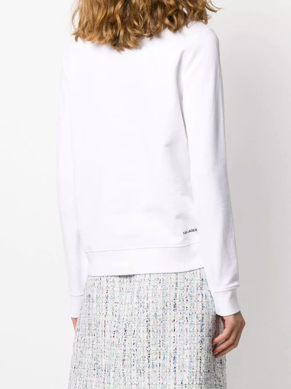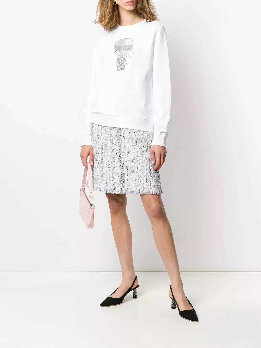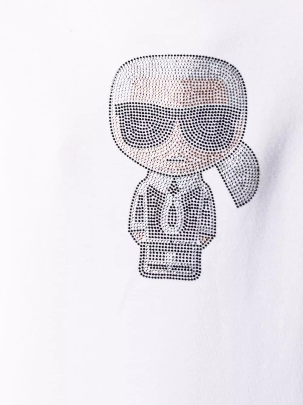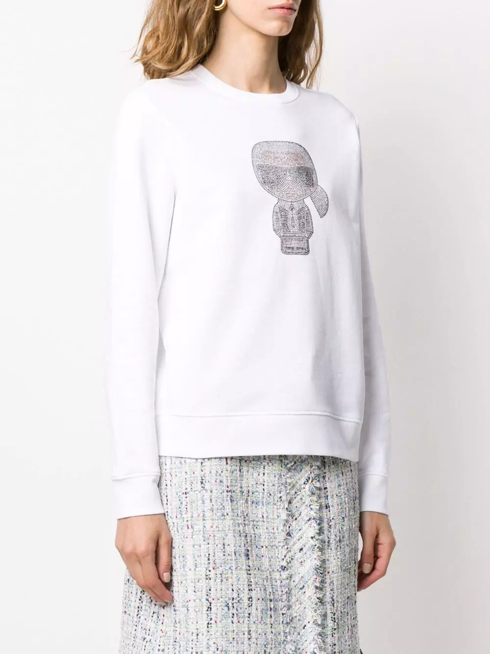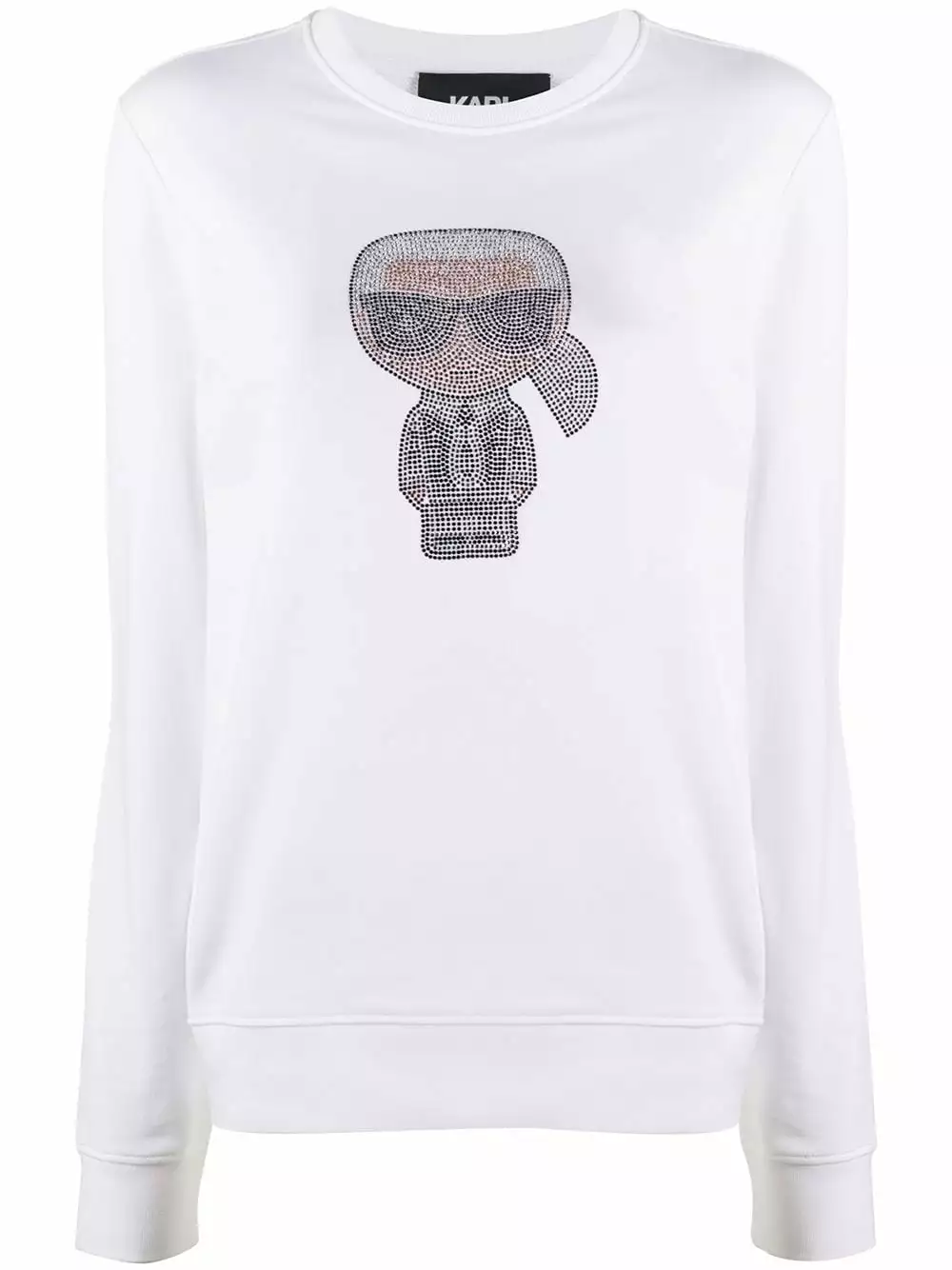 White cotton Ikonik Karl rhinestone sweatshirt from Karl Lagerfeld featuring a logo to the chest, rhinestone embellishments, a multicolored pattern, a ribbed crew neck, long sleeves and a ribbed hem and cuffs.