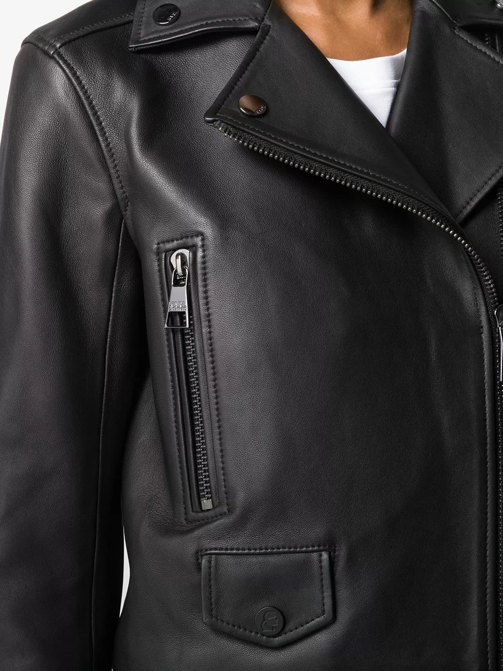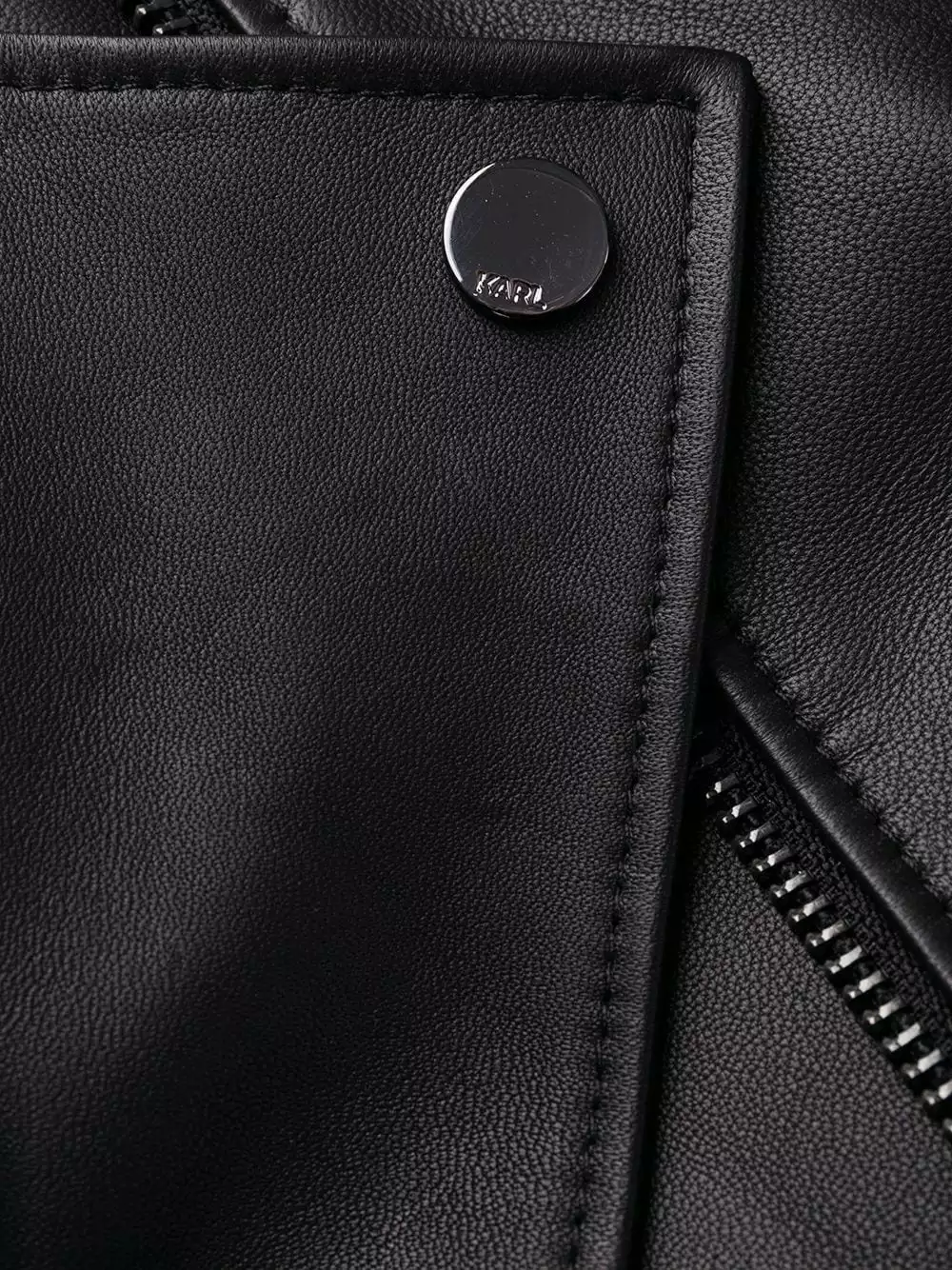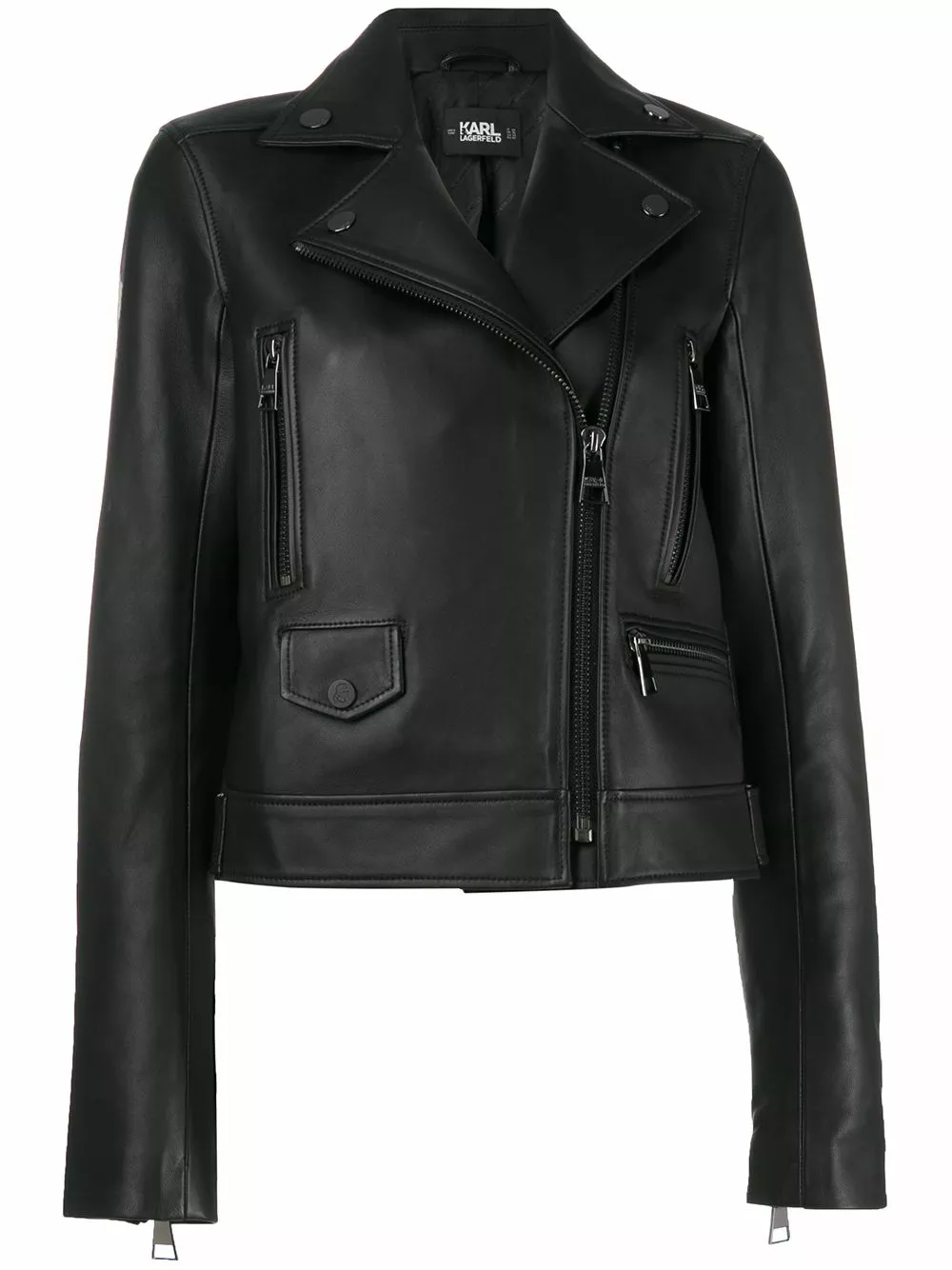 Black Ikonik leather biker jacket from Karl Lagerfeld featuring a pointed collar, an off-centre front zip fastening, front zipped pockets, long sleeves, zip cuffs, side waist tabs, a logo printed lining and a short length.