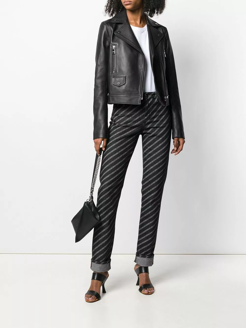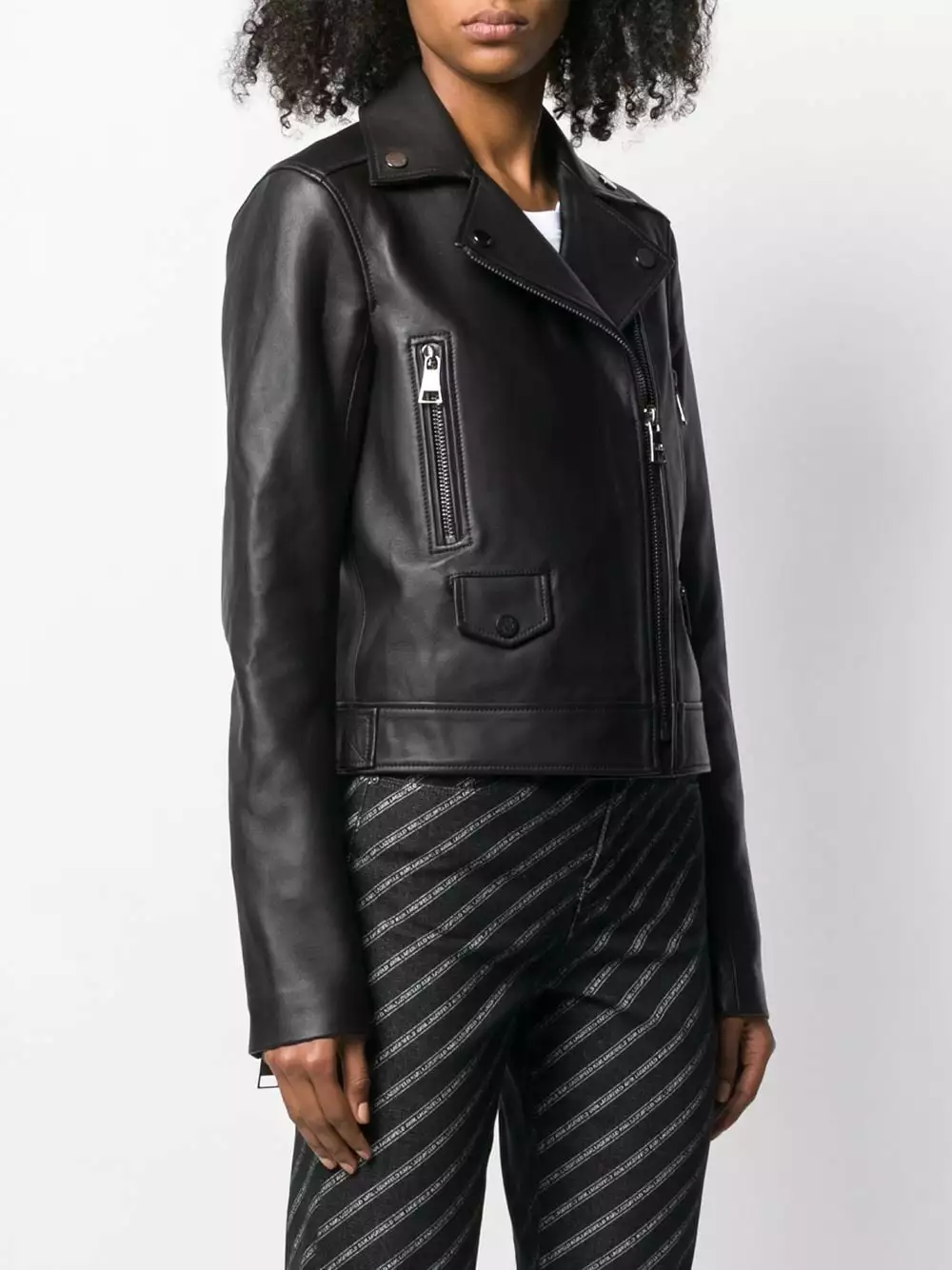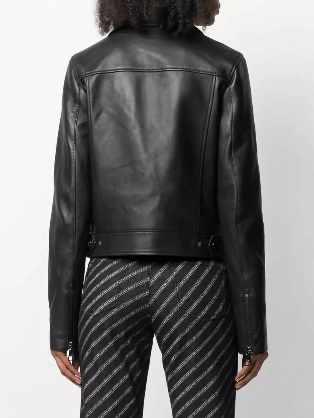 Black Ikonik leather biker jacket from Karl Lagerfeld featuring a pointed collar, an off-centre front zip fastening, front zipped pockets, long sleeves, zip cuffs, side waist tabs, a logo printed lining and a short length.