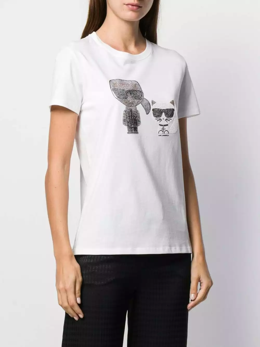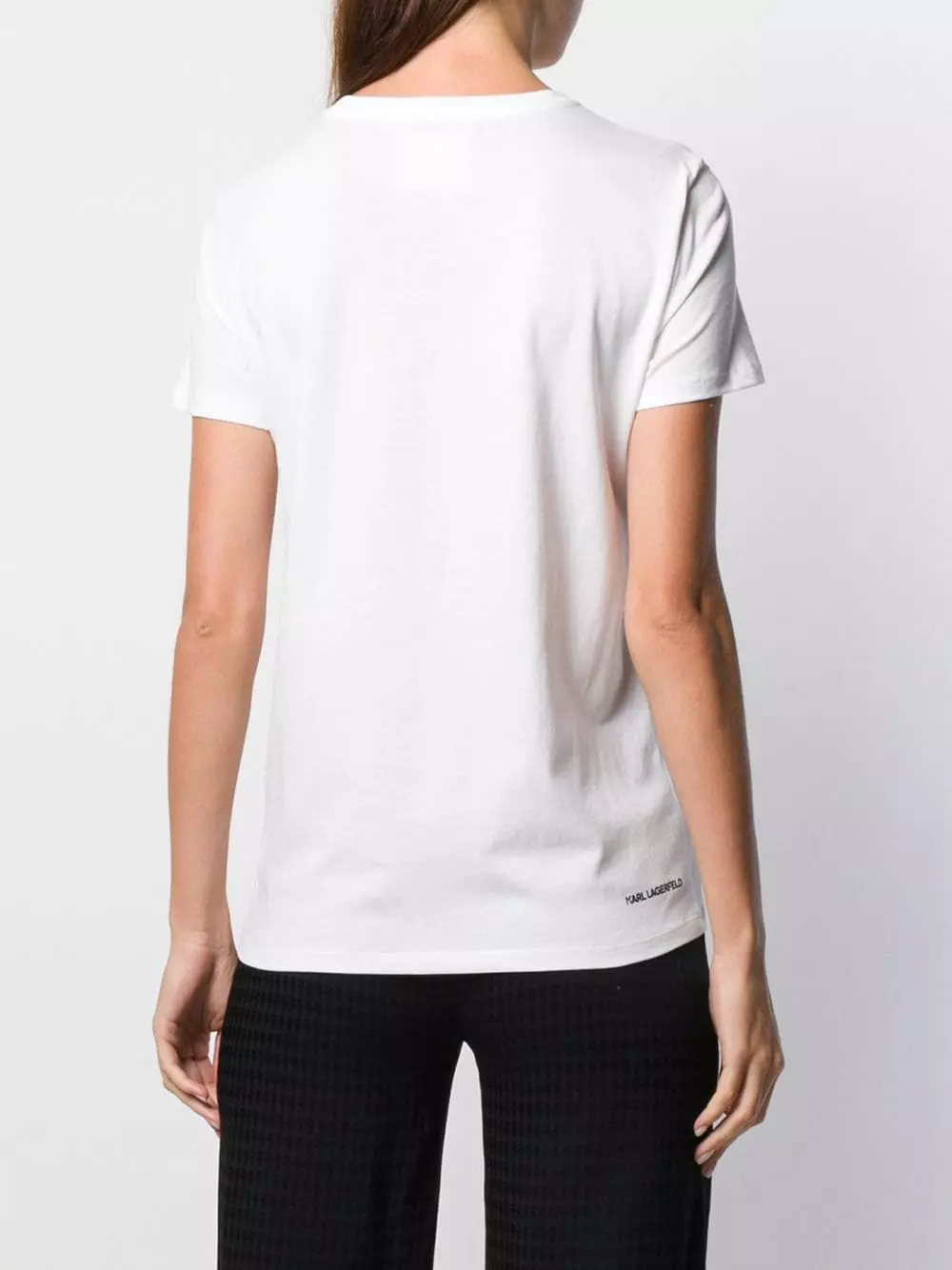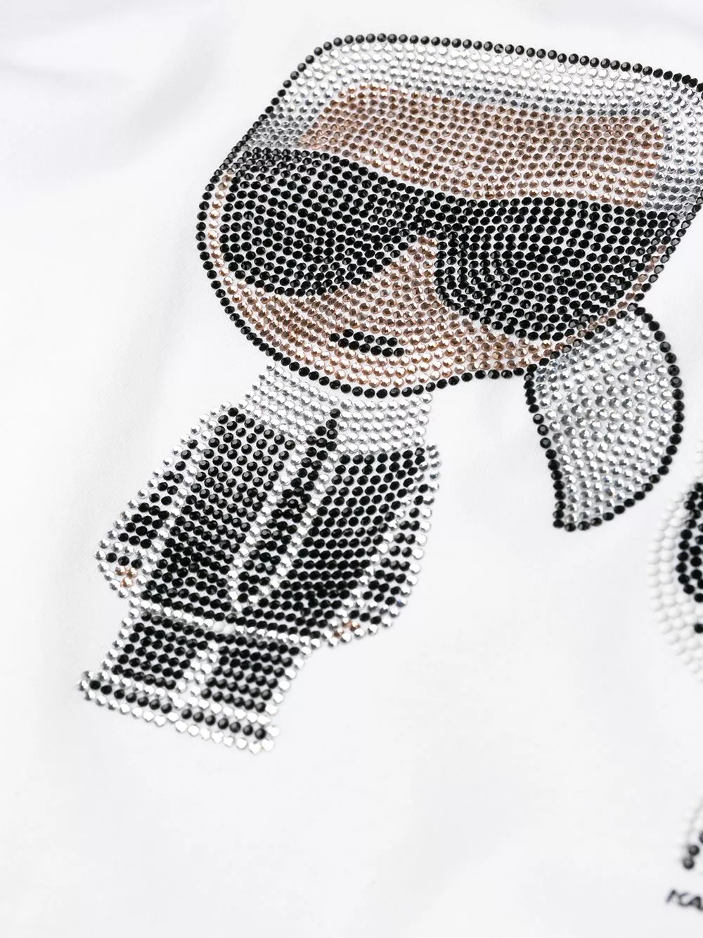 White cotton Ikonik T-shirt from Karl Lagerfeld featuring a round neck, short sleeves and crystal embellishments.