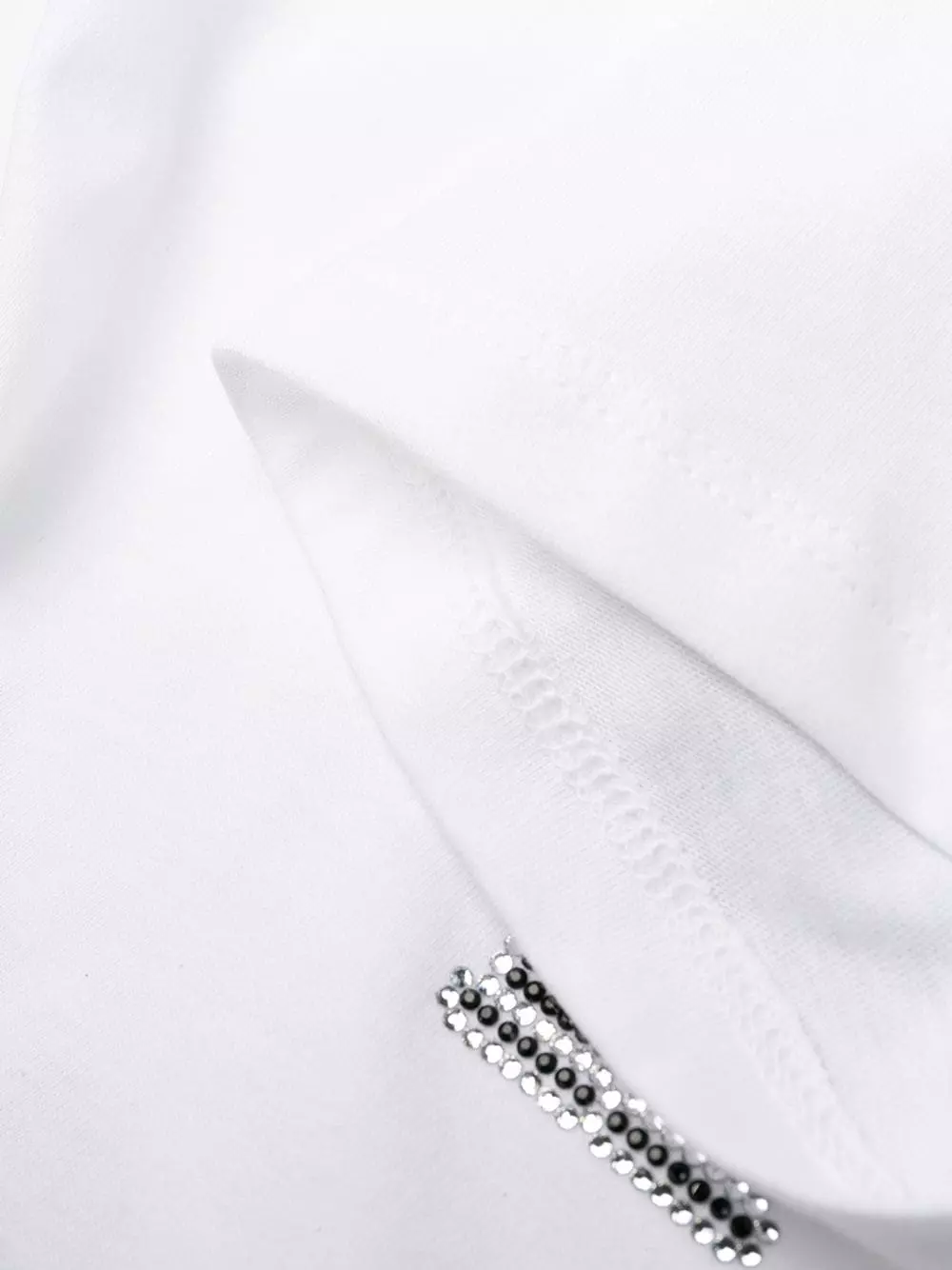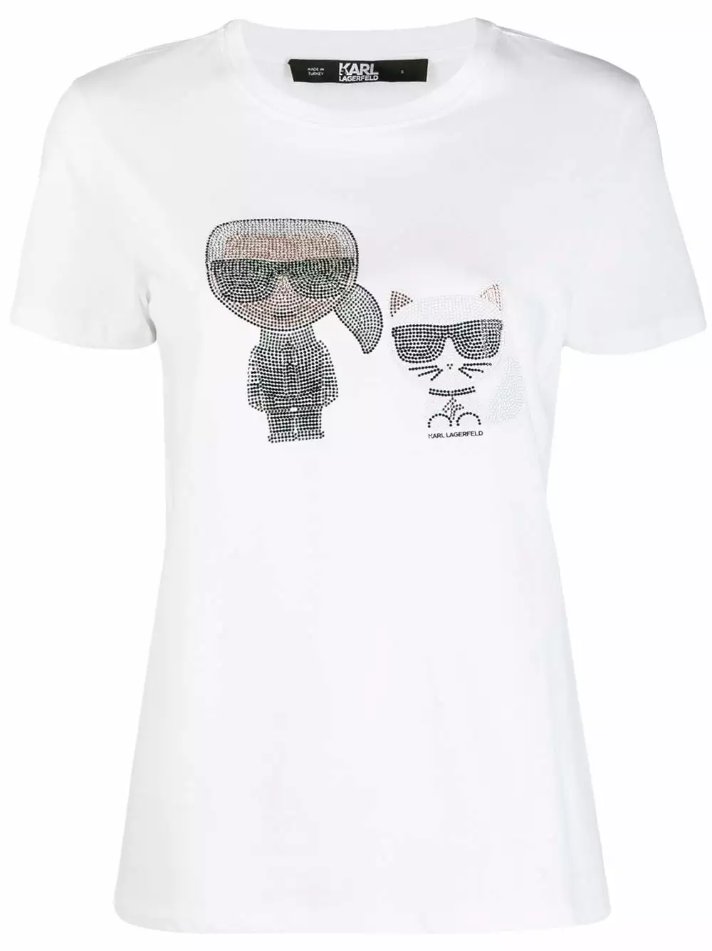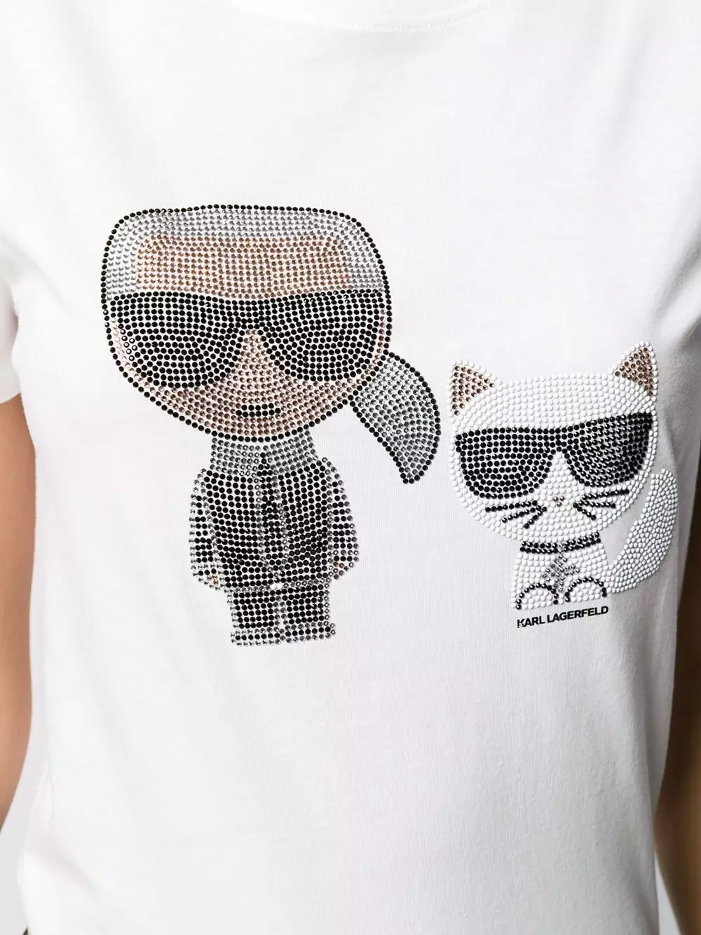 White cotton Ikonik T-shirt from Karl Lagerfeld featuring a round neck, short sleeves and crystal embellishments.