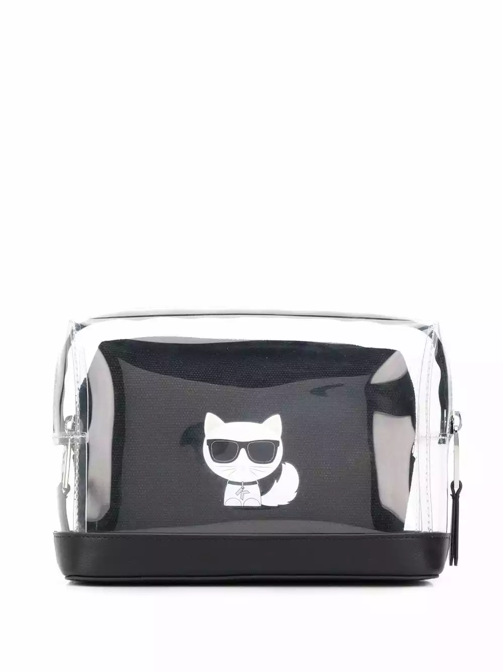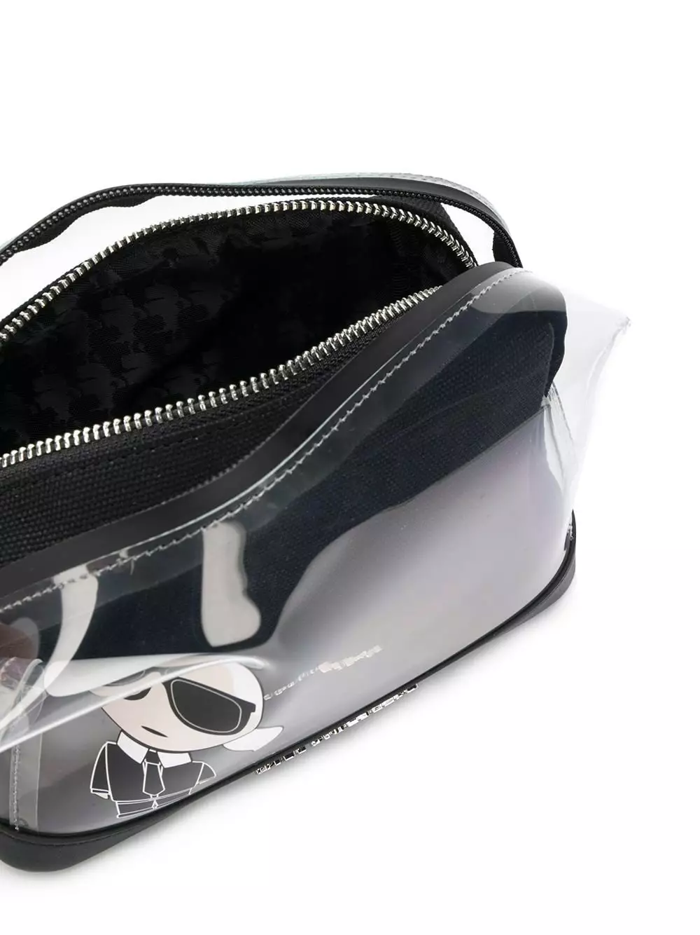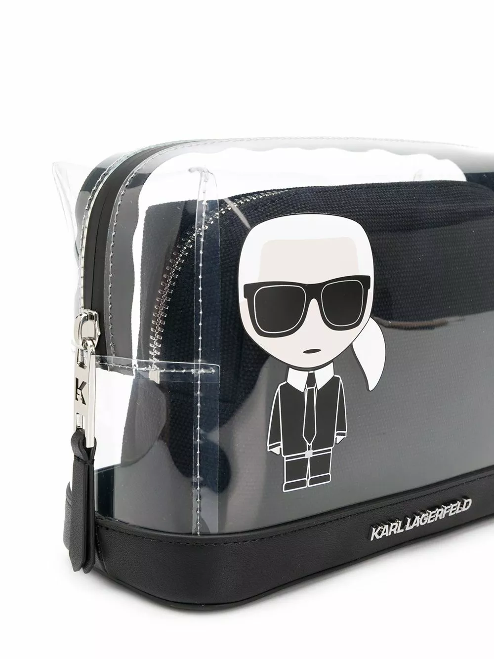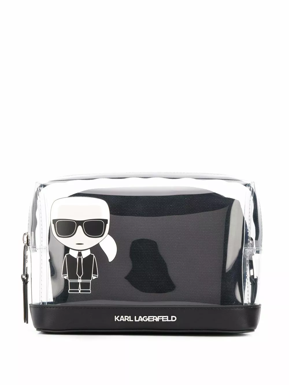 Black cotton blend K/Ikonic logo pouch bag from Karl Lagerfeld featuring a transparent design, a print to the front, a front logo plaque, a print to the rear, a top zip closure, a removable pouch and a logo printed lining.