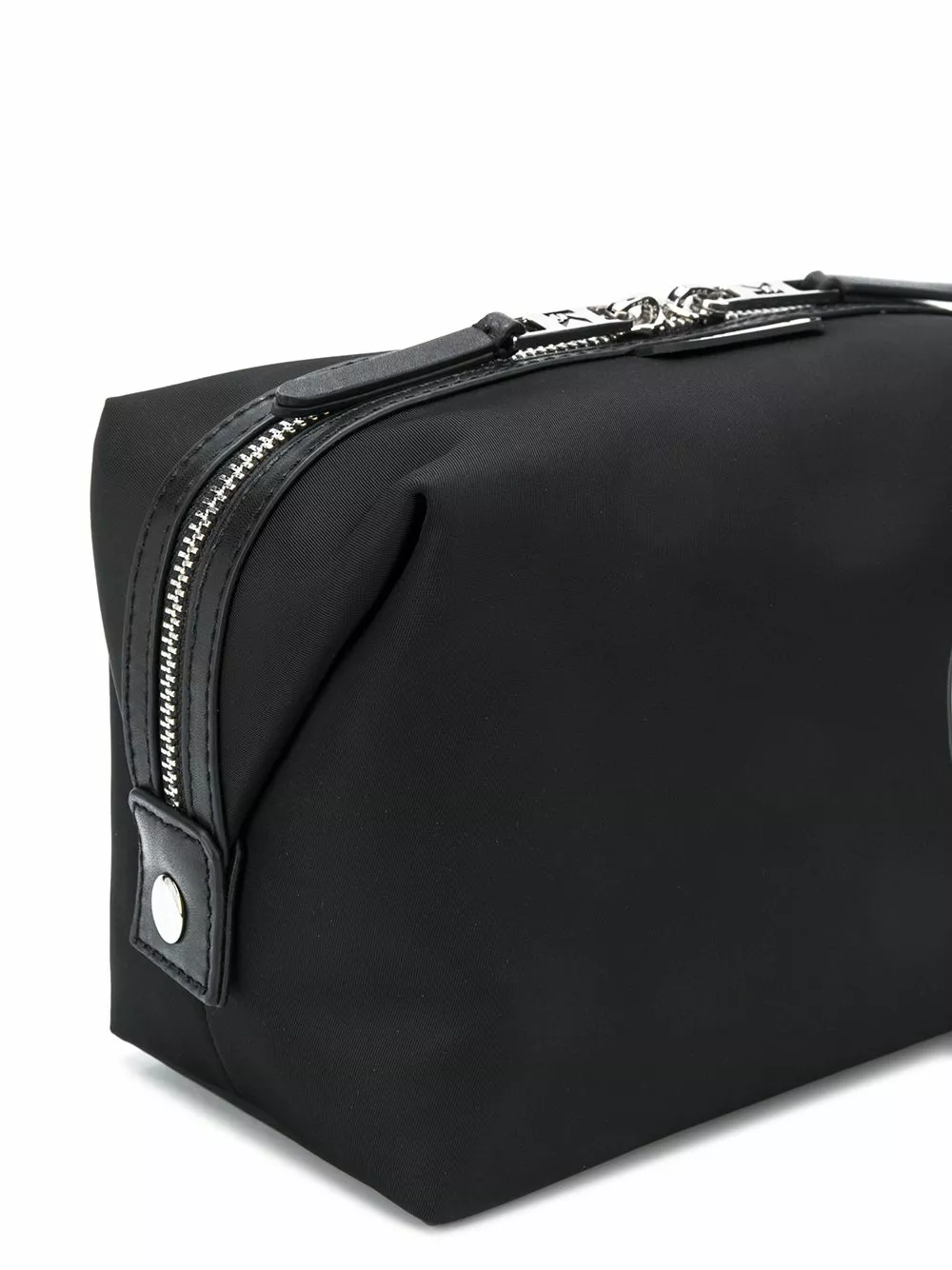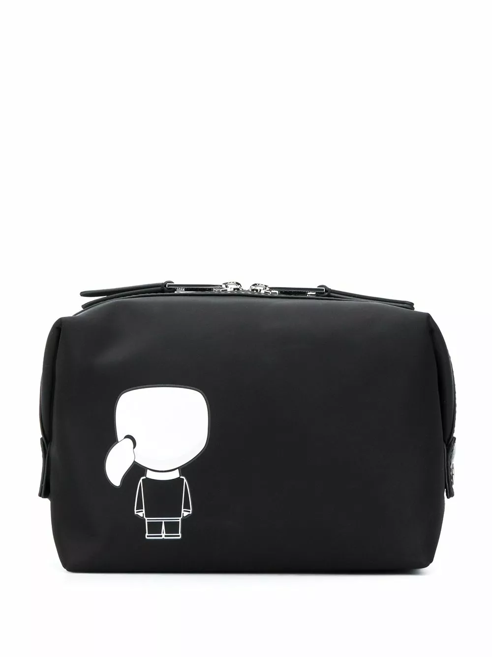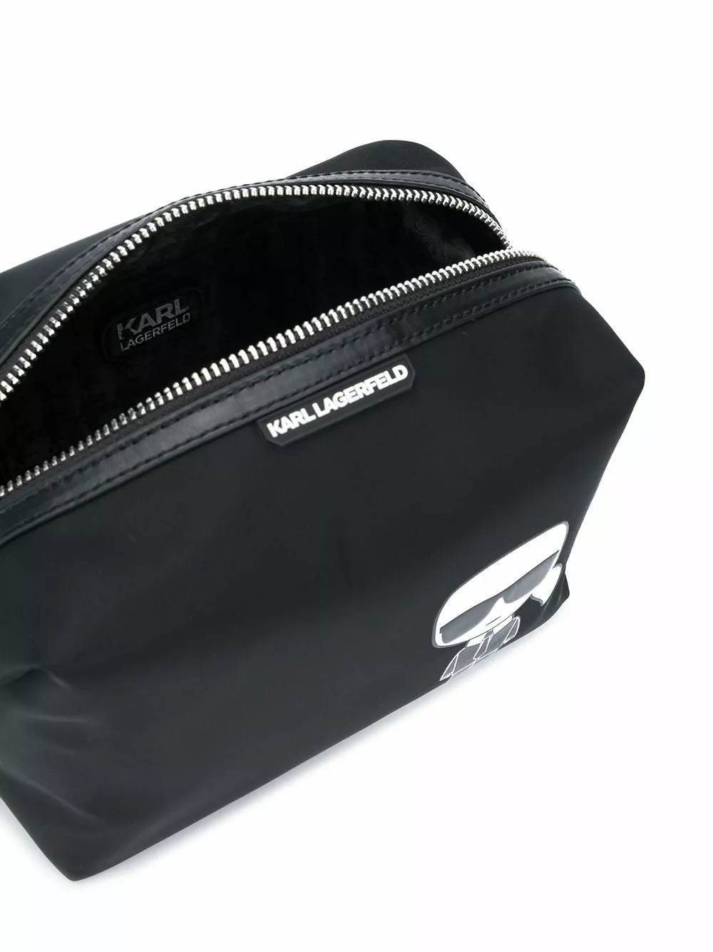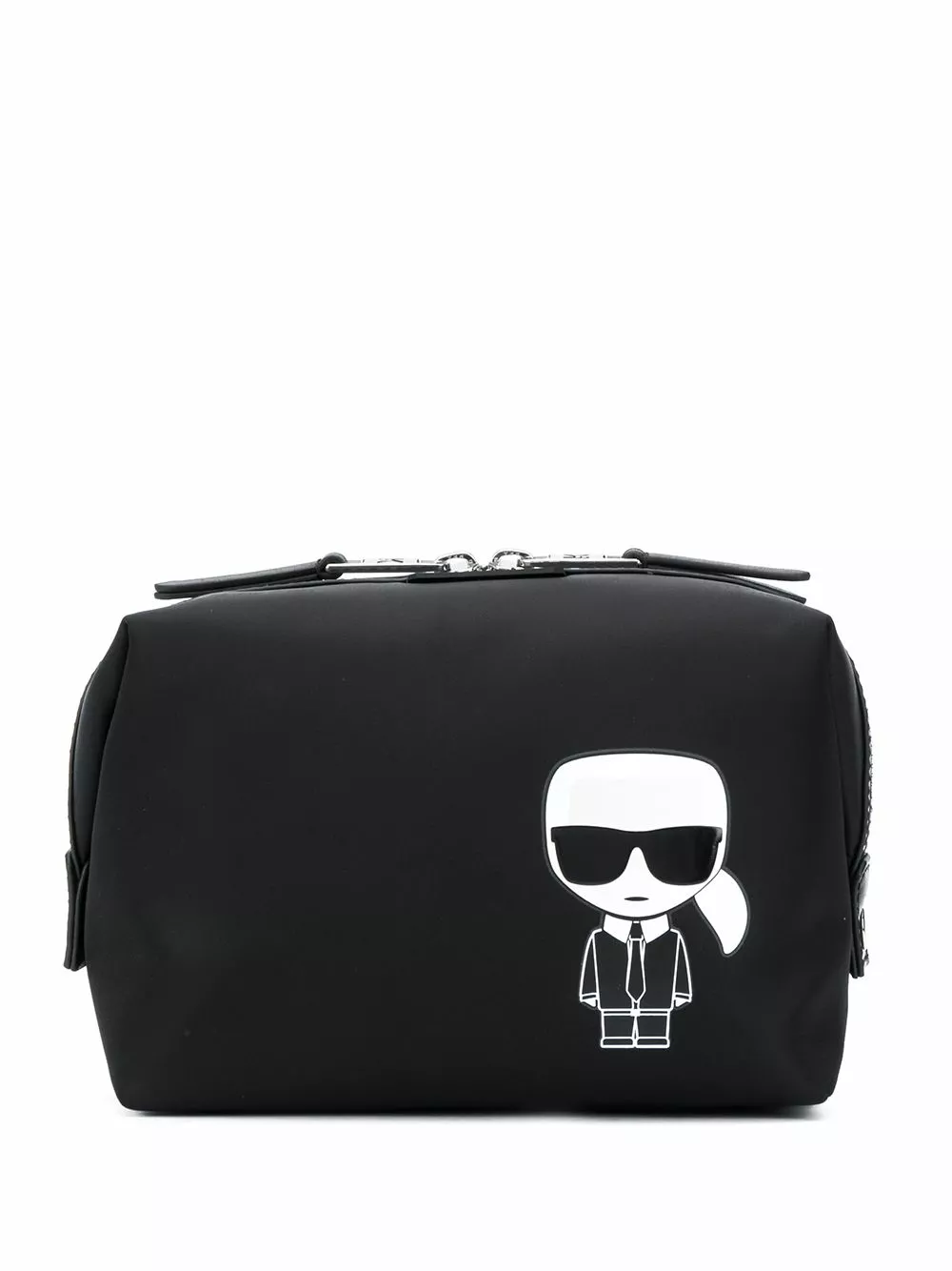 Black K/Ikonik belt bag from Karl Lagerfeld featuring a graphic print, a front embossed logo stamp, a rectangular body, a top zip fastening, a main internal compartment and an internal slip pocket.