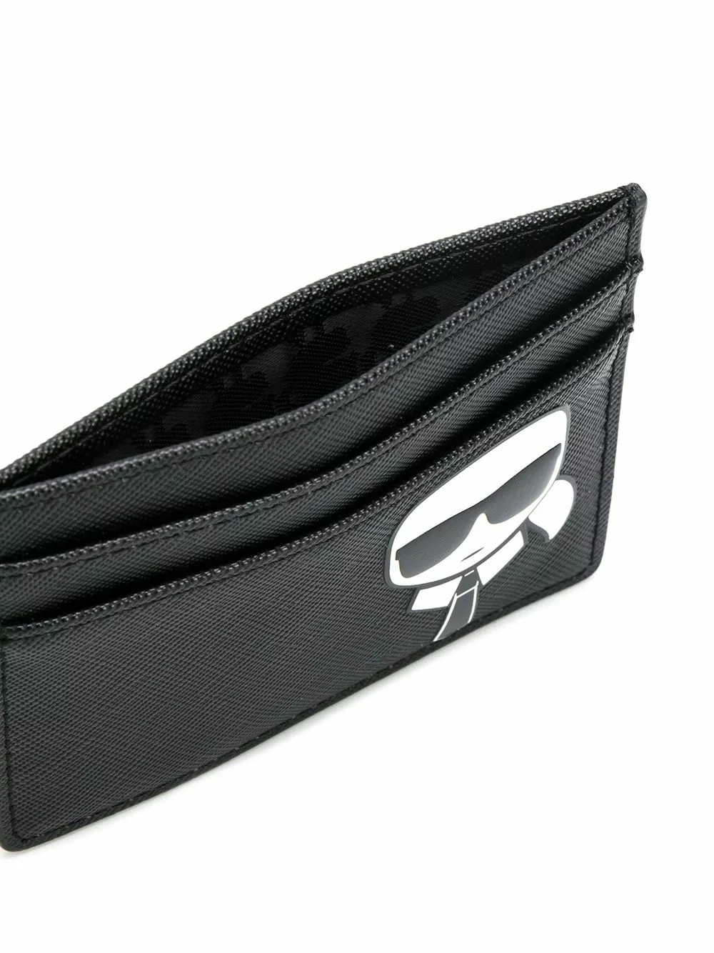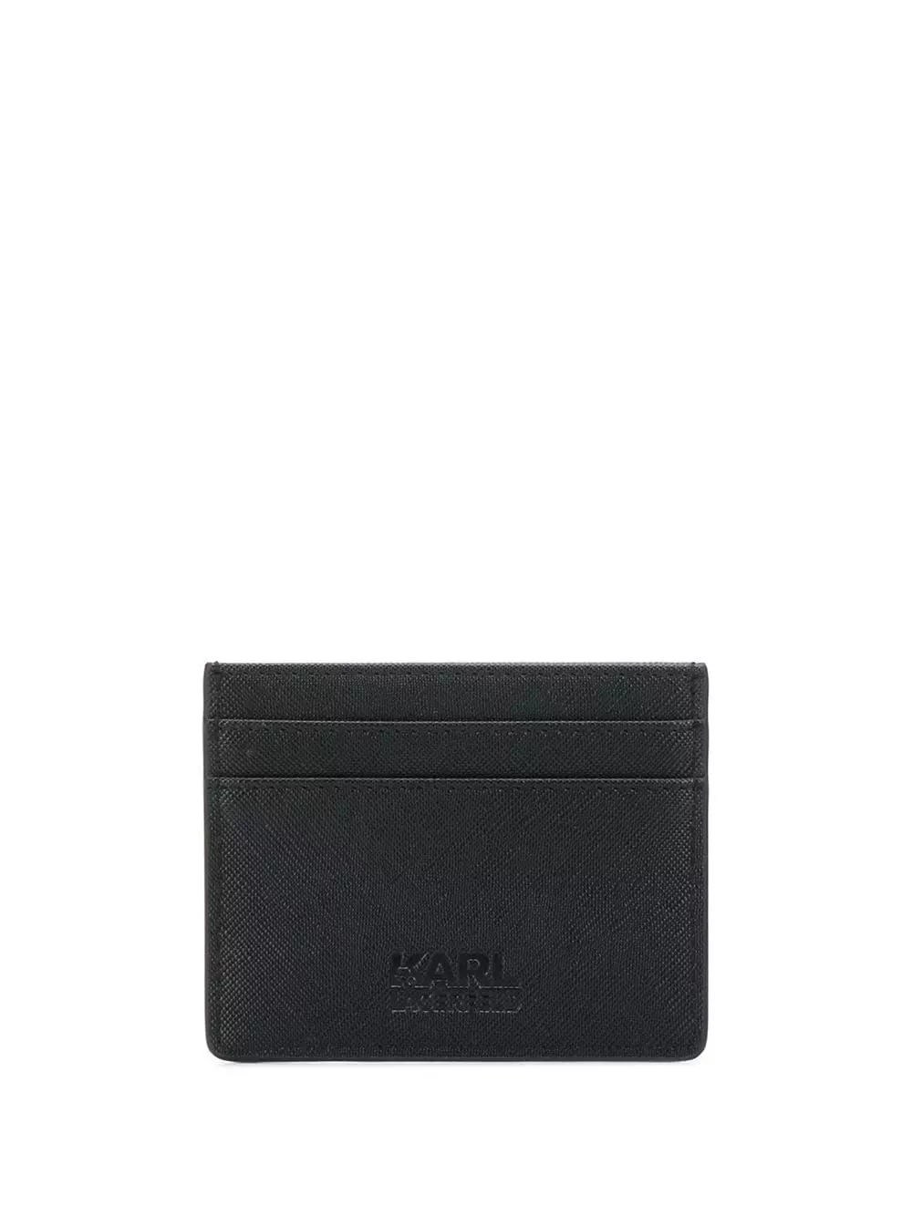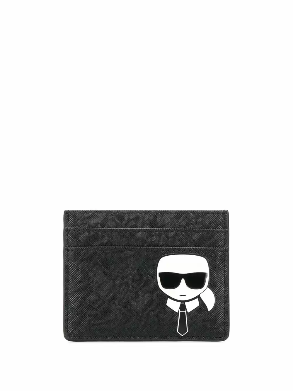 Black K/Ikonik cardholder from Karl Lagerfeld featuring four card slots, a billfold compartment, a back embossed logo stamp and Karl Lagerfeld’s cartoon character to the front.