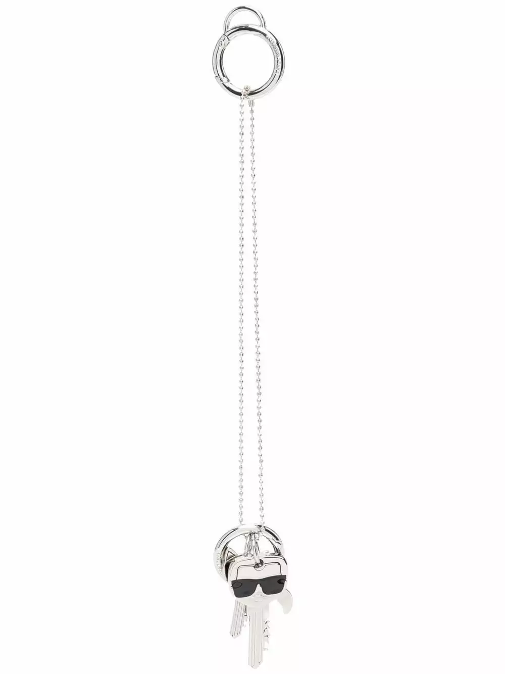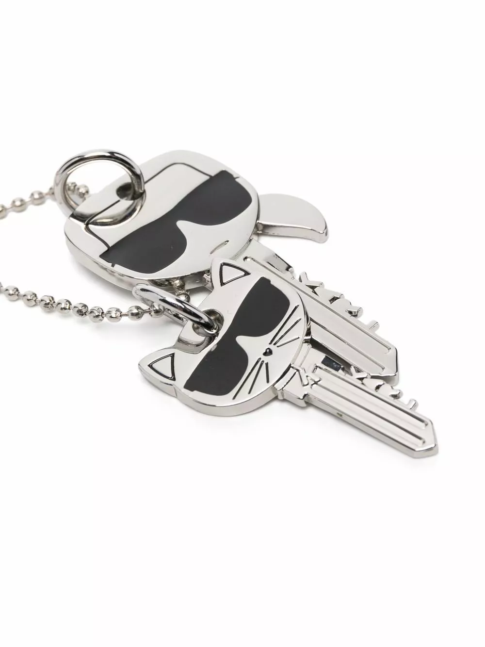 Two icons, Choupette and the Ikonik charm, detail this Karl Lagerfeld key chain. Motifs of the late designer and his beloved feline are etched into each key.