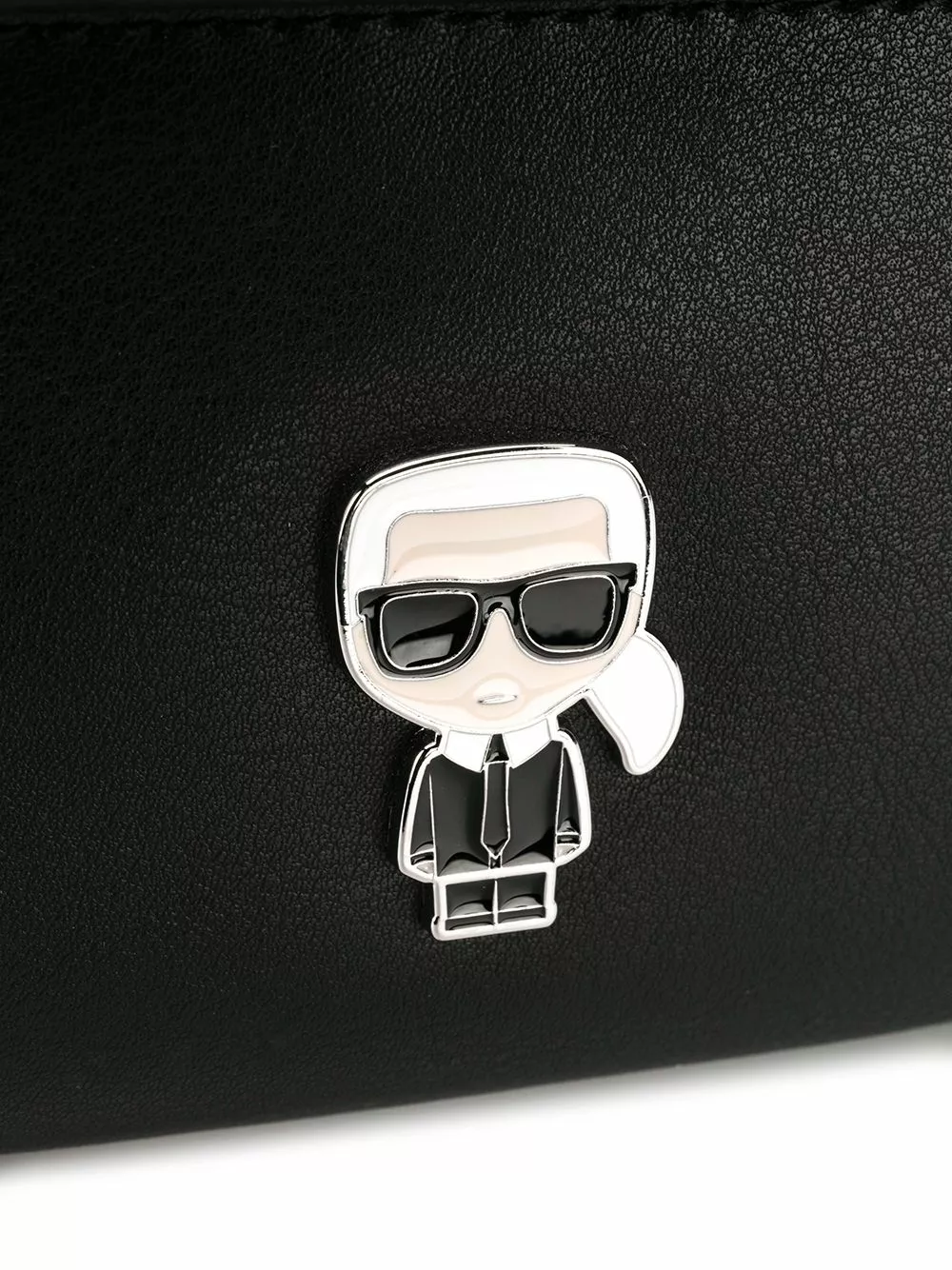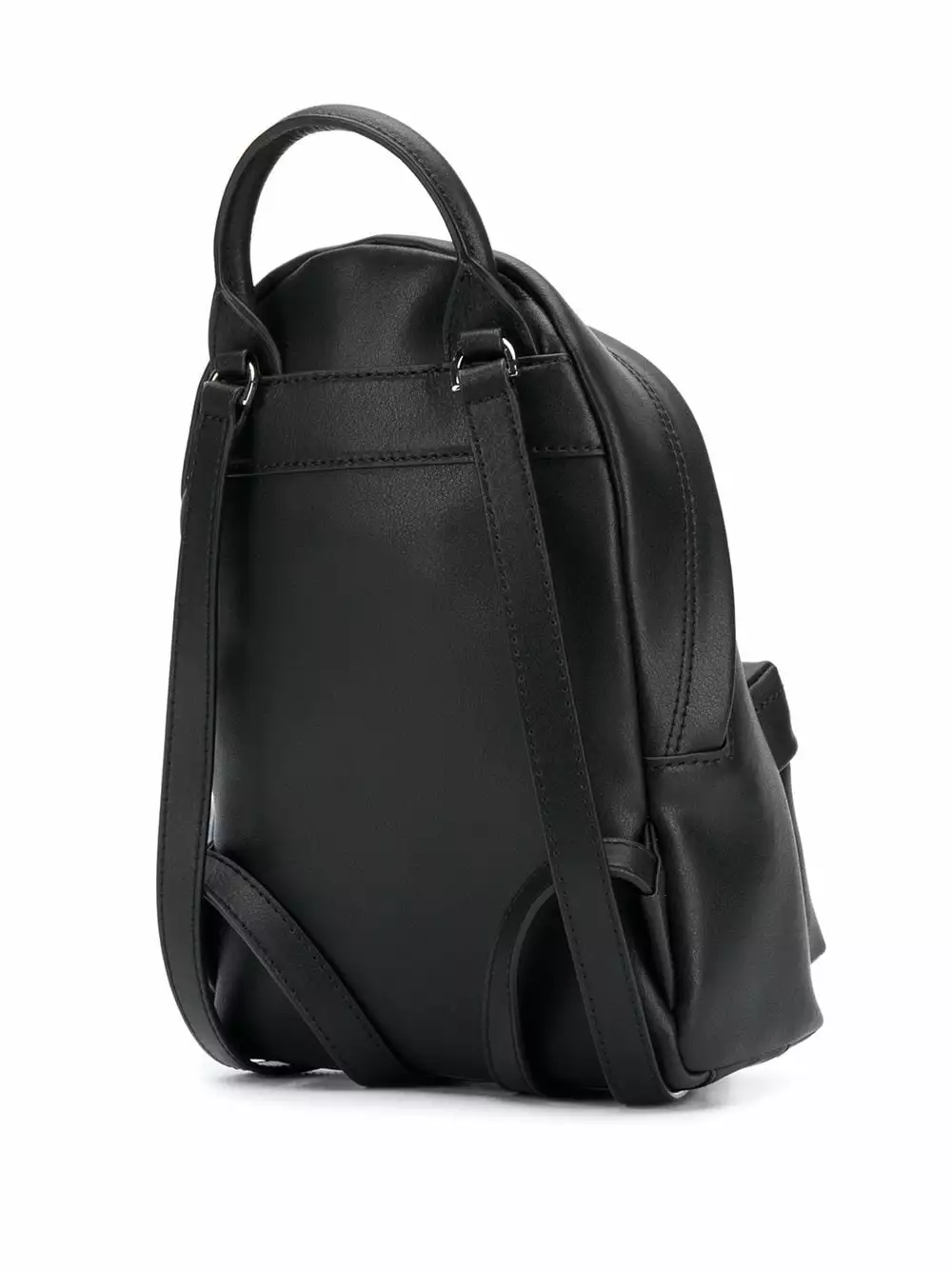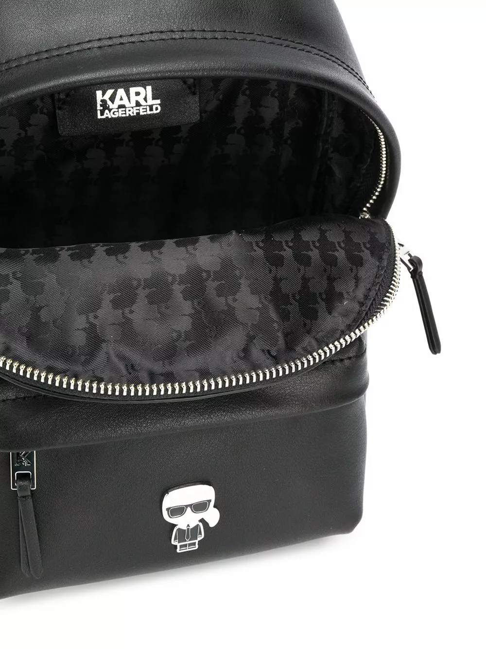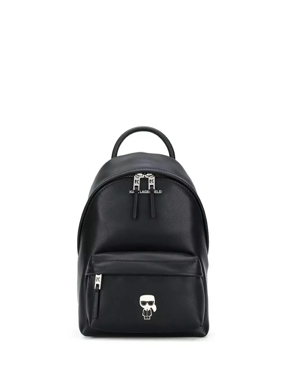 Black leather K/Ikonik metal pin backpack from Karl Lagerfeld featuring a front logo plaque, silver-tone hardware, a round top handle, adjustable shoulder straps, a top zip fastening, a front zip pocket, a logo printed lining and a main internal compartment.