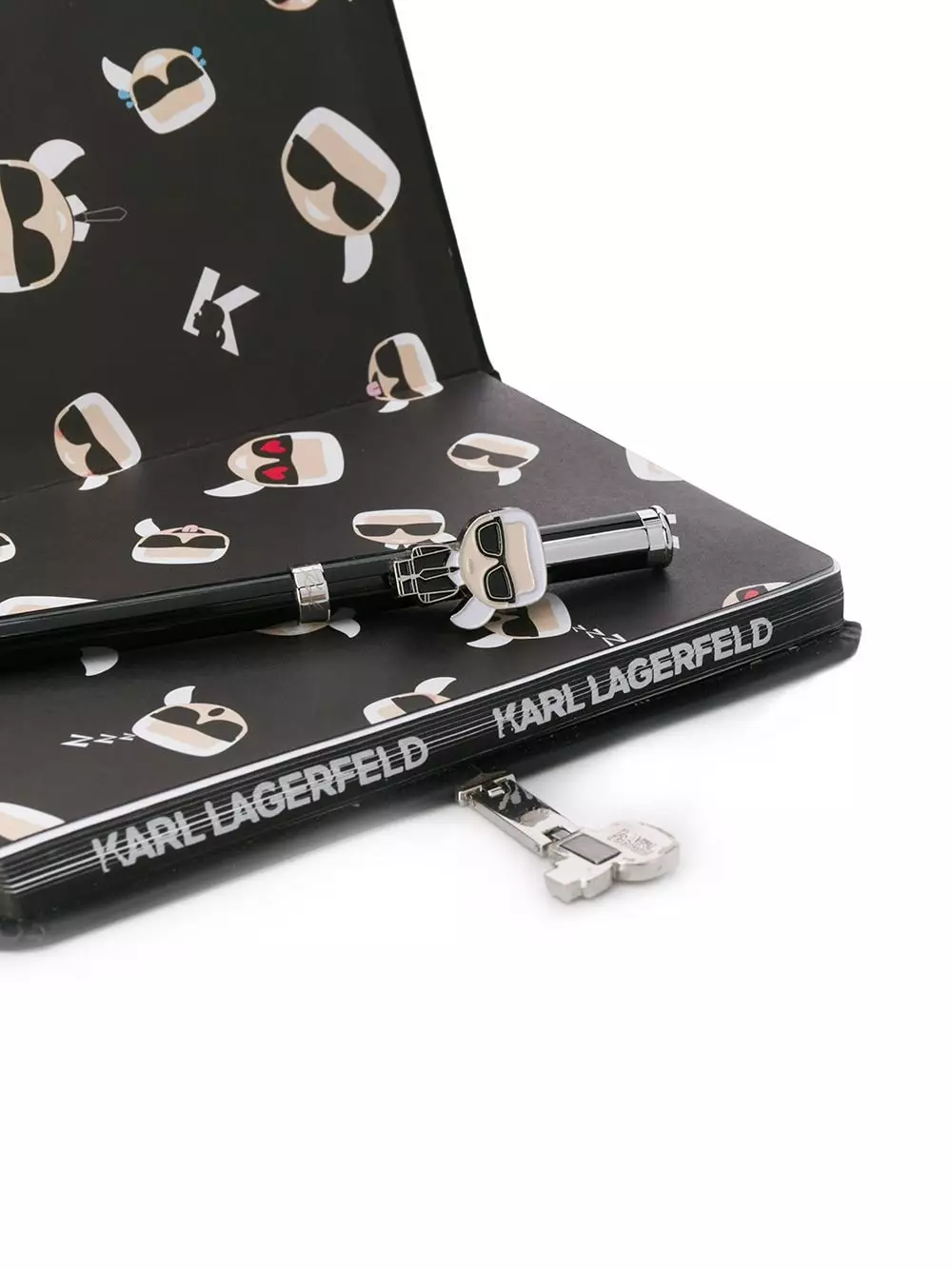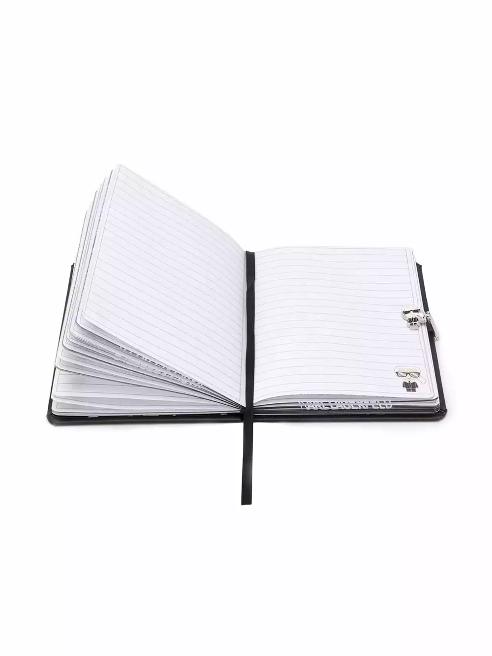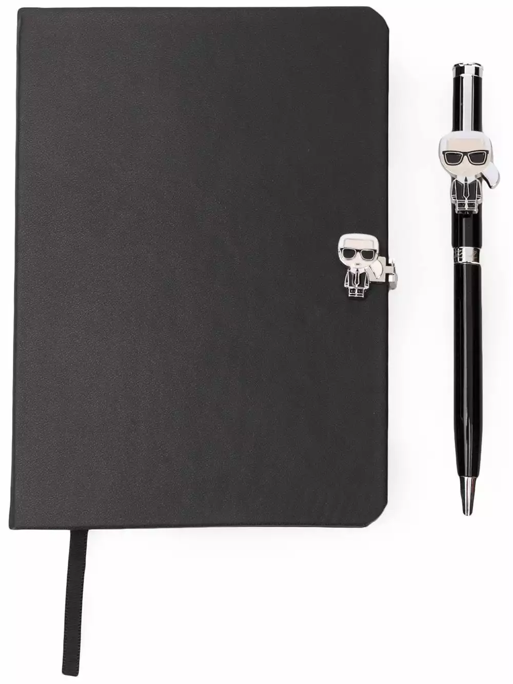 Black K/Ikonik Notebook/Pen Giftset from Karl Lagerfeld featuring a Karl Lagerfield clasp and pen, a logo to the back and branded lined paper.