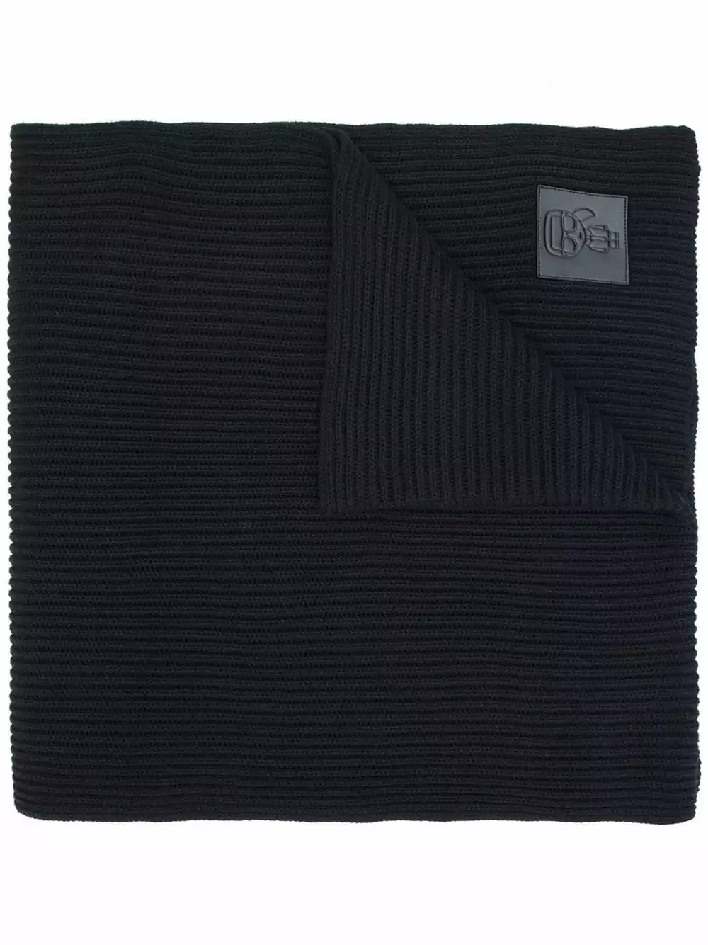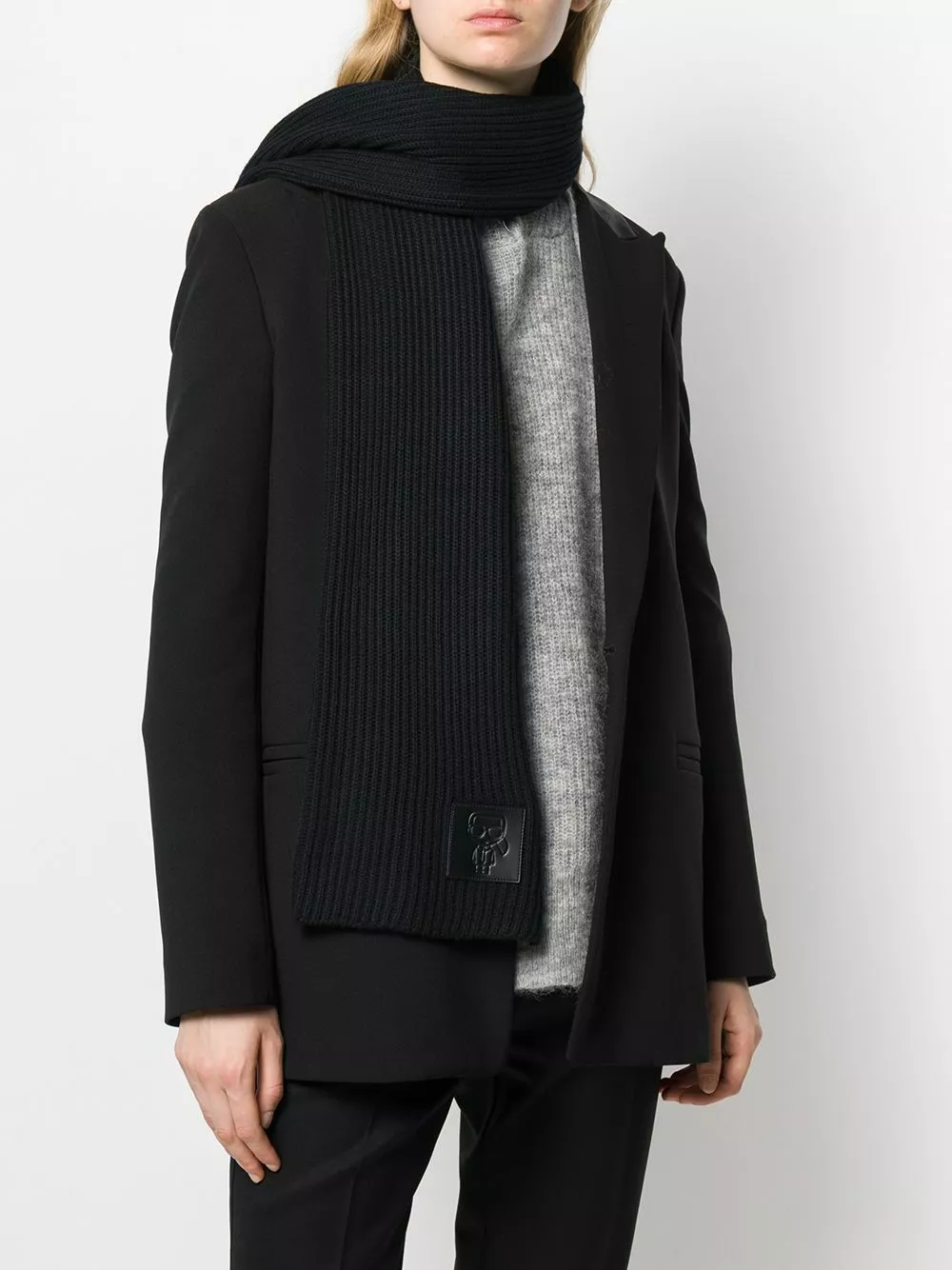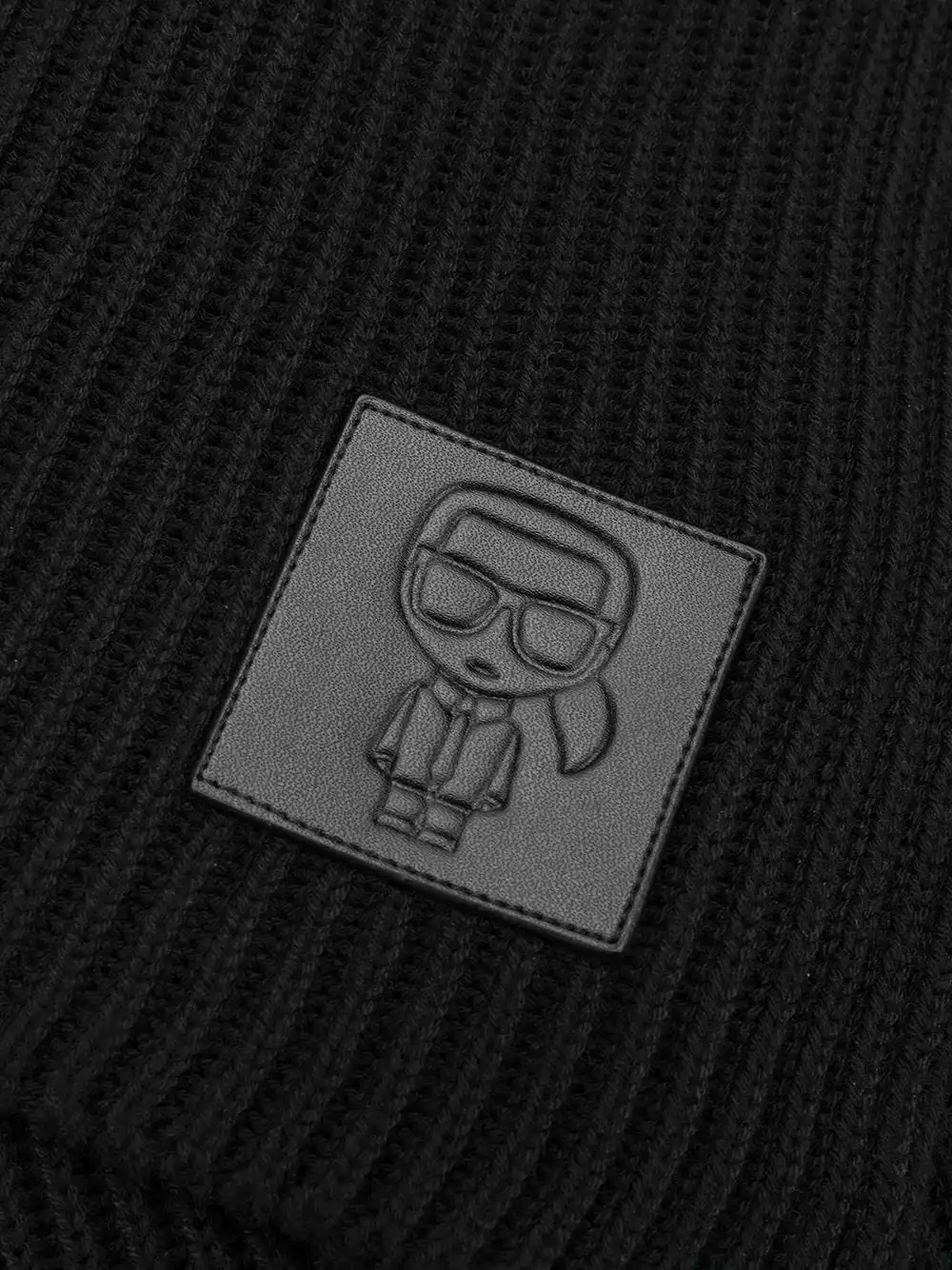 Black cashmere-blend K/Ikonik patch scarf from Karl Lagerfeld featuring a rectangular body, a ribbed knit and a front logo patch.