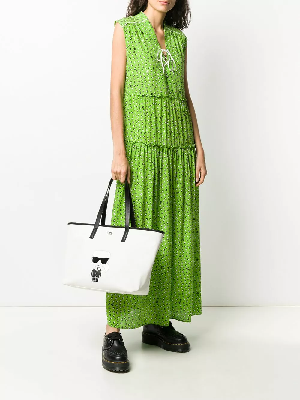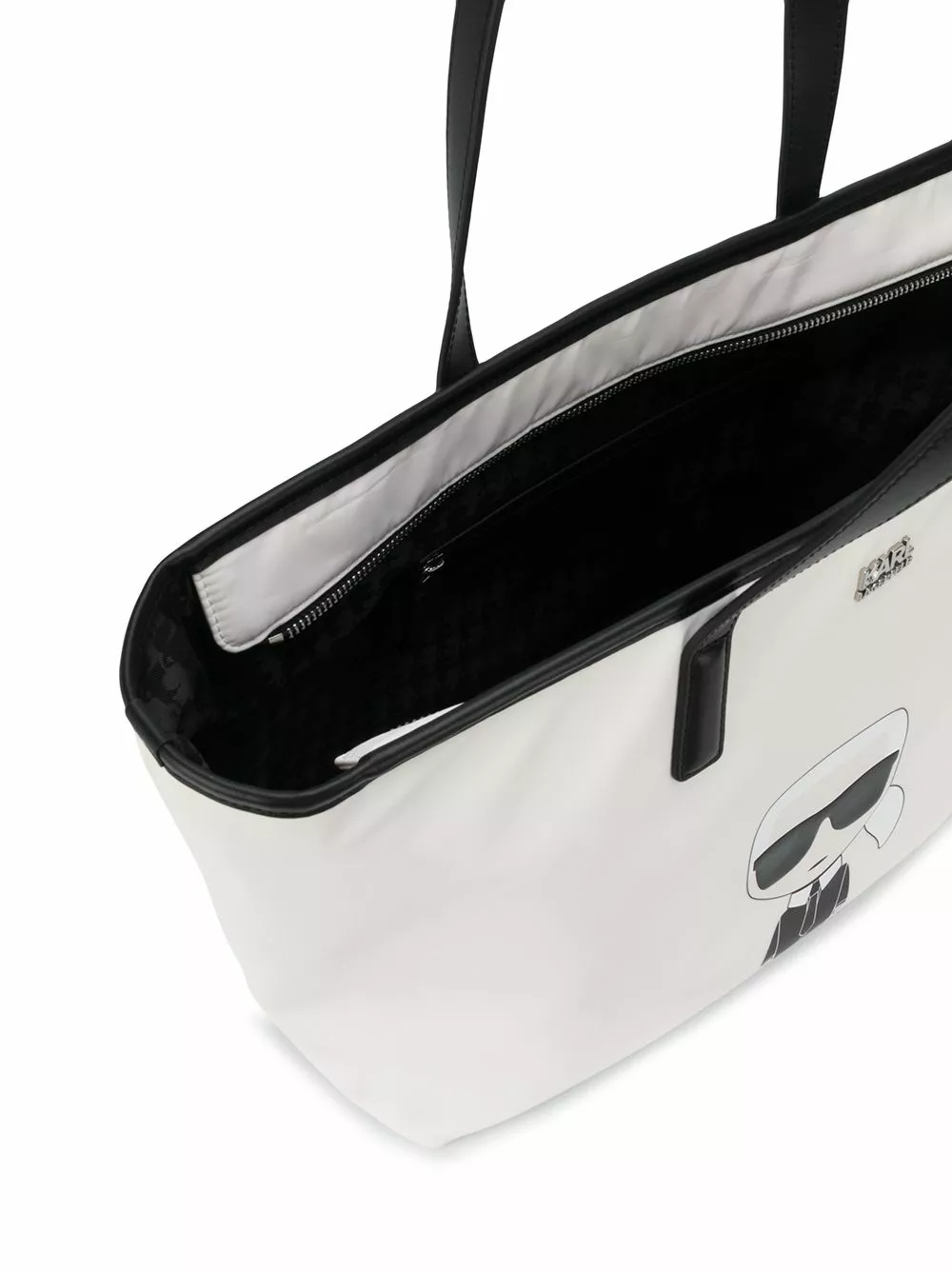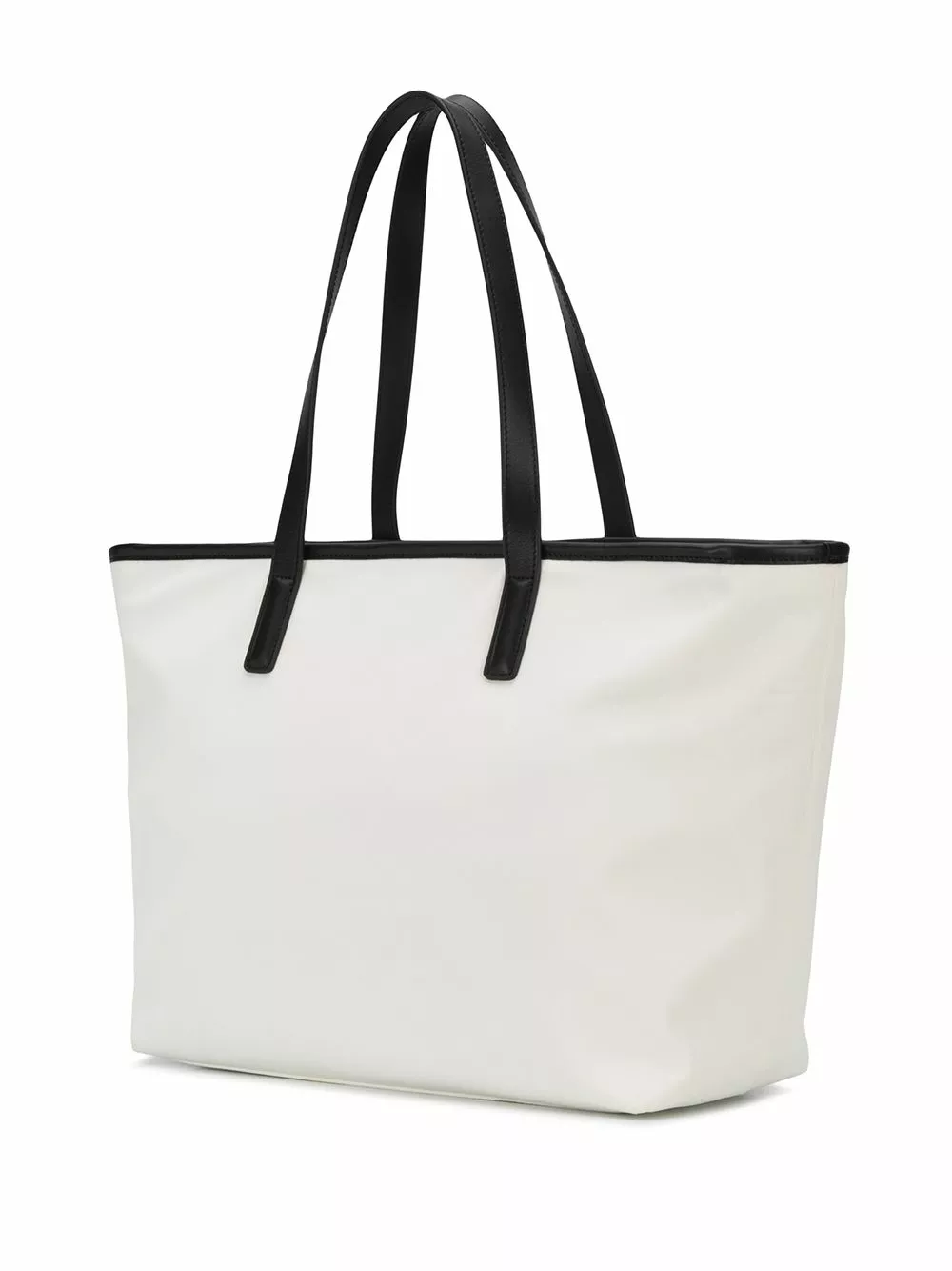 White K/Ikonik tote from Karl Lagerfeld featuring top handles, a contrast piped trim, a front logo plaque, a print to the front, a top zip fastening, an internal zipped pocket and a logo printed lining.