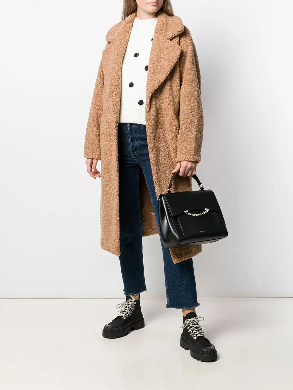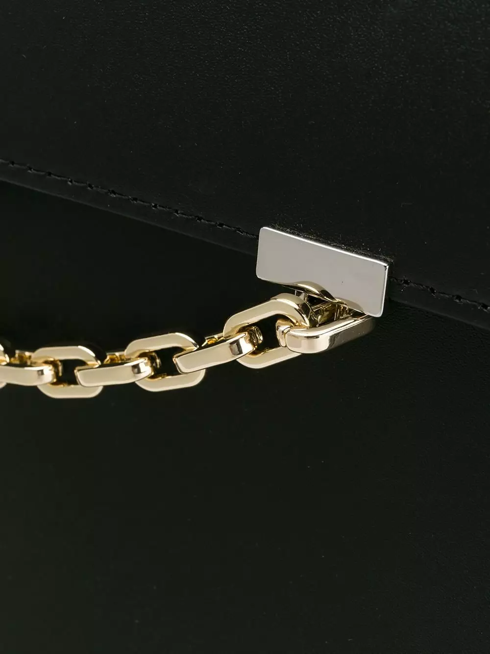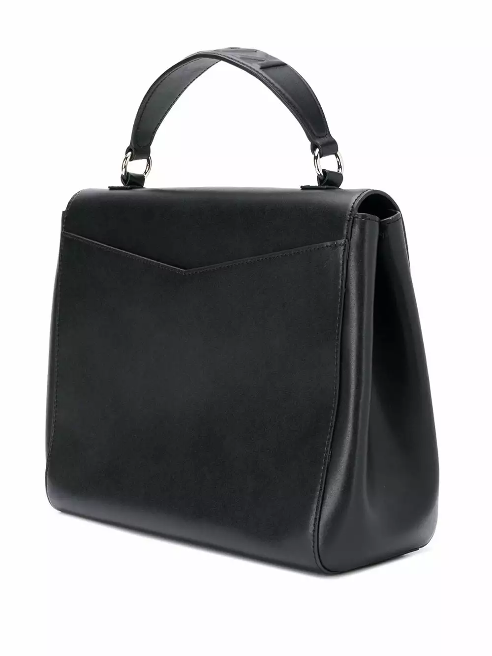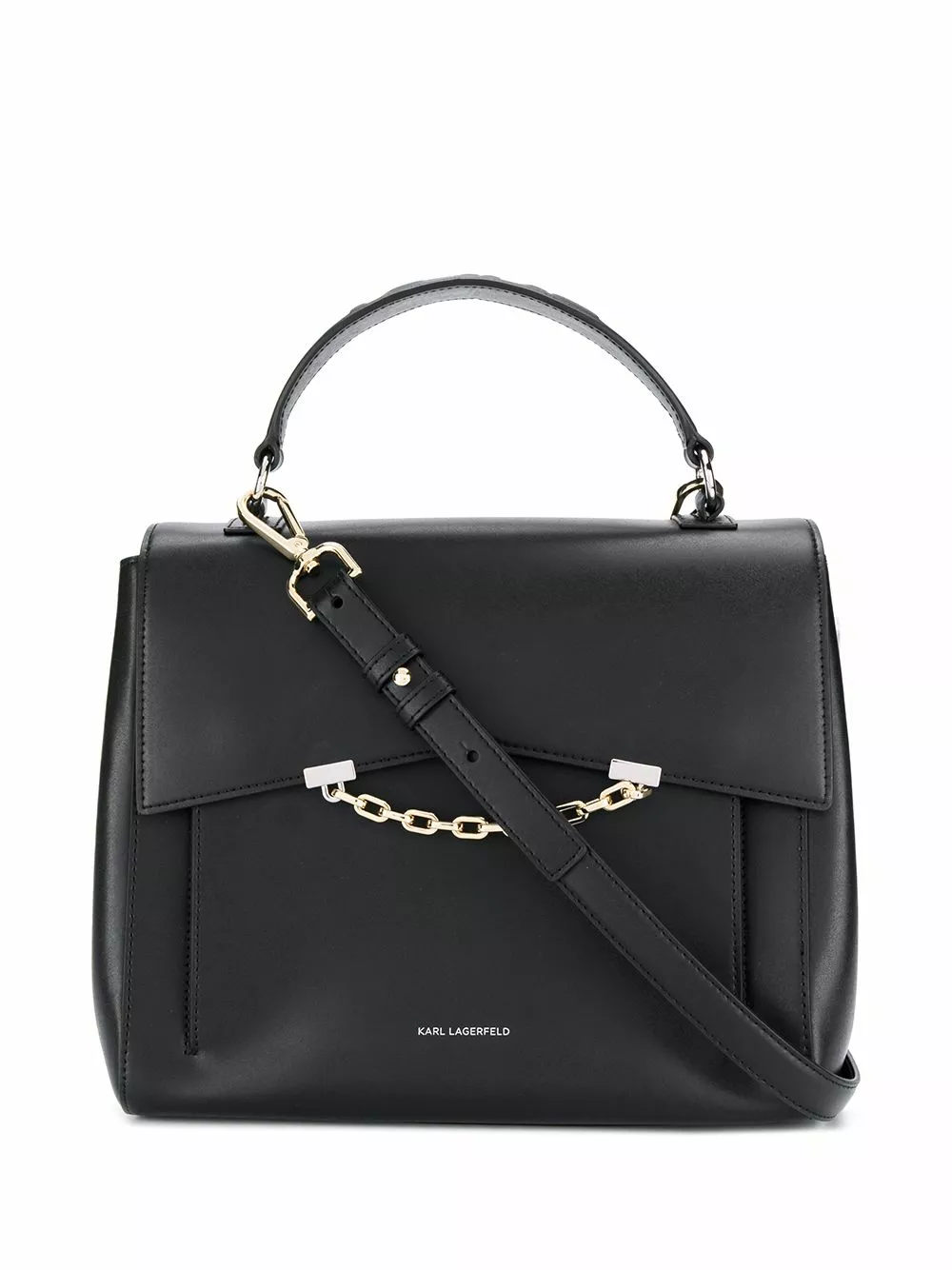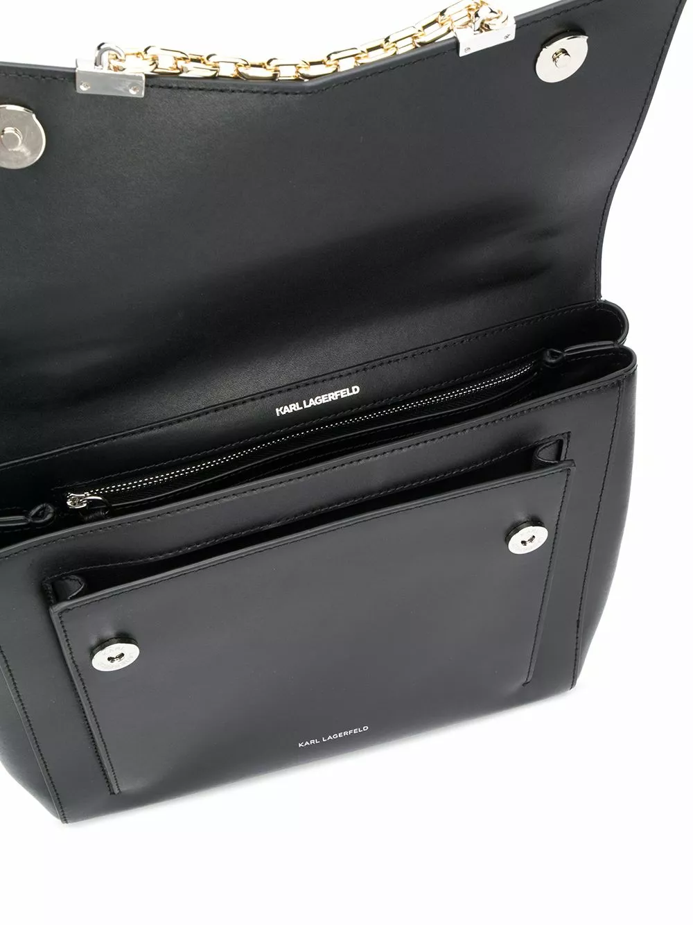Black leather K/Karl Seven tote bag from Karl Lagerfeld featuring gold-tone hardware, a gold-tone chain trim, a front centre logo stamp, a round top handle, a detachable shoulder strap, a foldover top with magnetic closure, an internal logo stamp, an internal slip pocket and an internal zipped pocket.