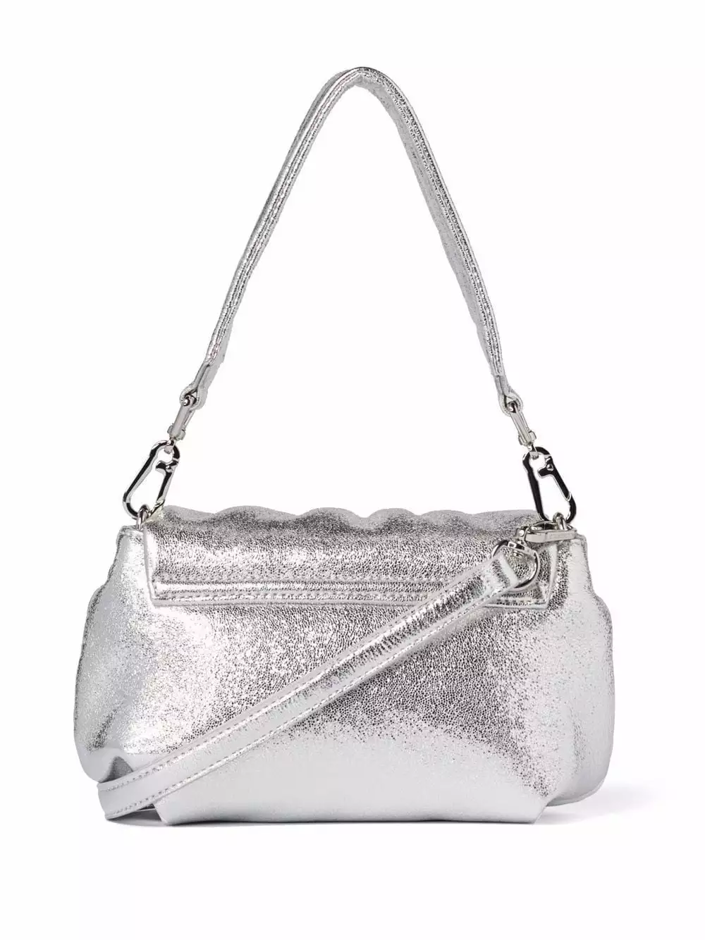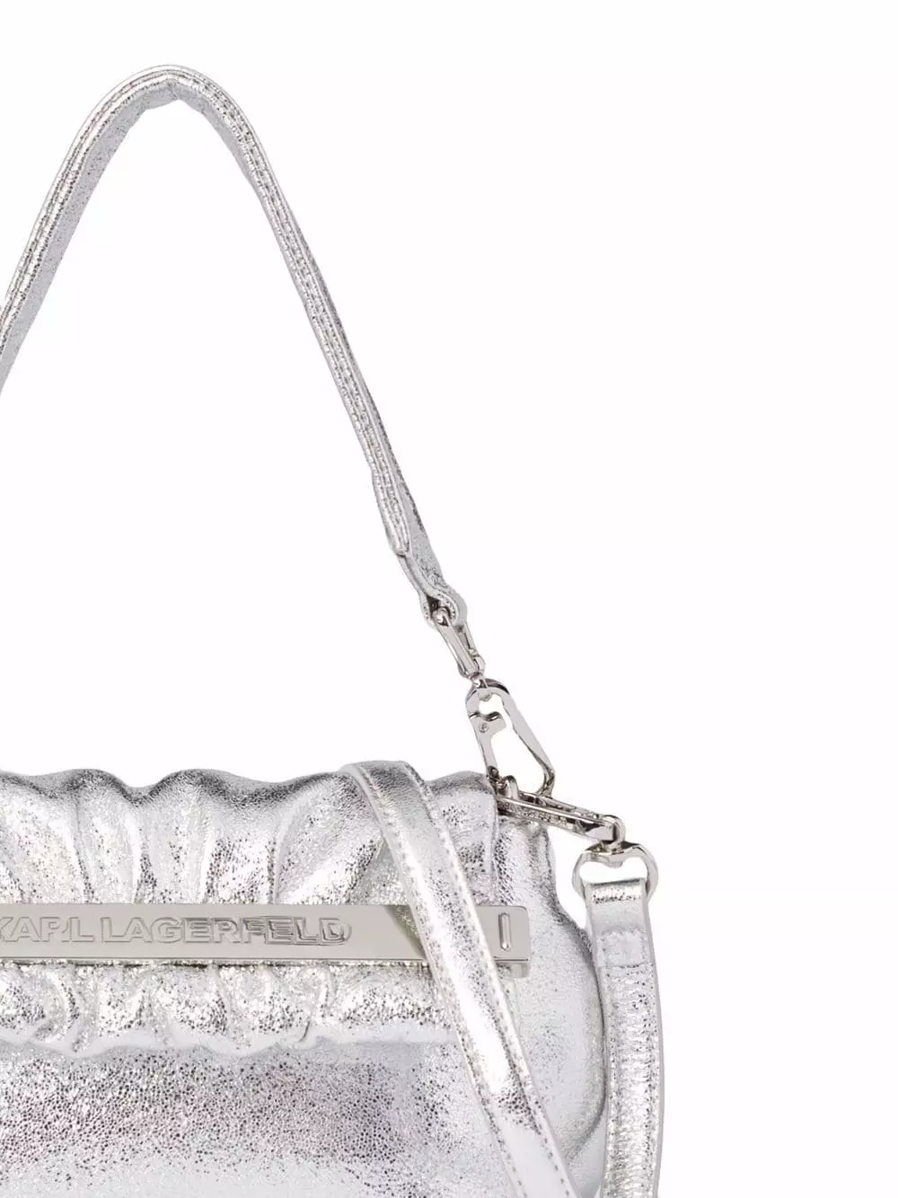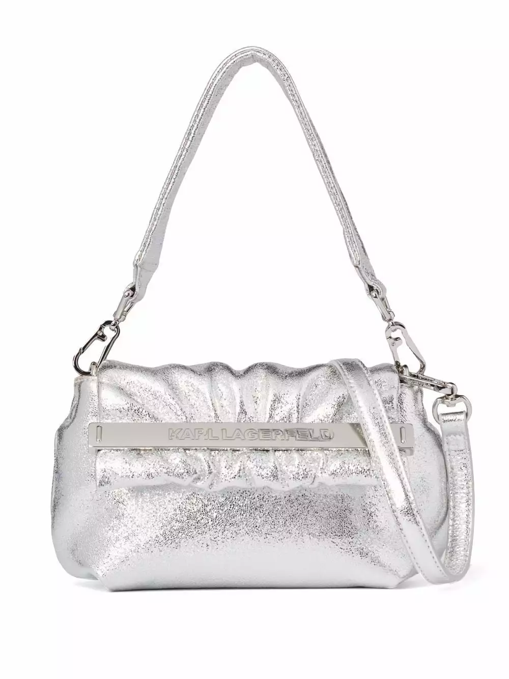 For SS22, Karl Lagerfeld adds a new signature bag to its accessories collection. Presented in a silver tone with a metallic finish, this compact piece is distinguished by the silver-tone logo-engraved plaque seen on the front.
