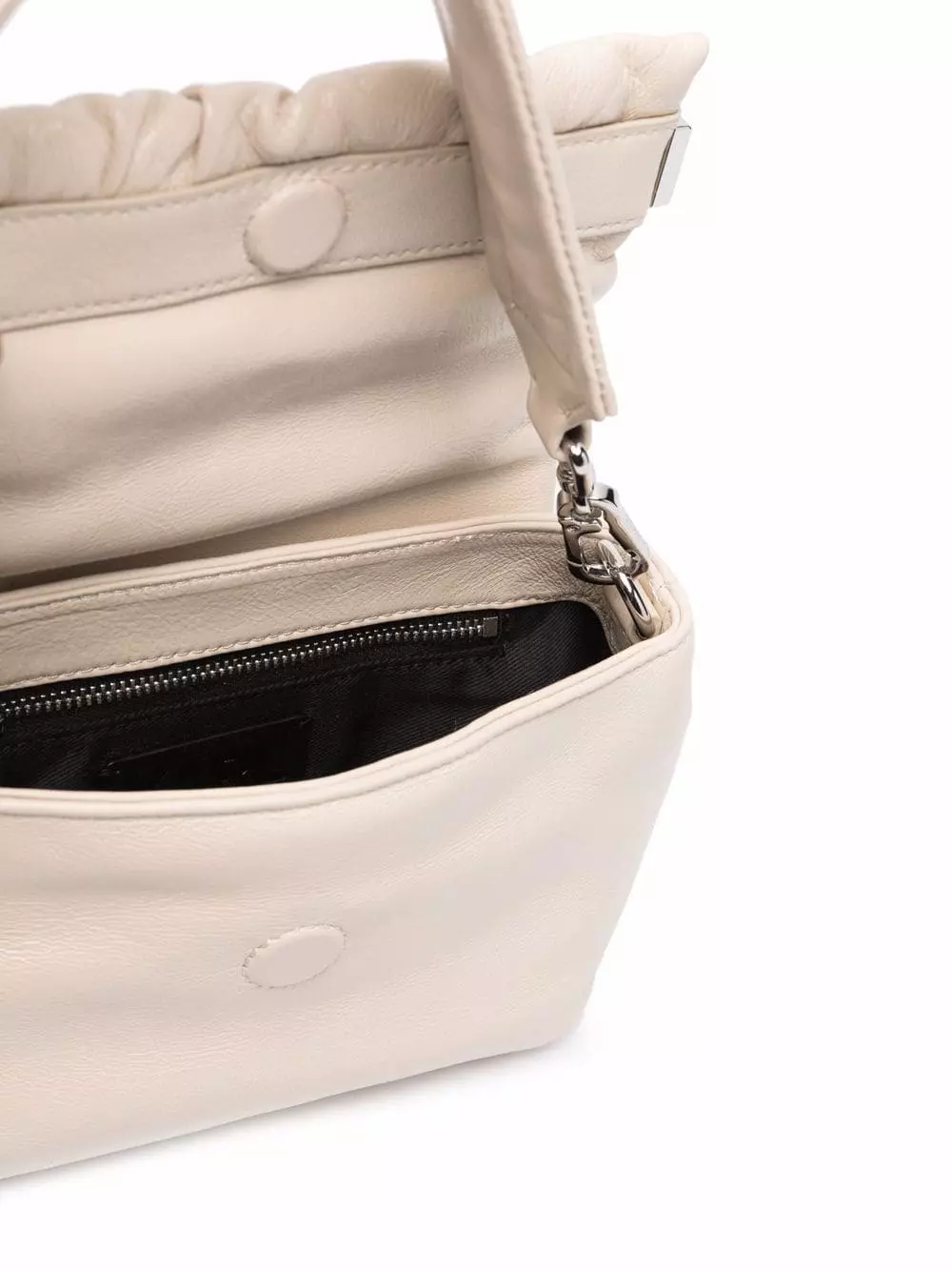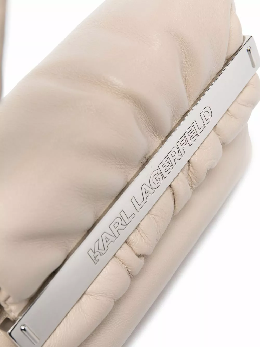 For SS22, Karl Lagerfeld adds a new signature bag to its accessories collection. Presented in an off-white hue, this compact piece is distinguished by the silver-tone logo-engraved plaque seen on the front.