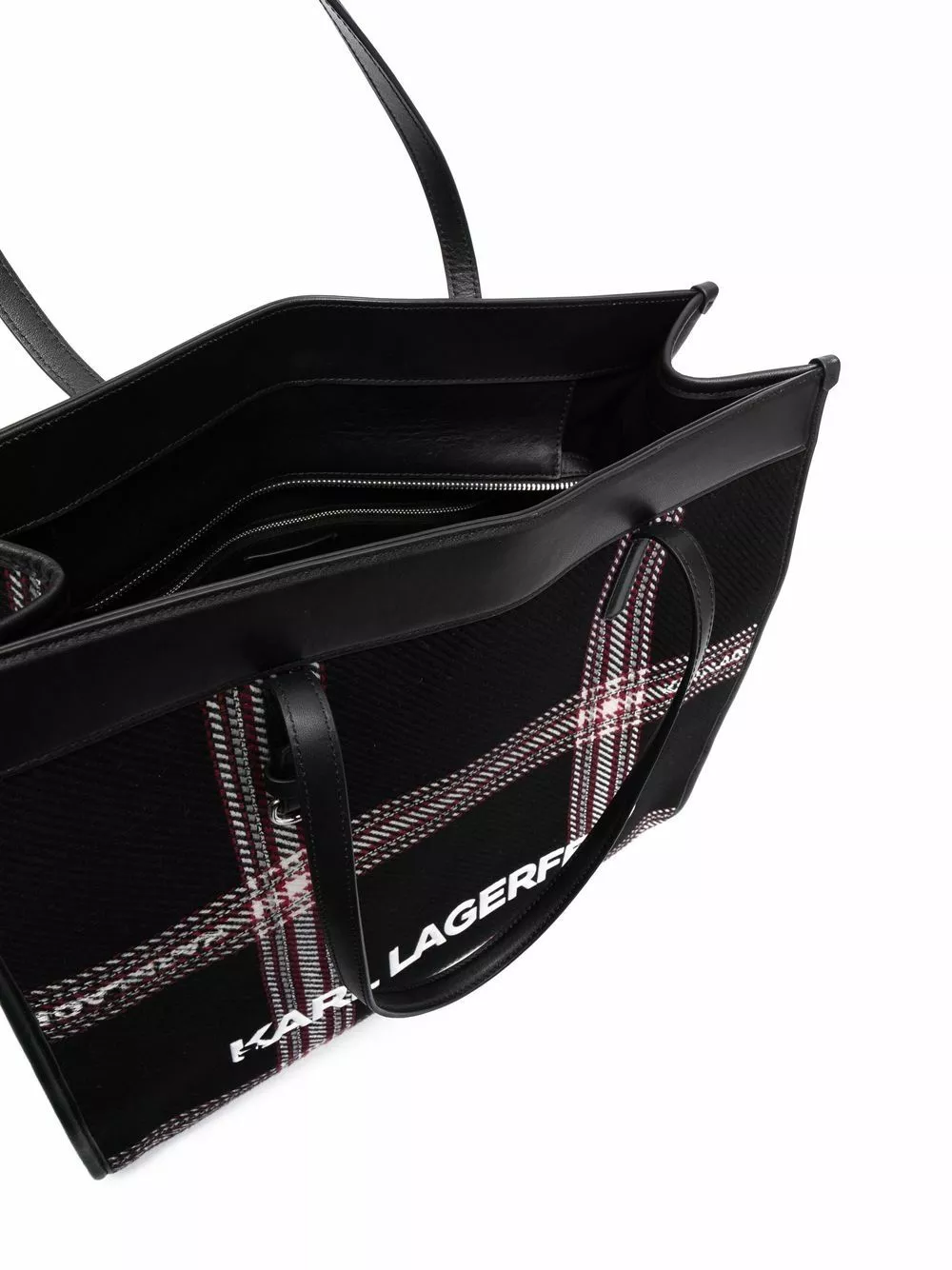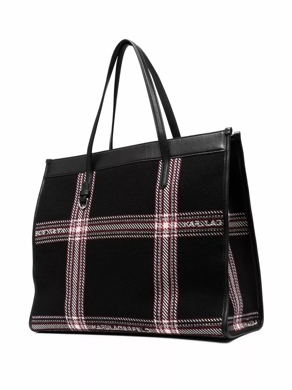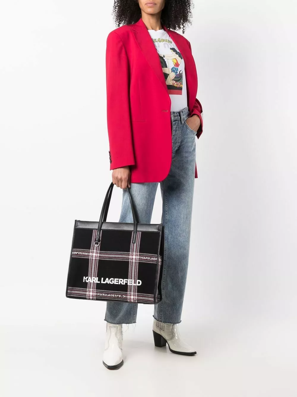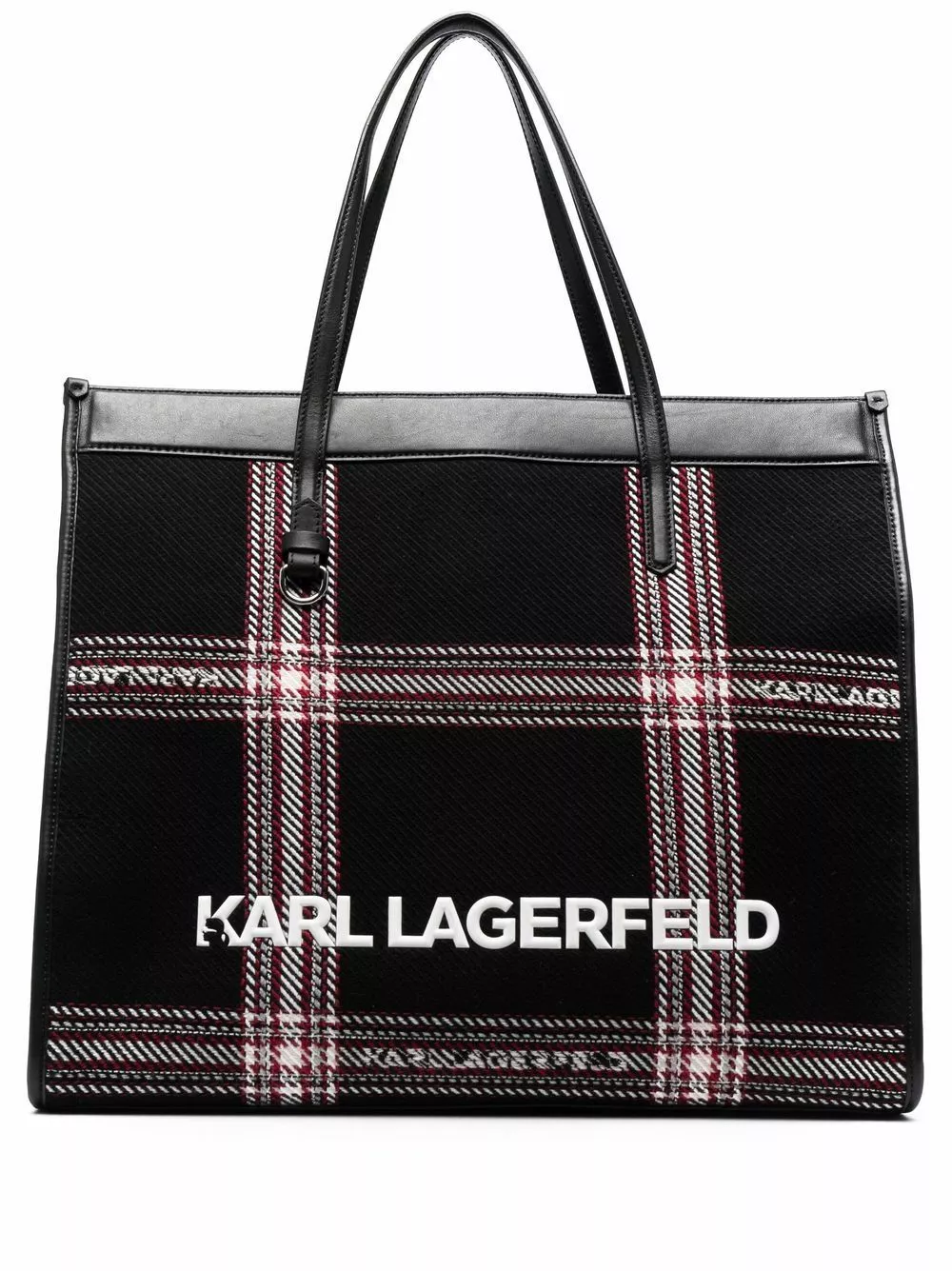 Karl Lagerfeld will remain one of the most emblematic icon of the luxury fashion industry. In a black construction, this K/Skuare check tote bag stands out not only for its check pattern all over but for the designer name printed on the front in white.Â