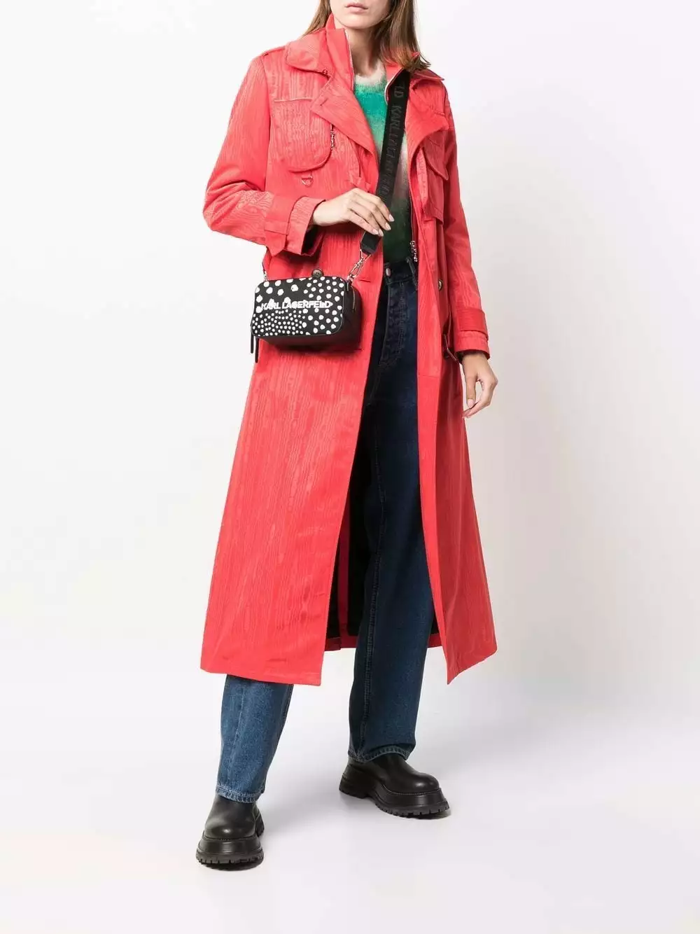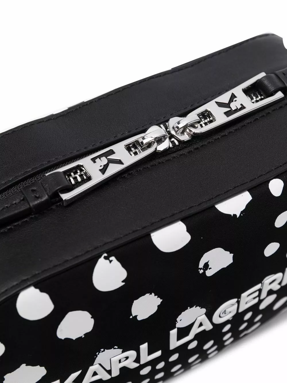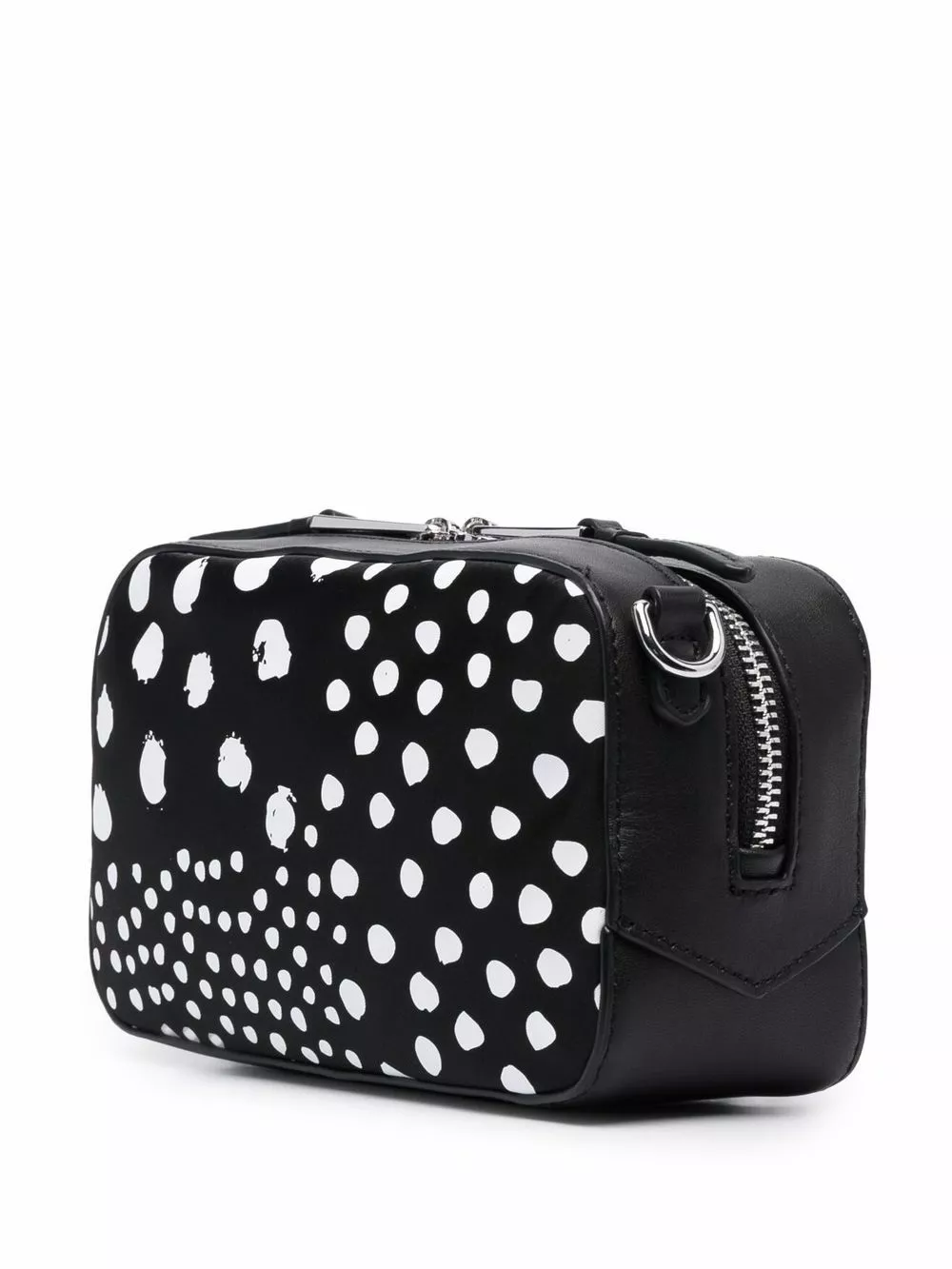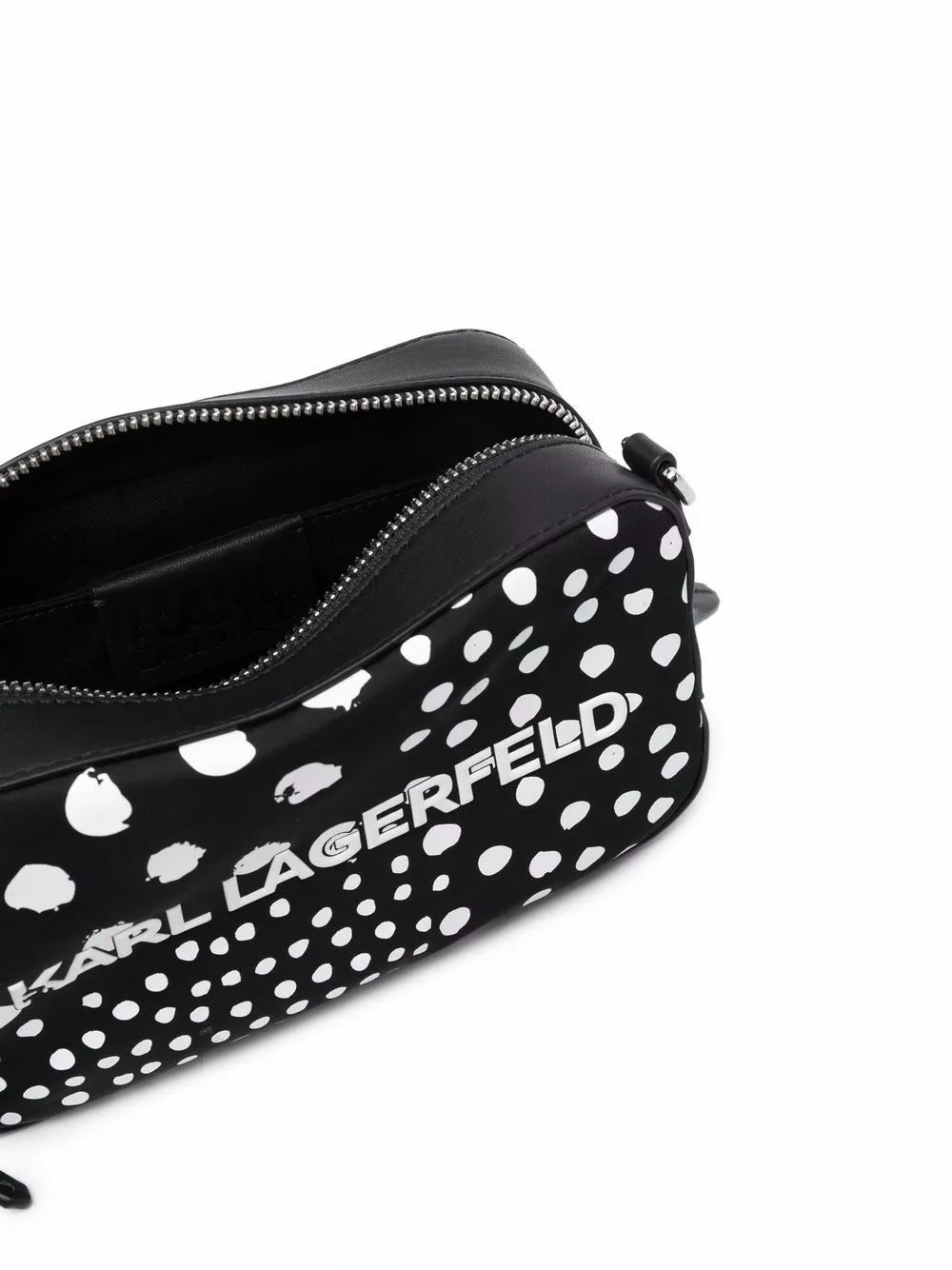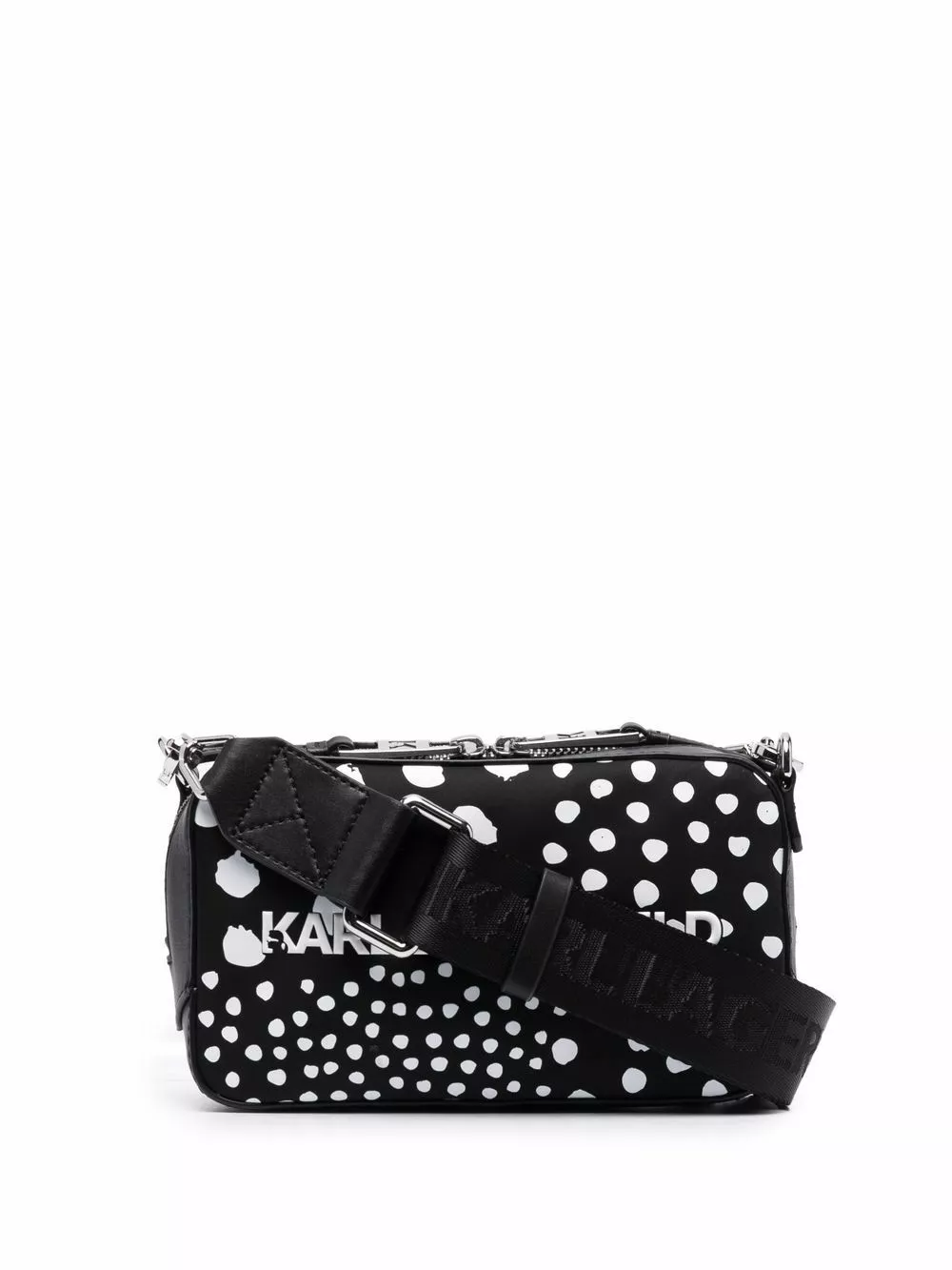 Karl Lagerfeld will remain one of the most emblematic icon of the luxury fashion industry. In a full-black construction, this K/Skuare camera bag stands out not only for its polka dot print all over but for the silver-tone plaque on the front with his name.