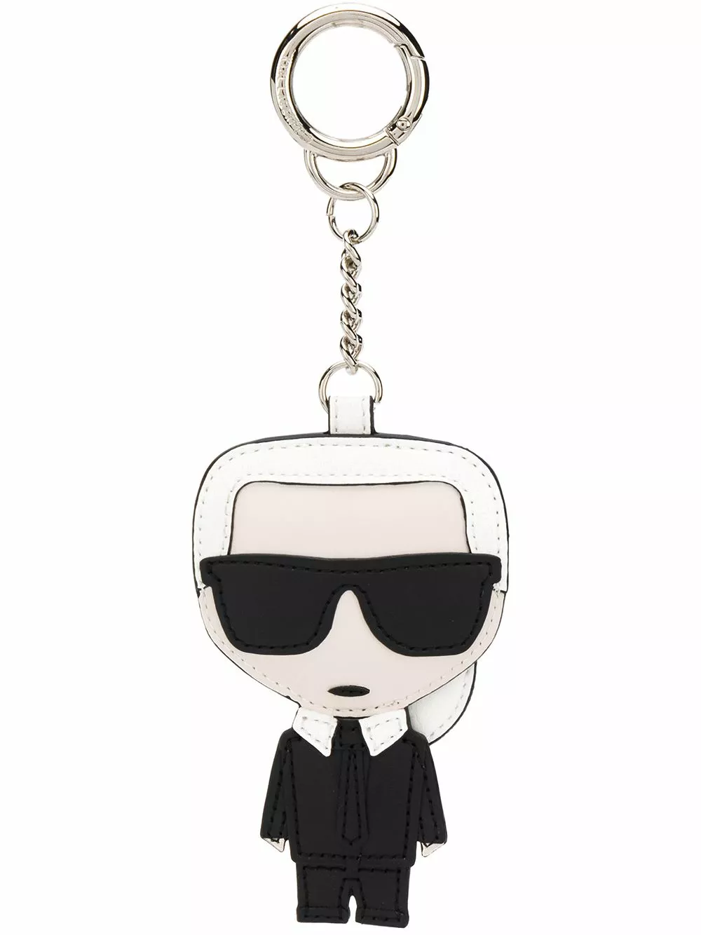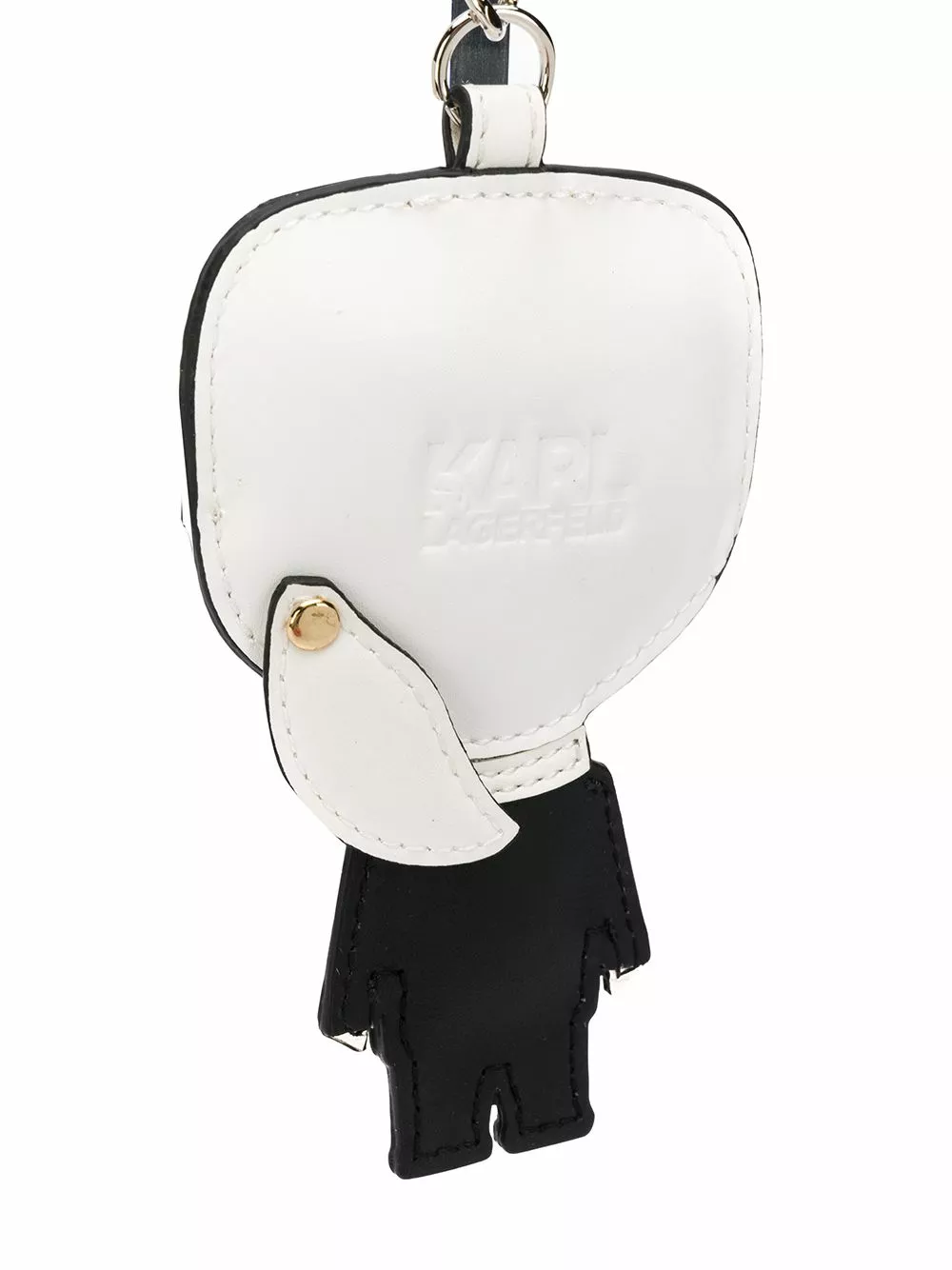 Black cotton and leather Karl embroidered keychain from Karl Lagerfeld featuring silver-tone hardware, a back embossed logo stamp, embroidered details and a clip fastening.