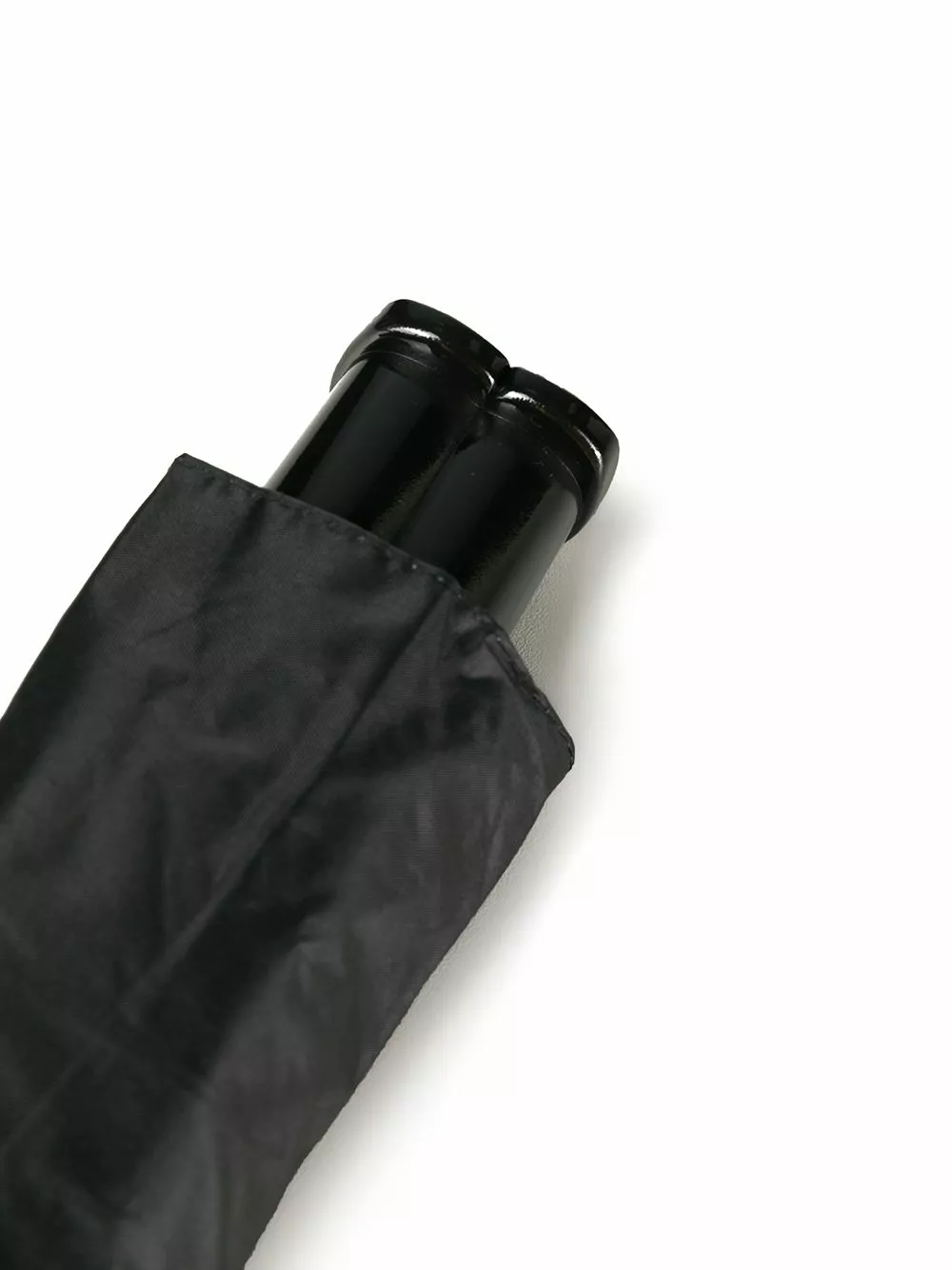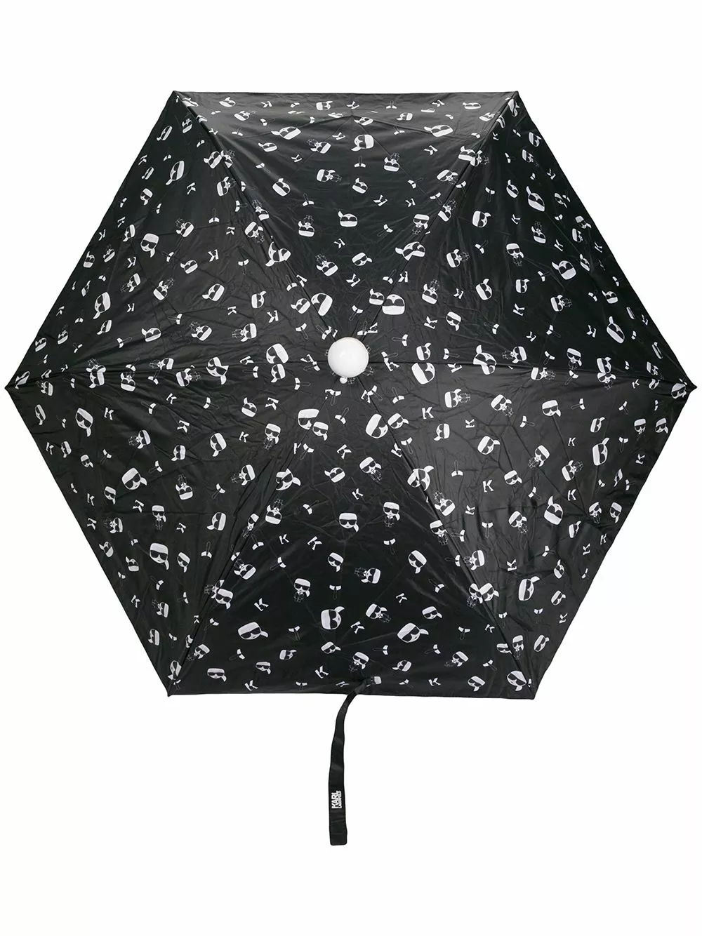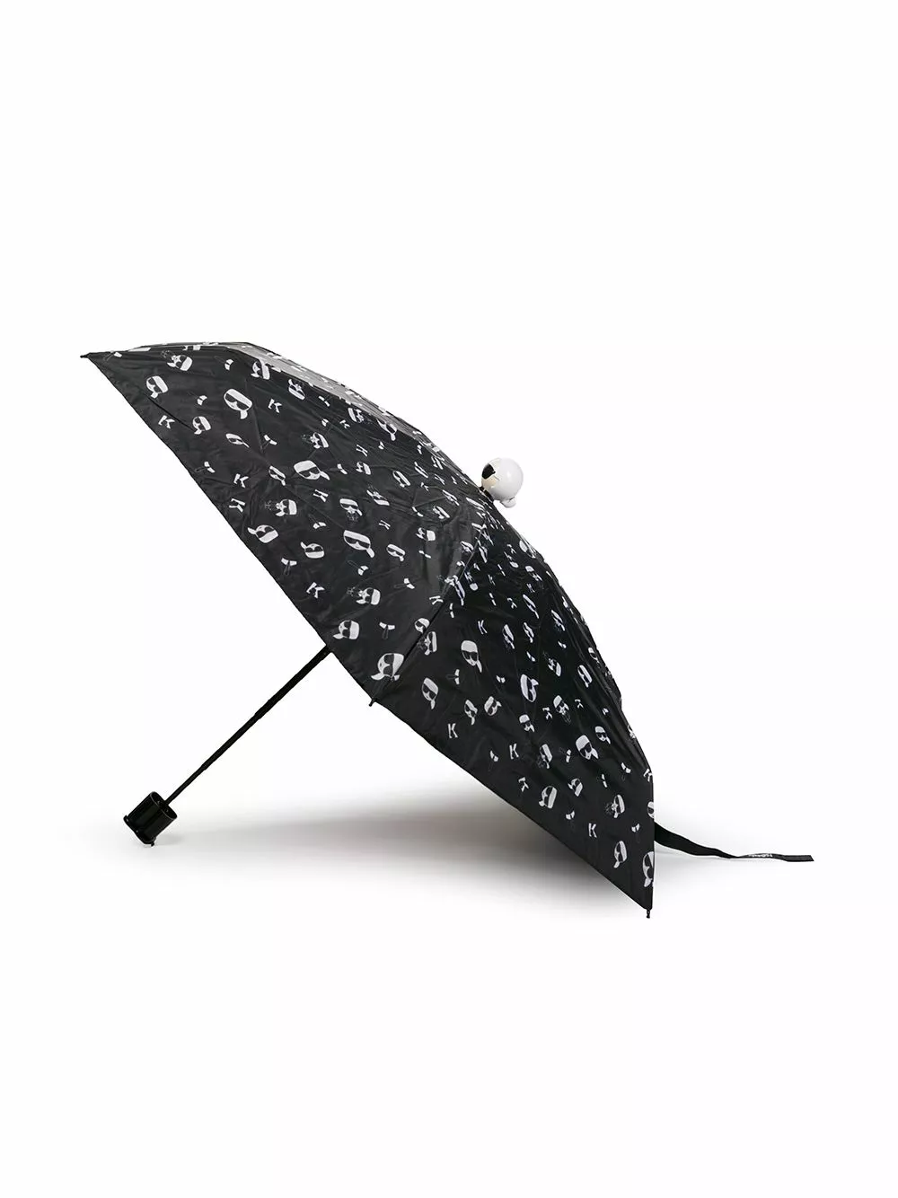 Black Karl motif folding umbrella from Karl Lagerfeld featuring an all-over print, a fold-over clasp and a straight handle.