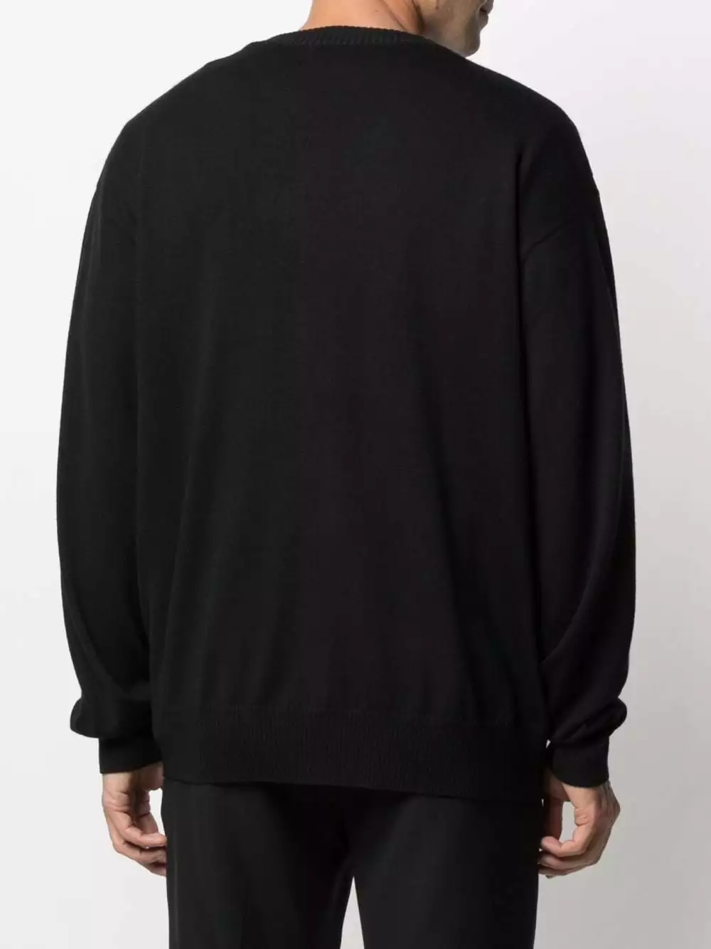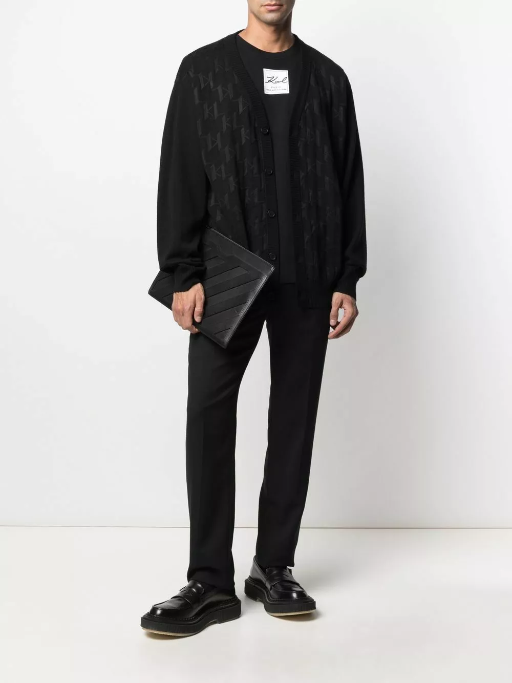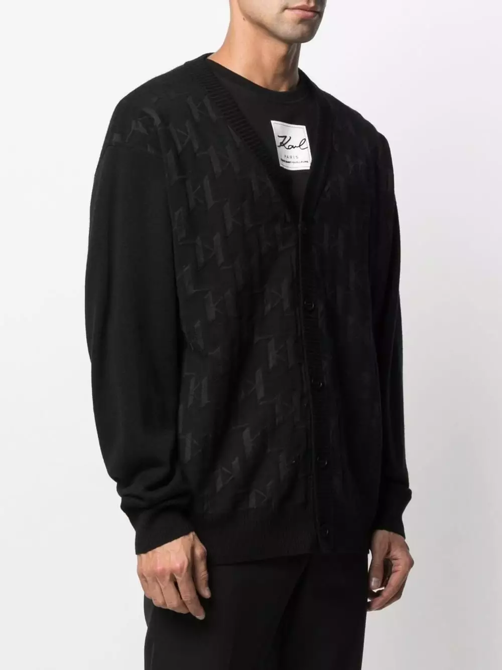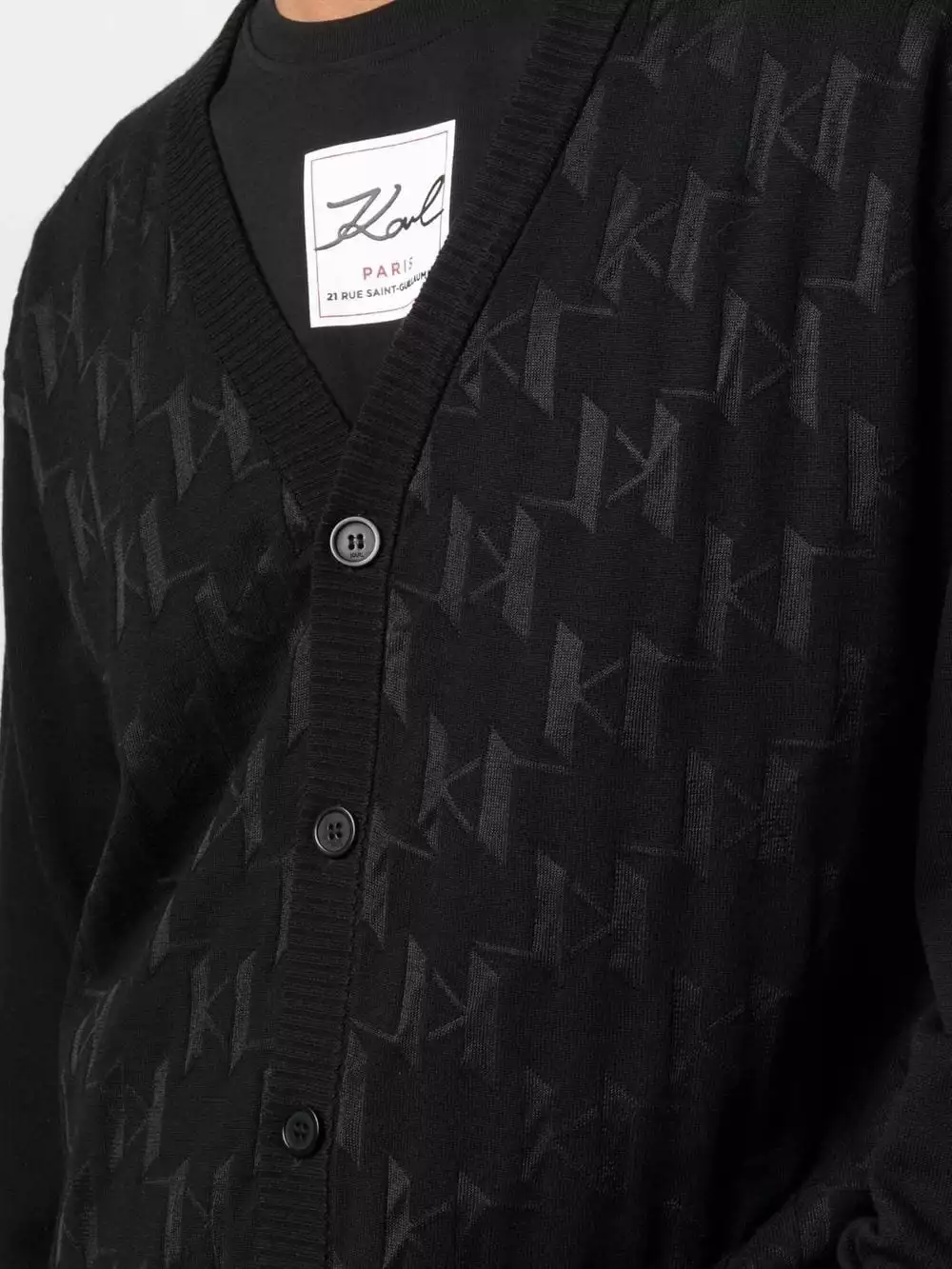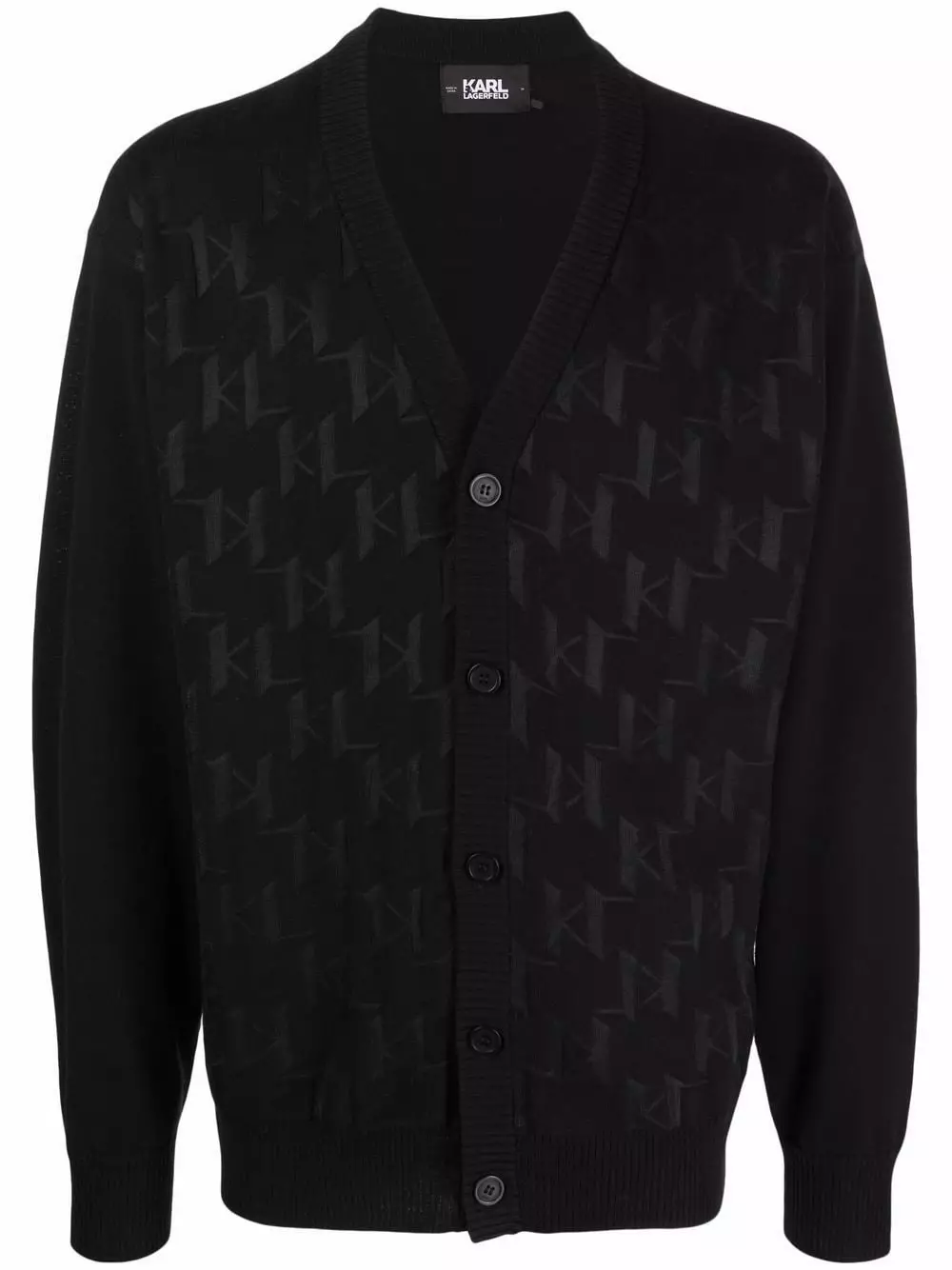 Black mohair KL monogram-detail cardigan from KARL LAGERFELD featuring matte monogram motif, ribbed detailing, plunging V-neck and button fastening.