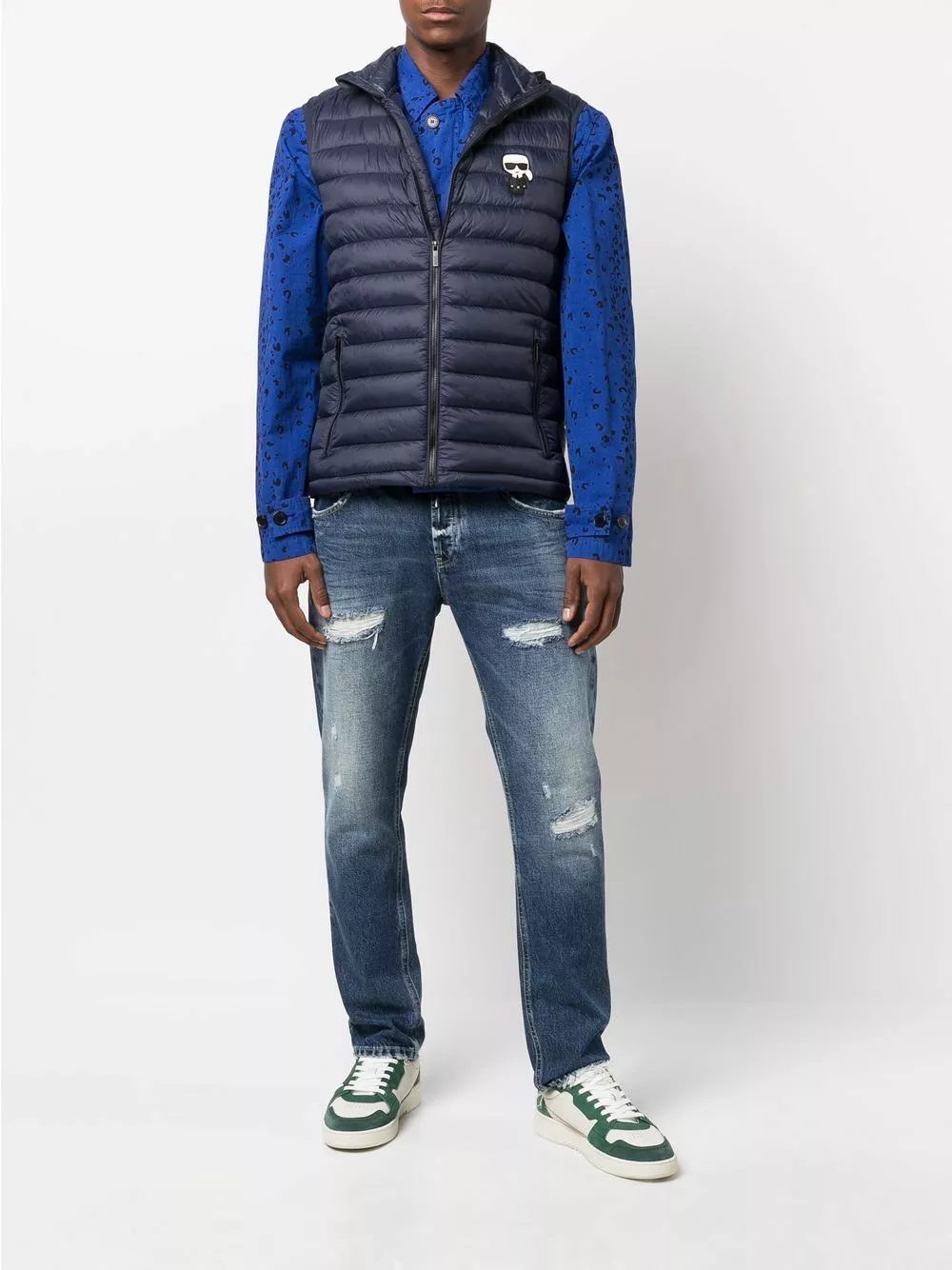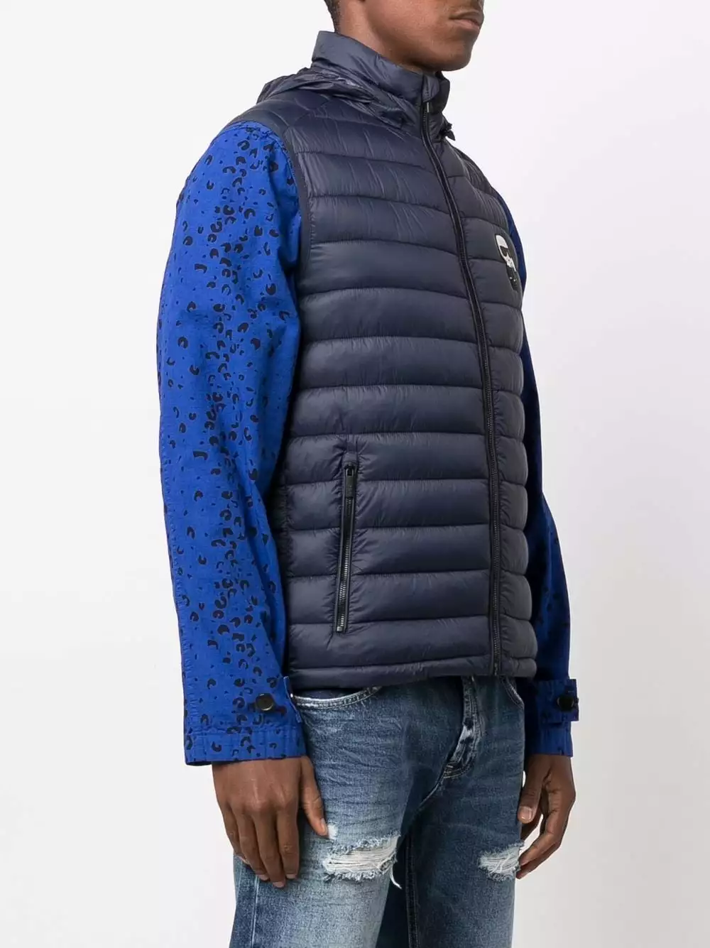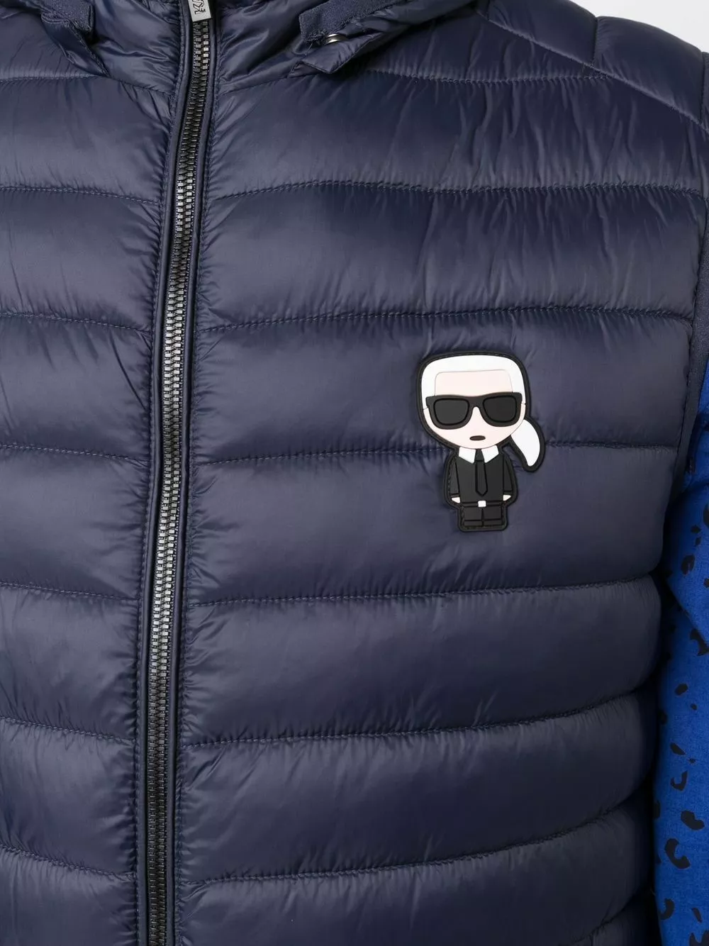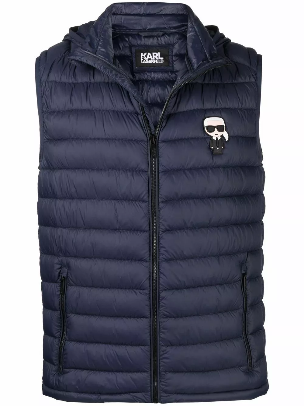 Karl Lagerfeld’s signature logo patch decorates the chest of this padded sleeveless gilet for AW21. Designed for optimum practicality; it features a detachable hood and two side zipped pockets.
