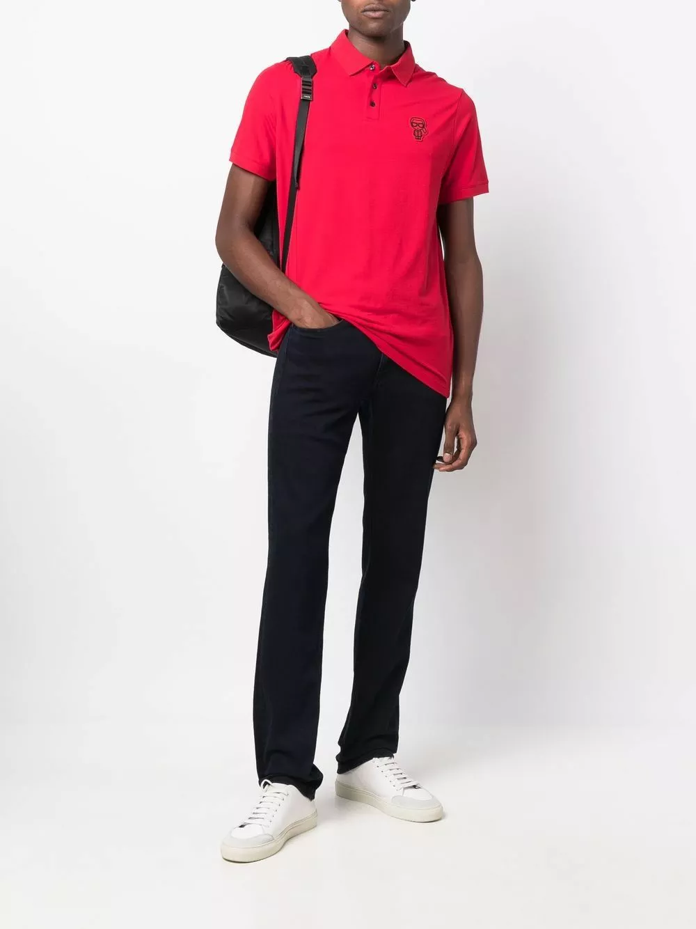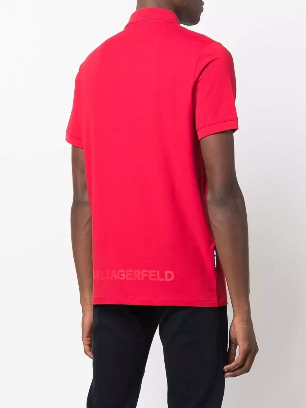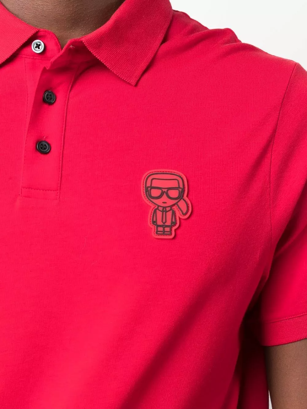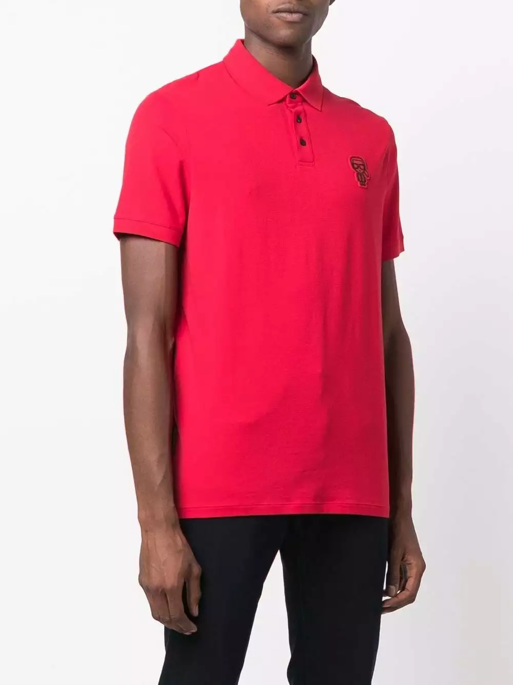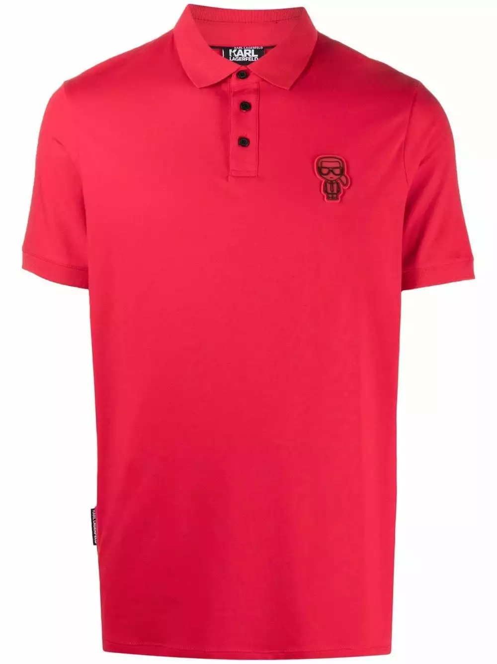 Red cotton logo-patch polo shirt from KARL LAGERFELD featuring logo patch at the chest, polo collar, front button placket, short sleeves and straight hem.