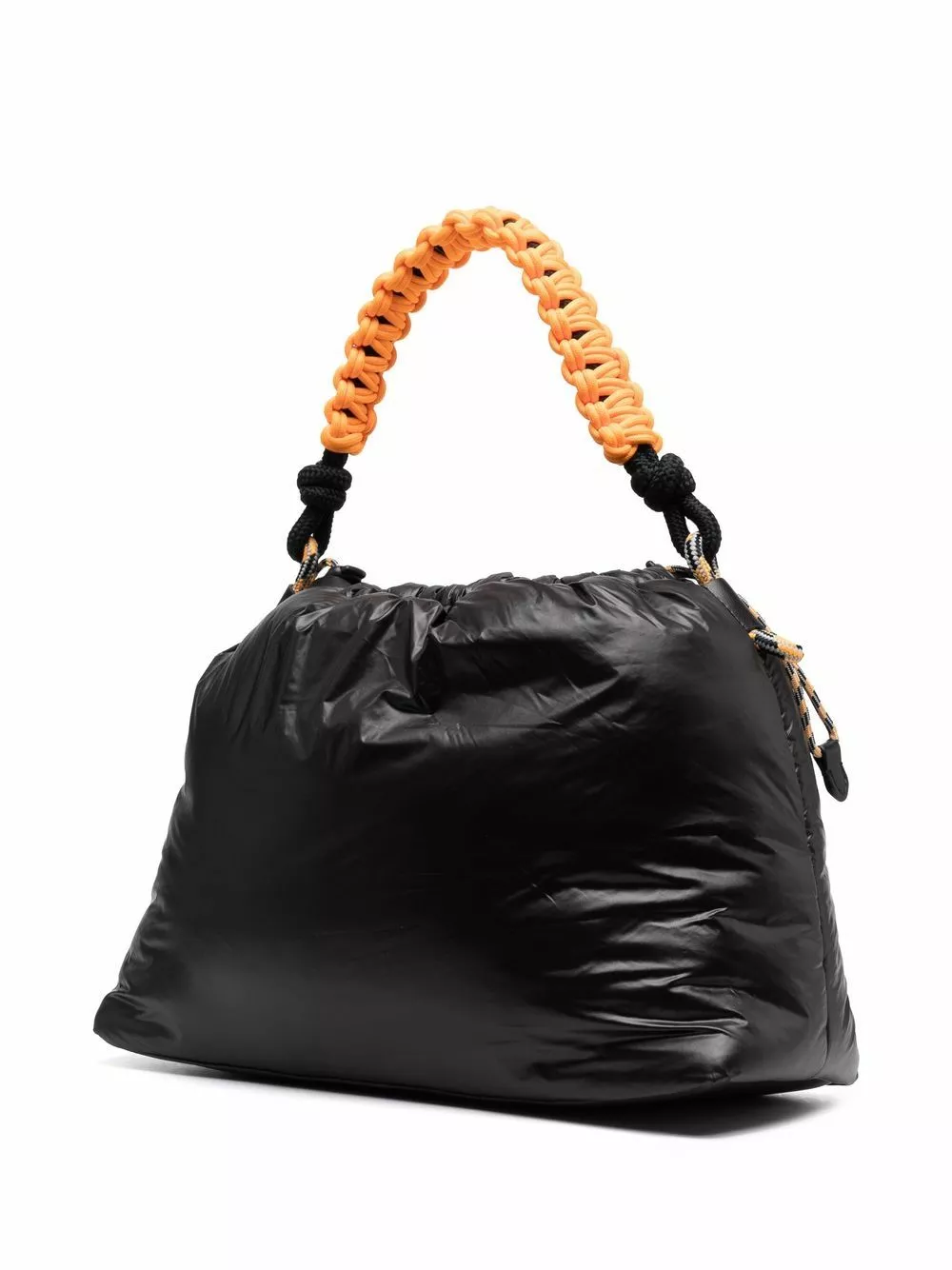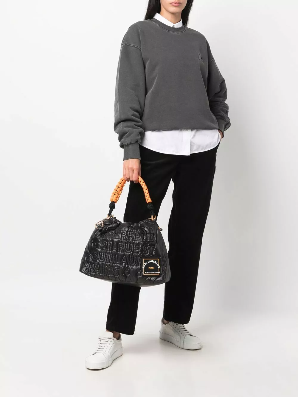 Karl Lagerfeld’s shoulder bag has been made from recycled polyamide as an environmentally friendly option to reduce the brand’s carbon footprint. This sleek black design is accented with a contrasting top handle and debossed logo at the front. Notice the logo patch at the front.