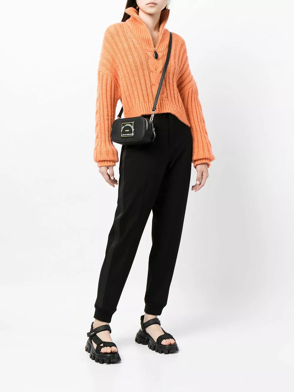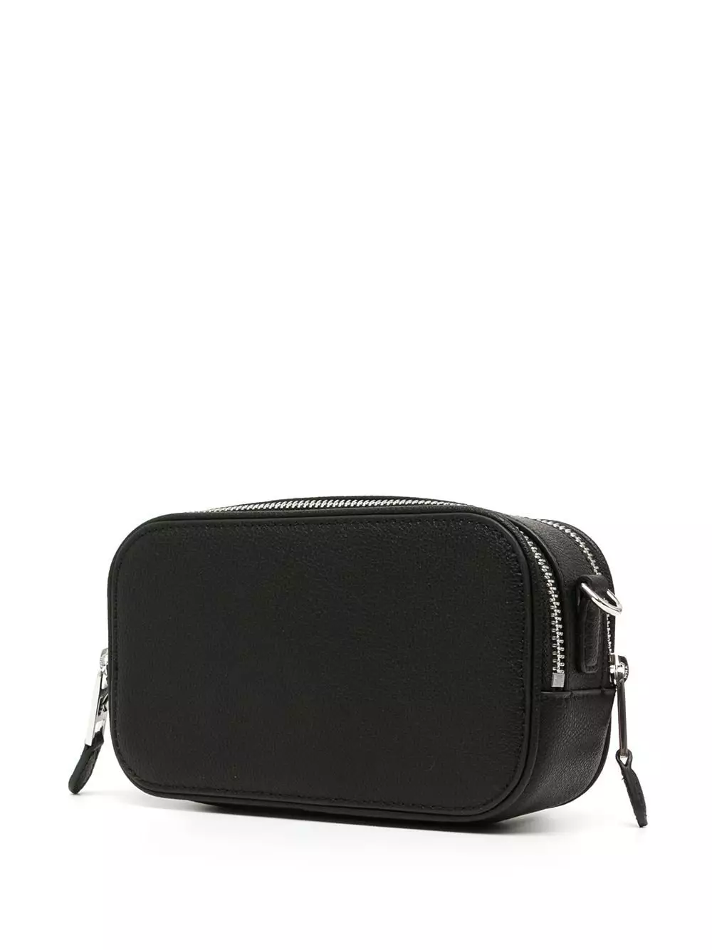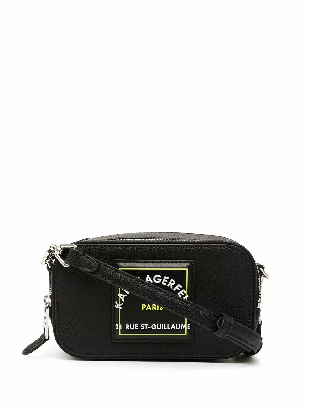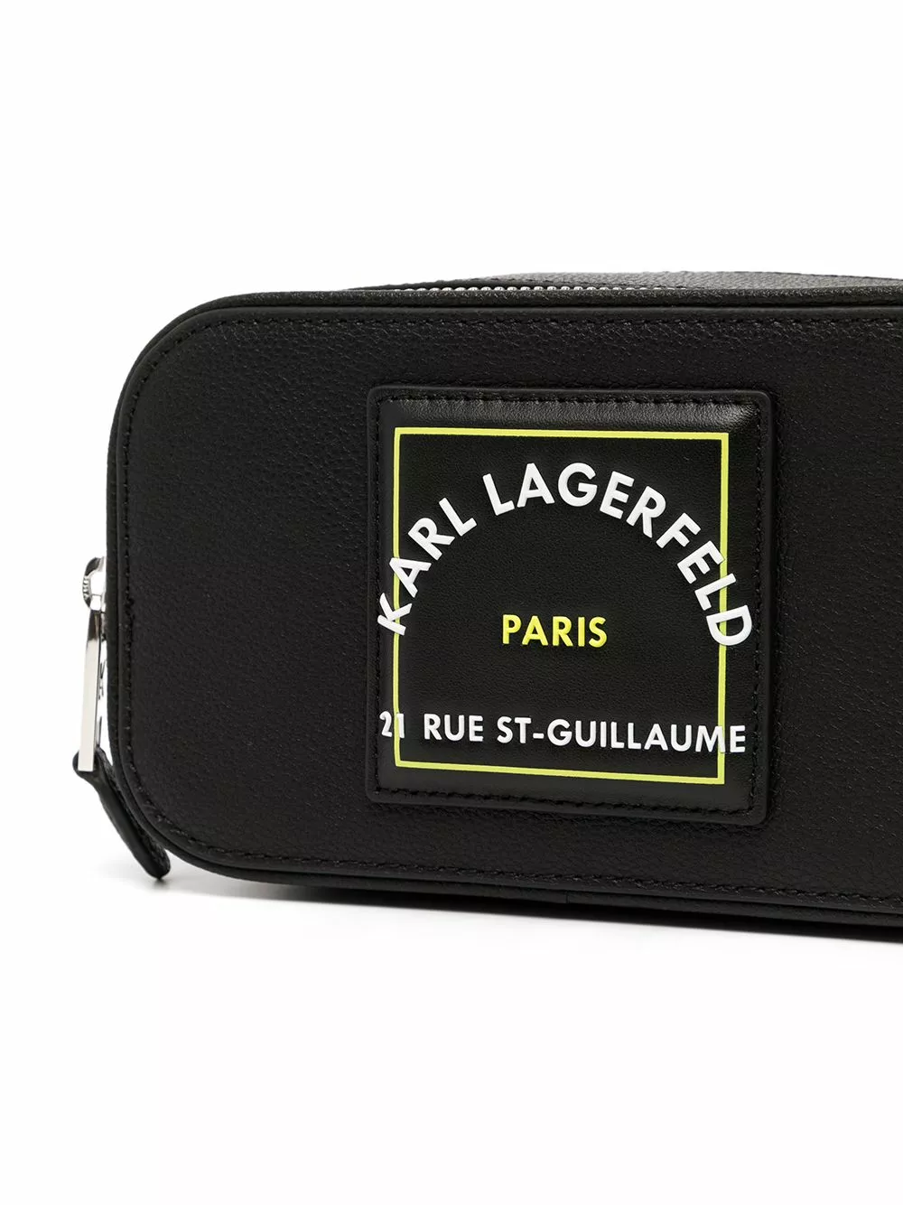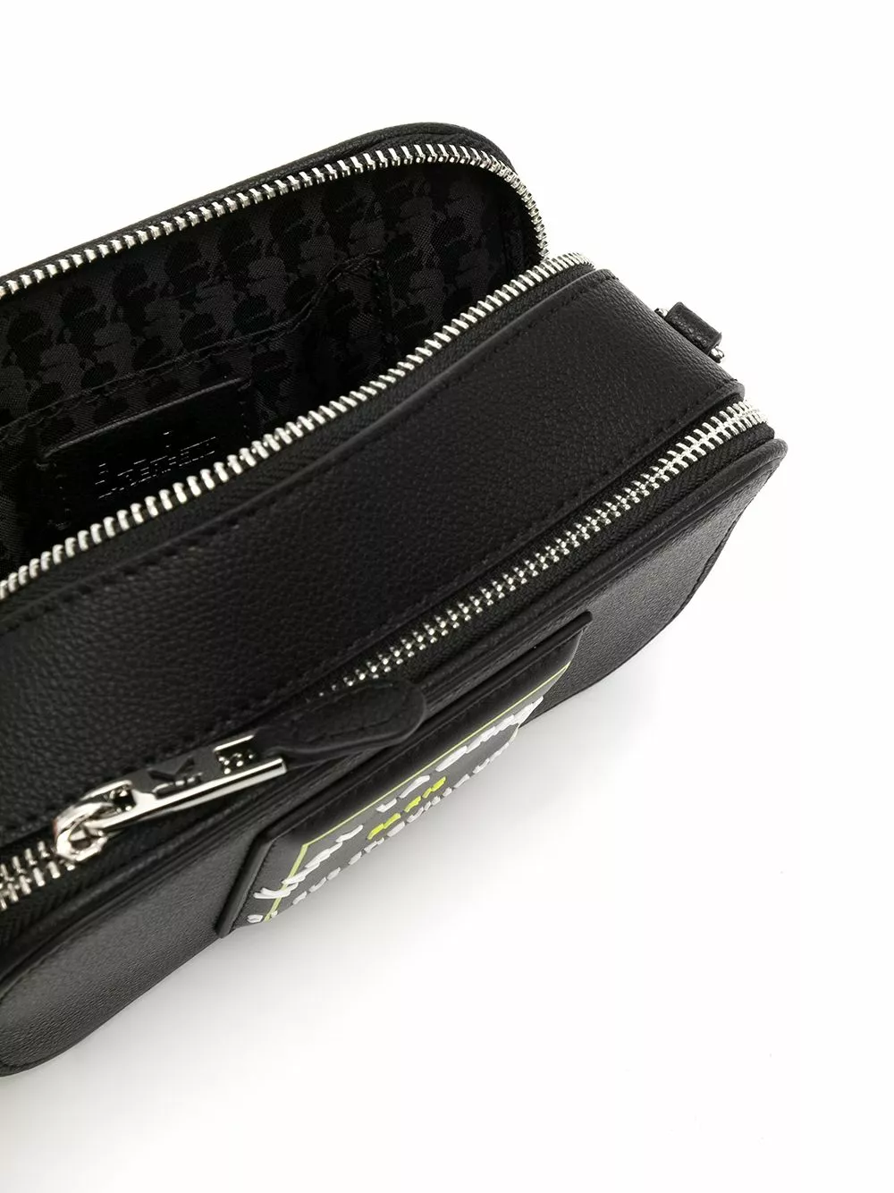 Black leather logo-print camera bag from KARL LAGERFELD featuring silver-tone hardware, logo print to the front, adjustable shoulder strap and double zip fasterning.