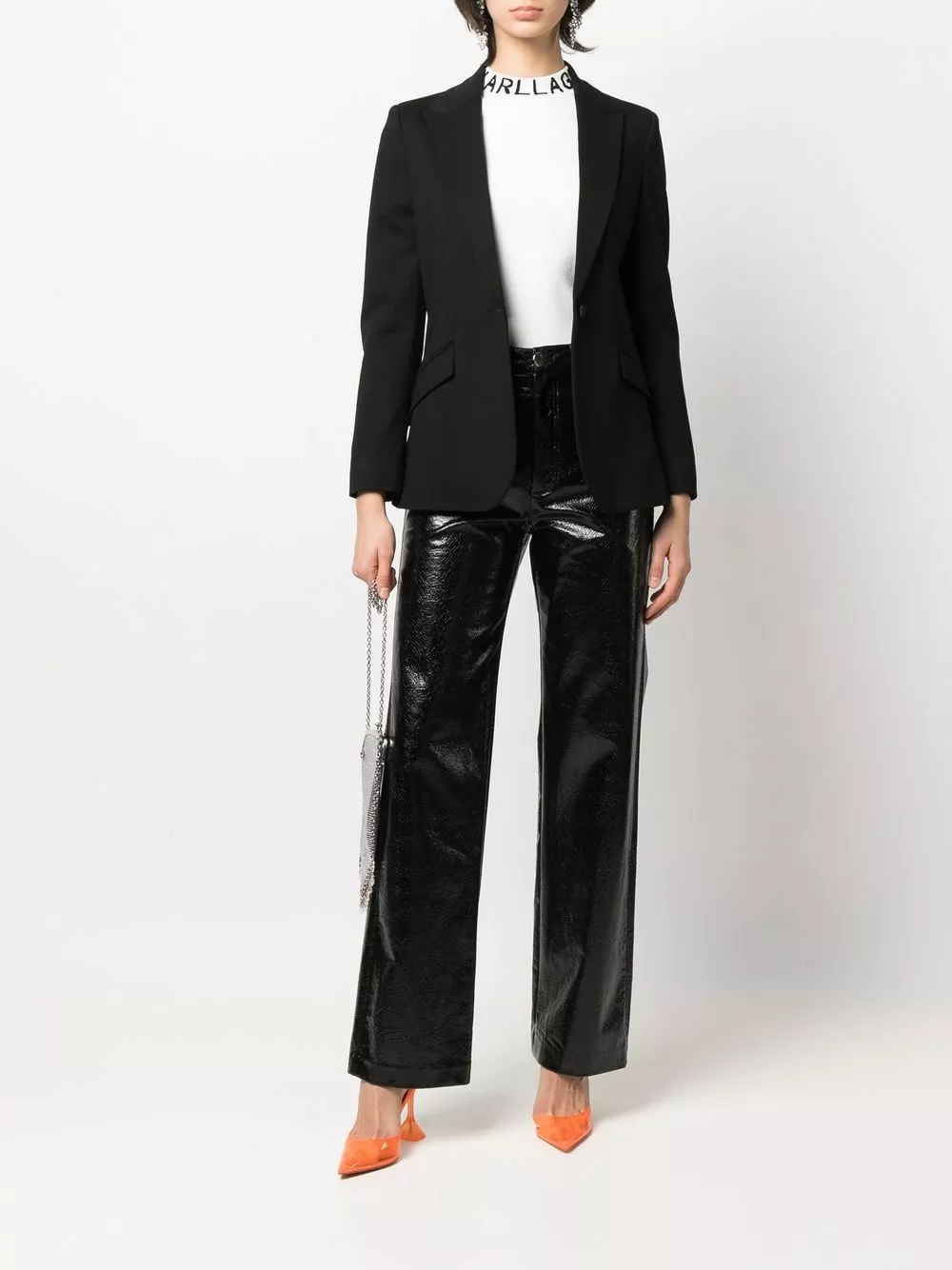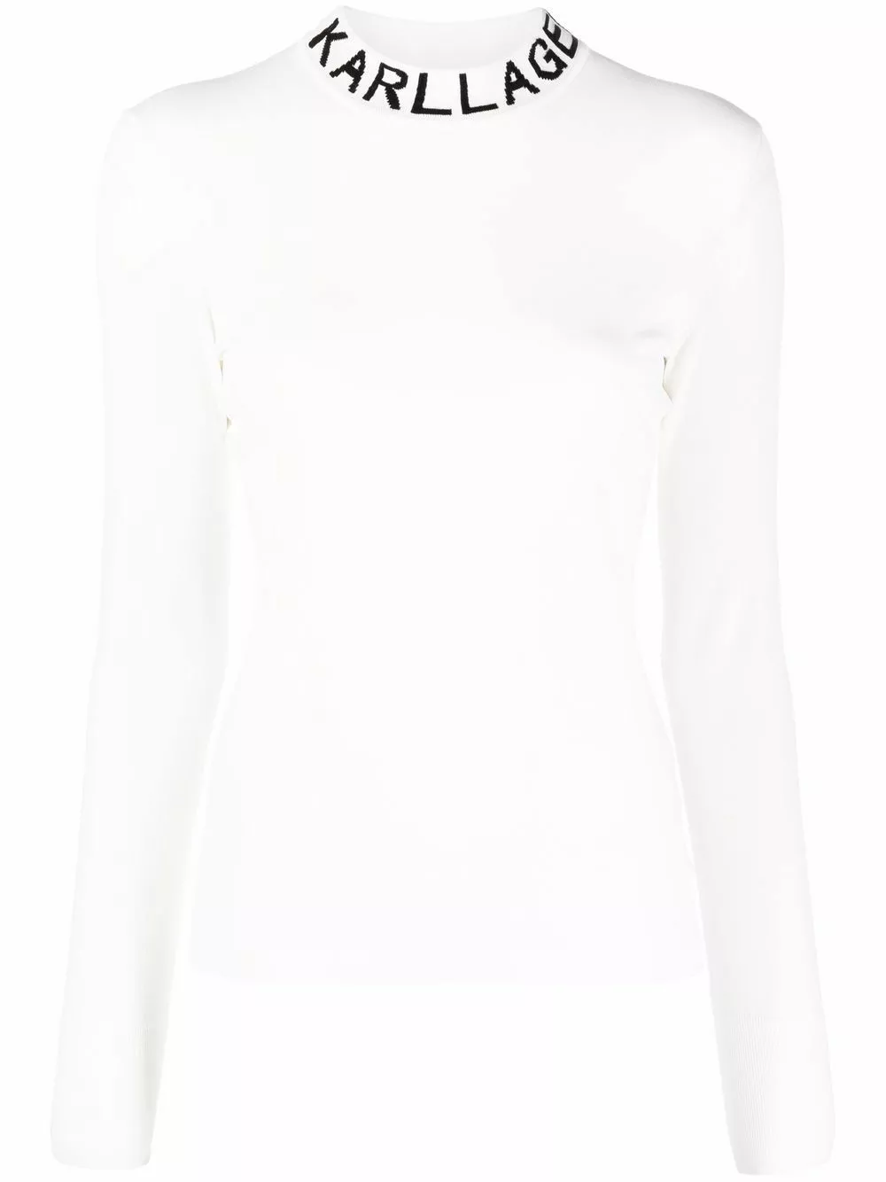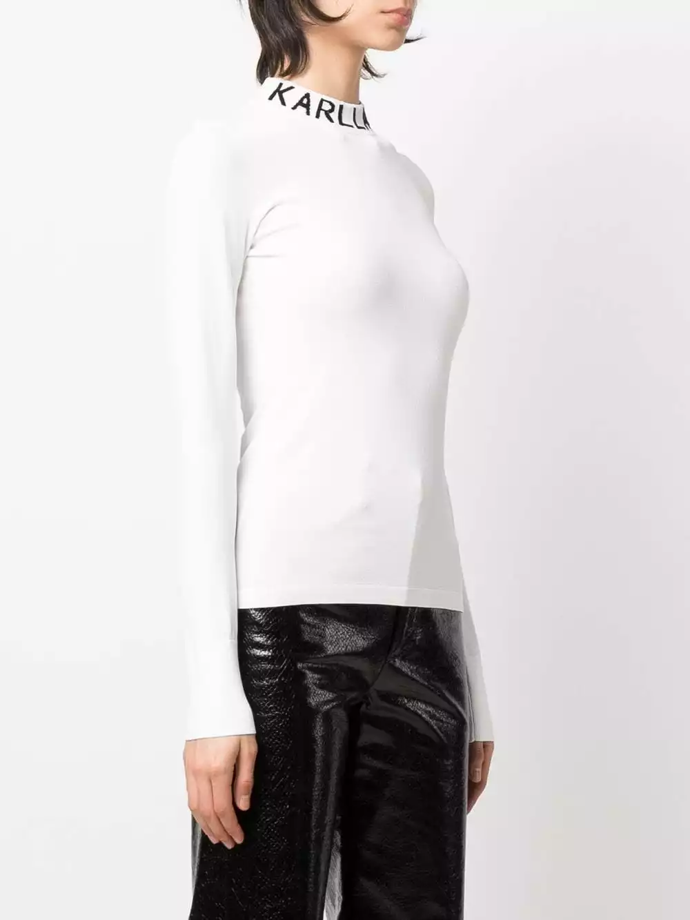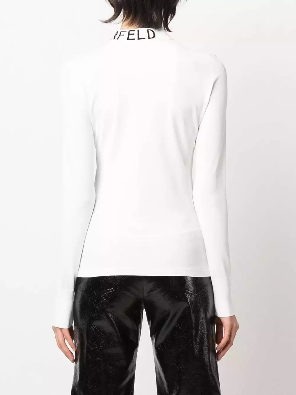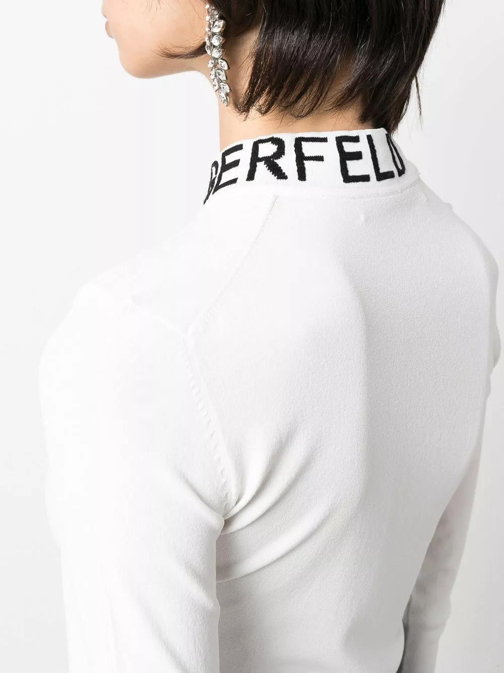 White logo turtleneck sweater top from Karl Lagerfeld. Featuring a turtle neck, mesh panels, short sleeves, a ribbed hem and cuffs and a logo at the neckline.