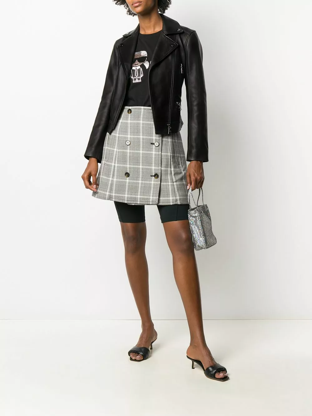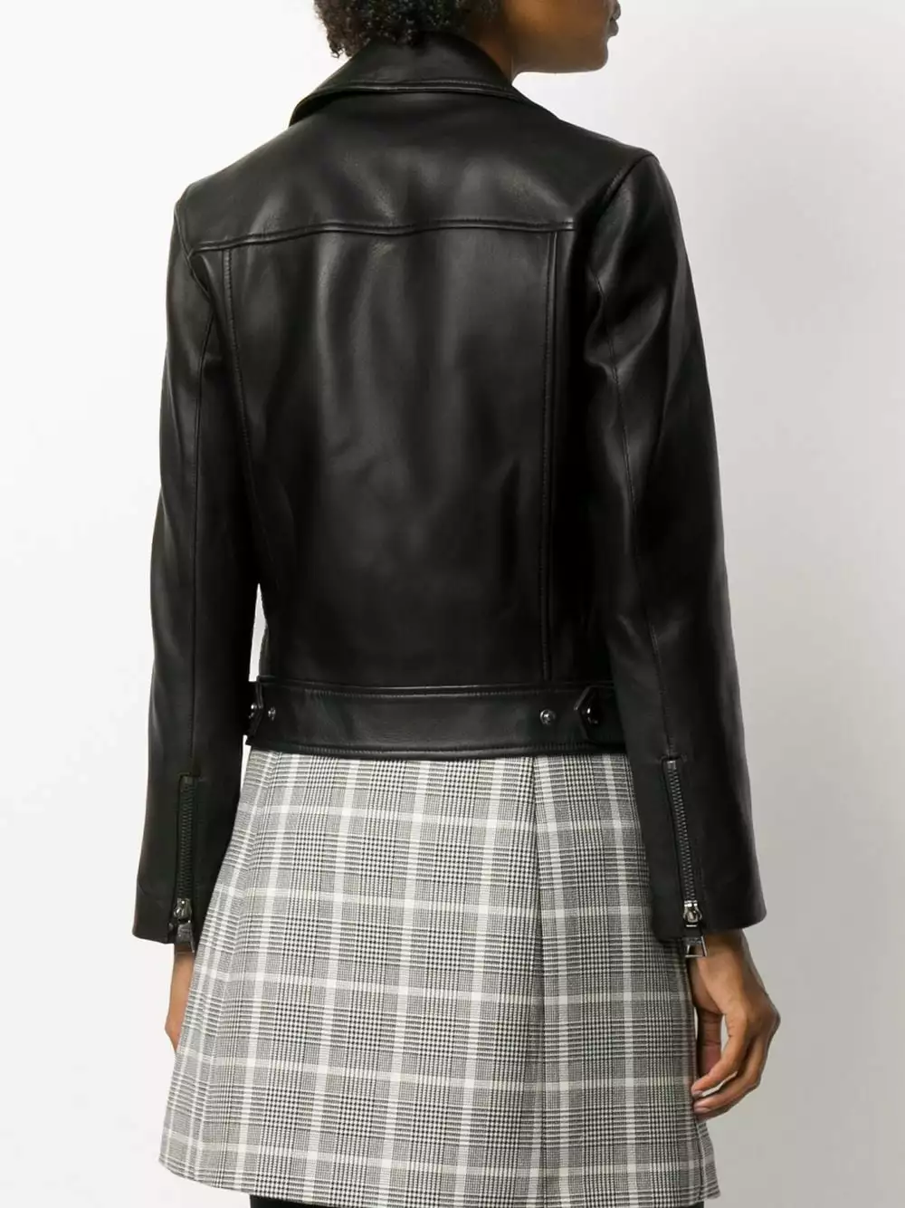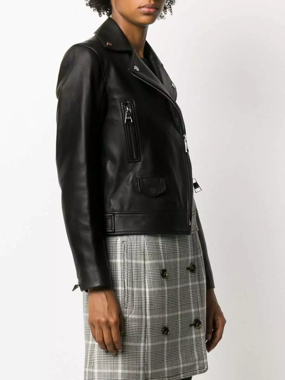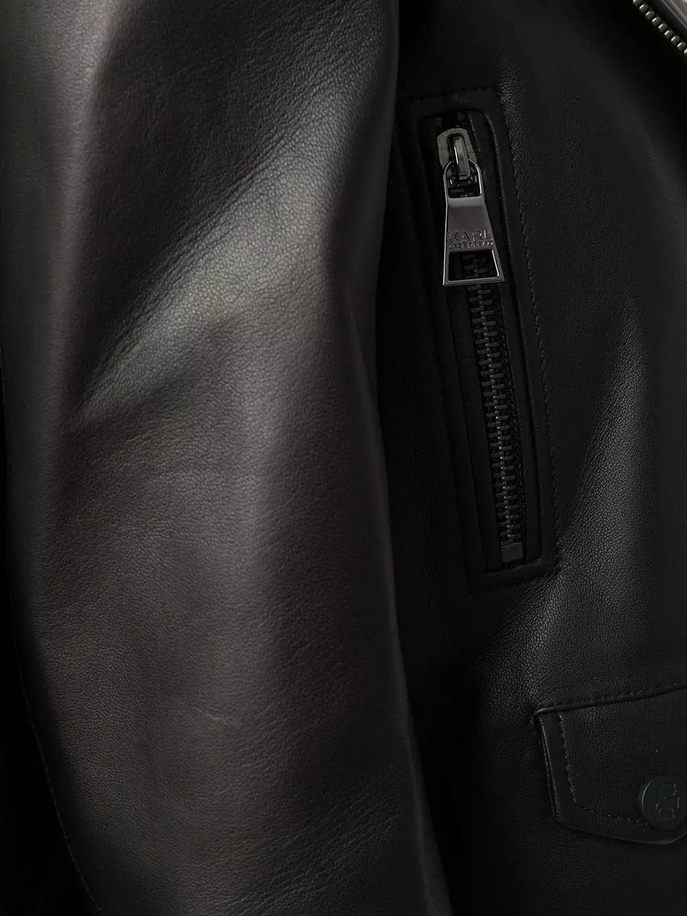 Black lamb skin off-centre zipped biker jacket from Karl Lagerfeld featuring a notched collar, an off-centre front zip fastening, long sleeves, side pockets and a short length.