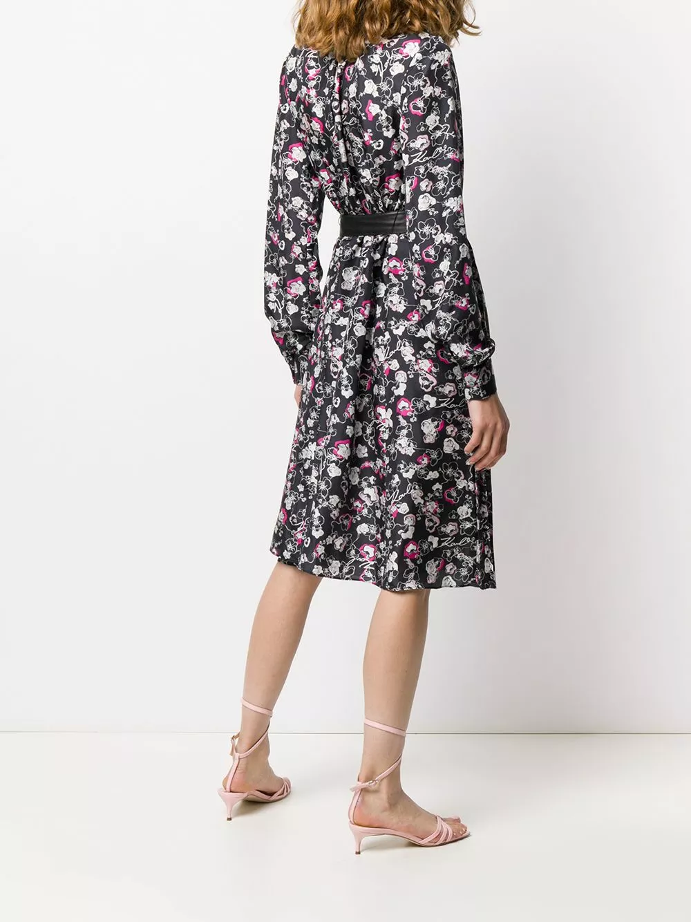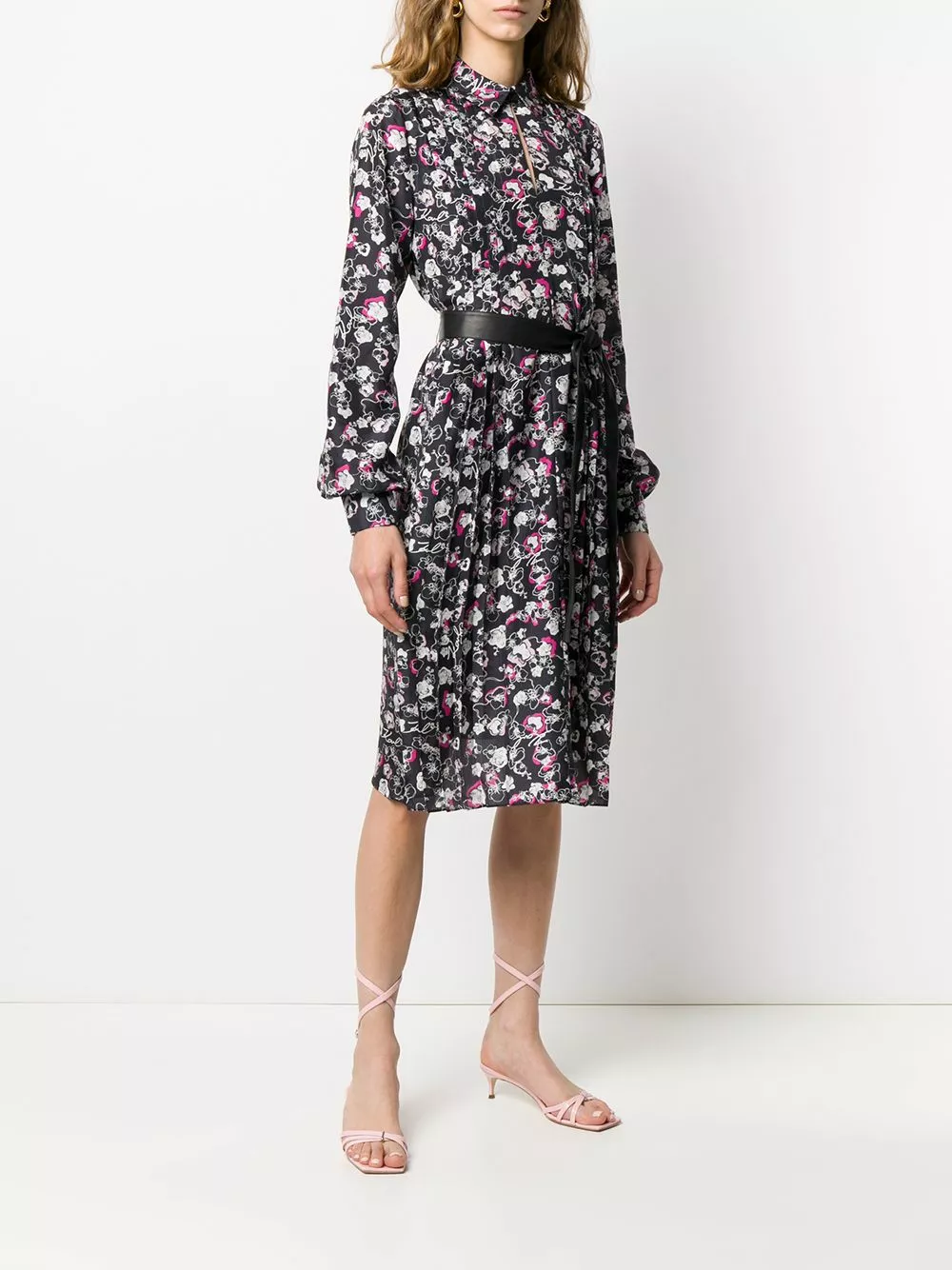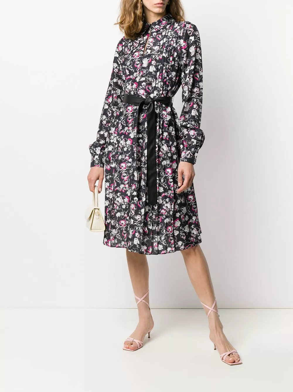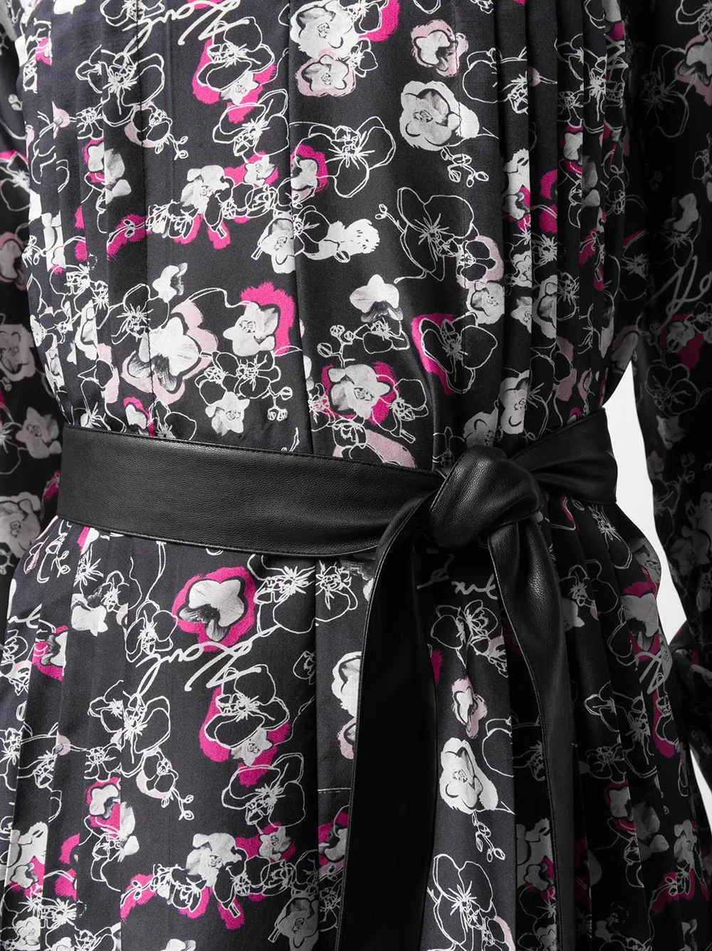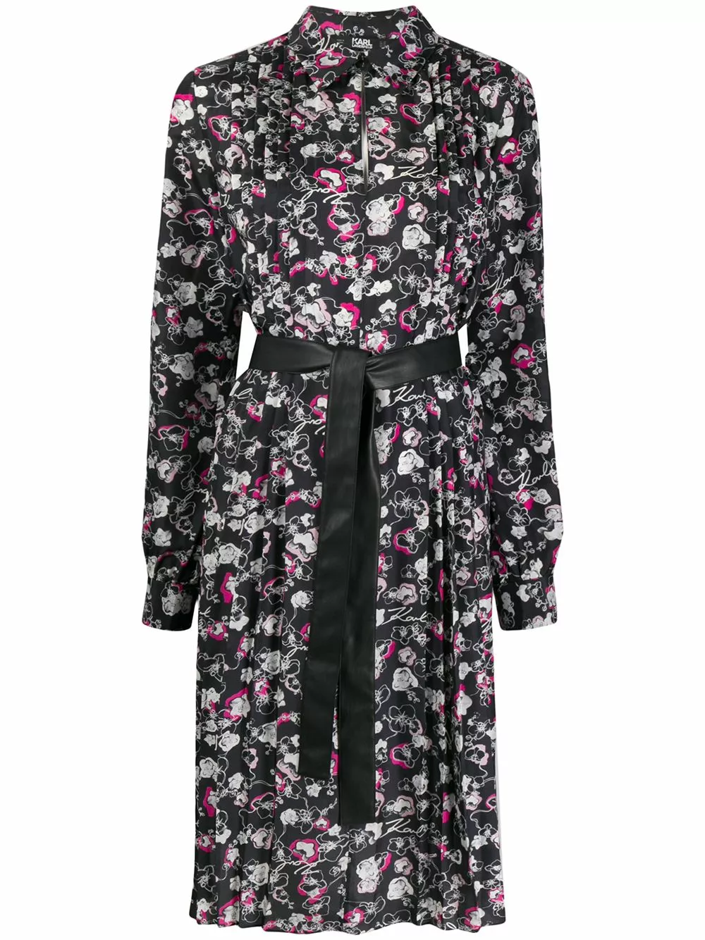 Black silk orchid print dress from Karl Lagerfeld featuring a tie waist, a pleated front bib, a classic collar, long sleeves and a mid-length.