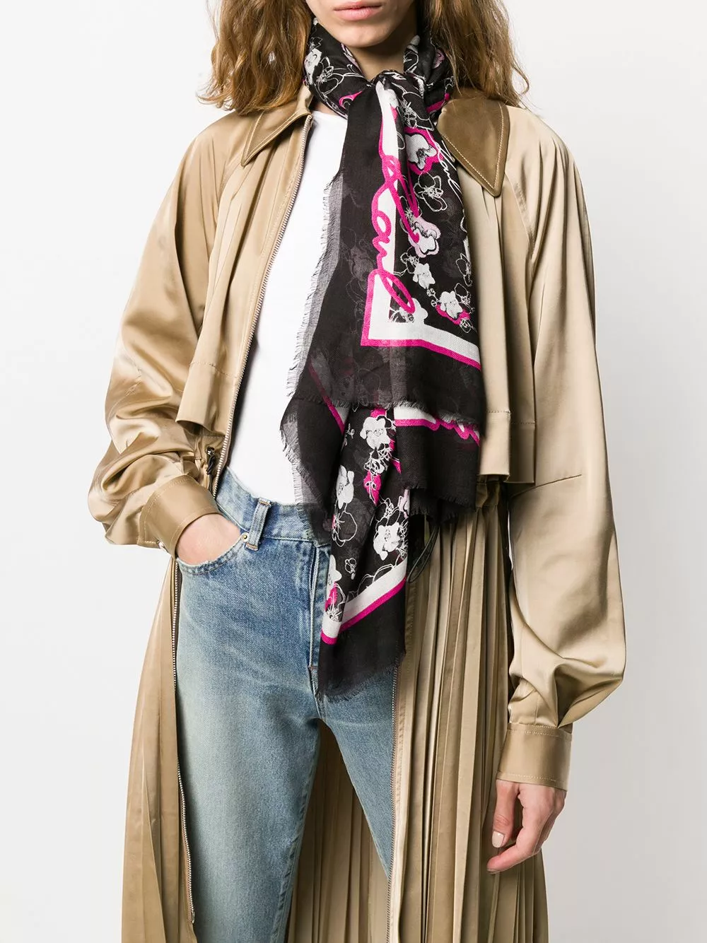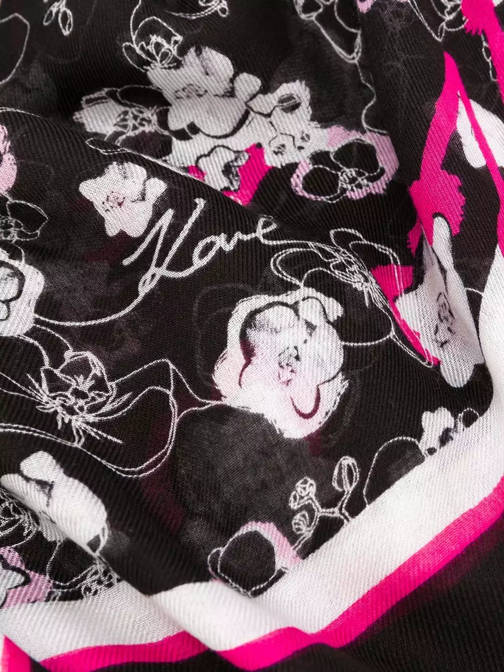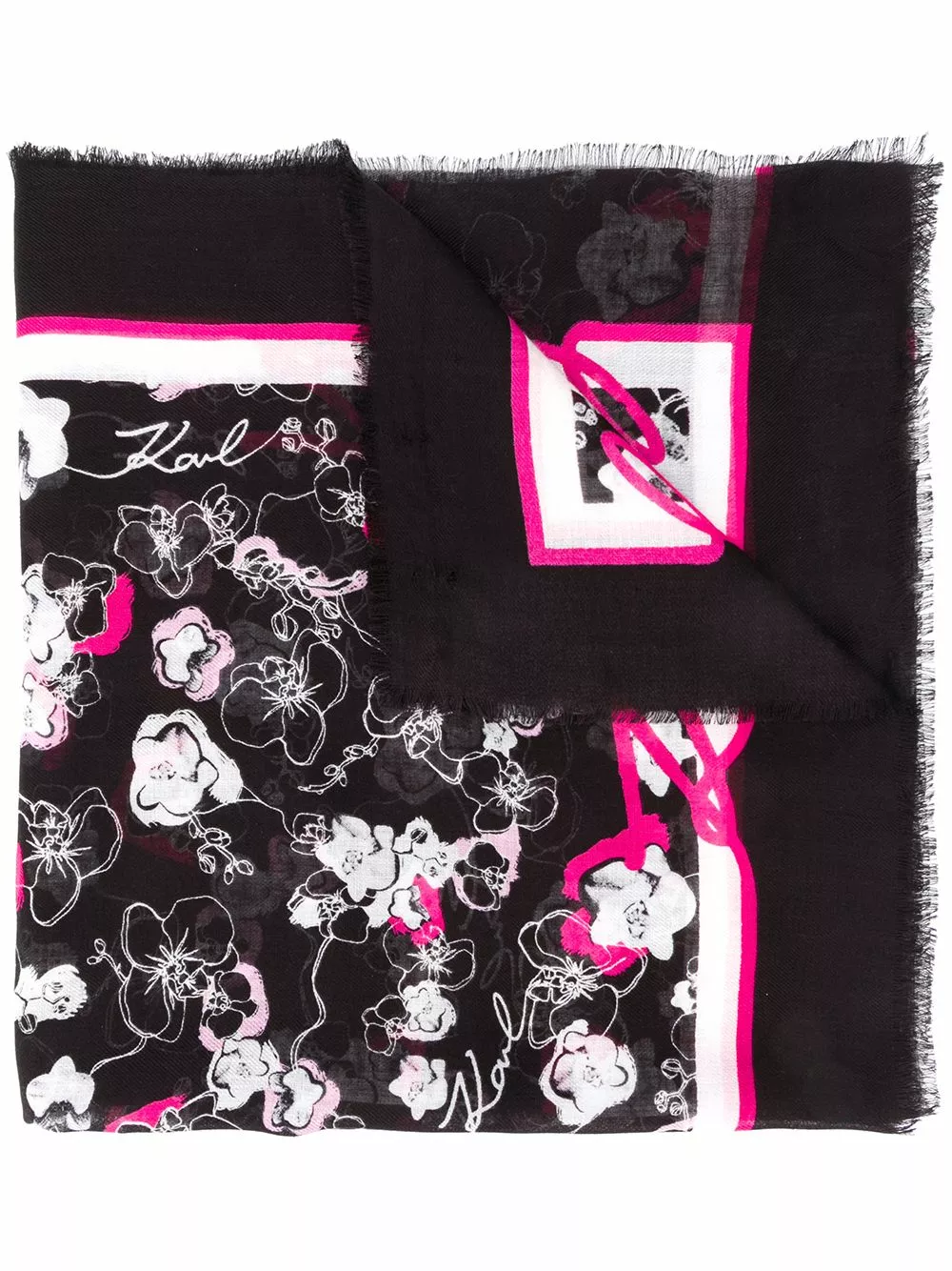 Multicolour orchid print square scarf from Karl Lagerfeld featuring a fine knit, a lightweight construction, a floral pattern and frayed edges.