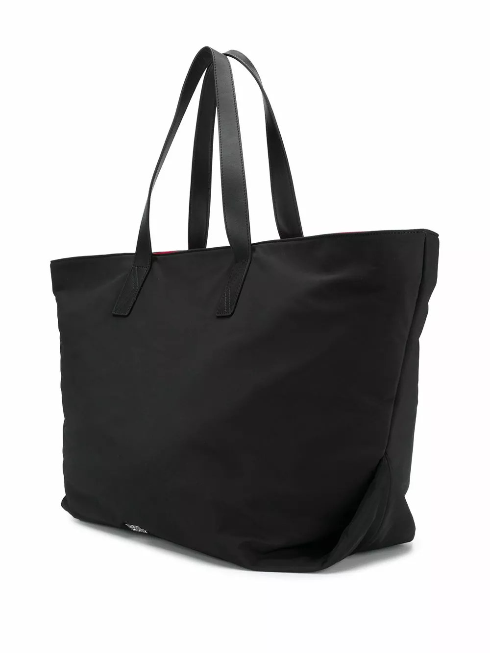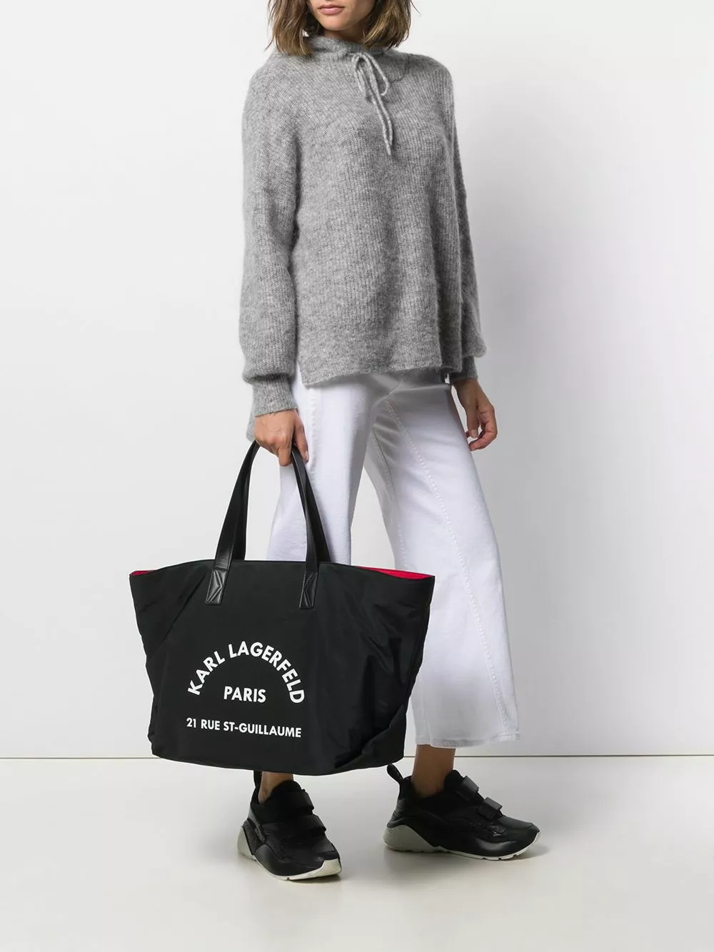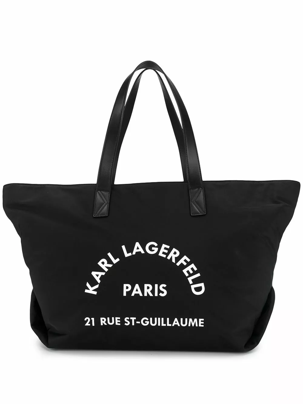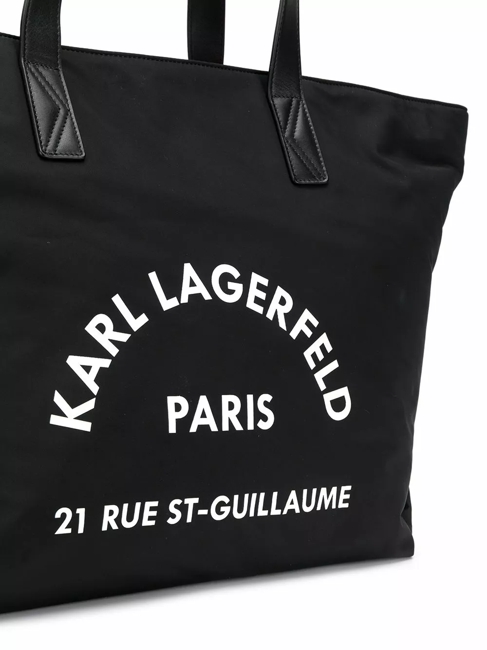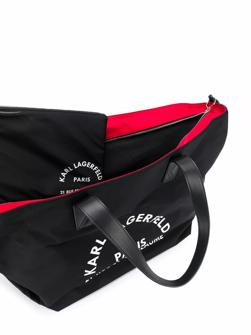 Black Rue St Guillaume big tote from Karl Lagerfeld featuring a hand strap, a top zip fastening, contrasting panels, a printed logo to the front and a removable pouch.
