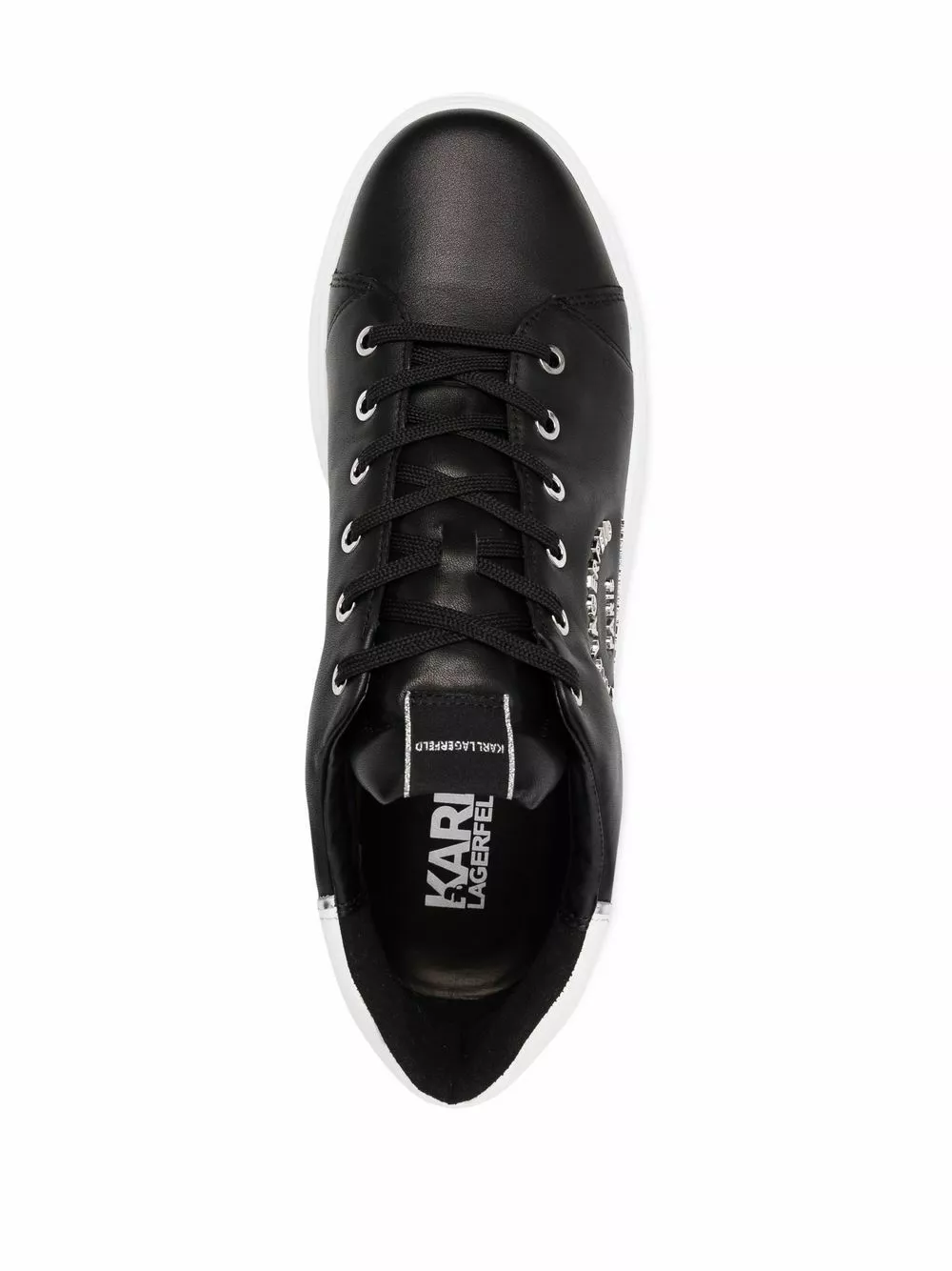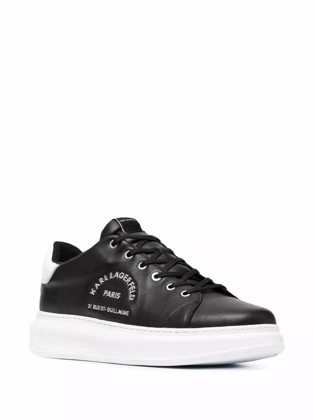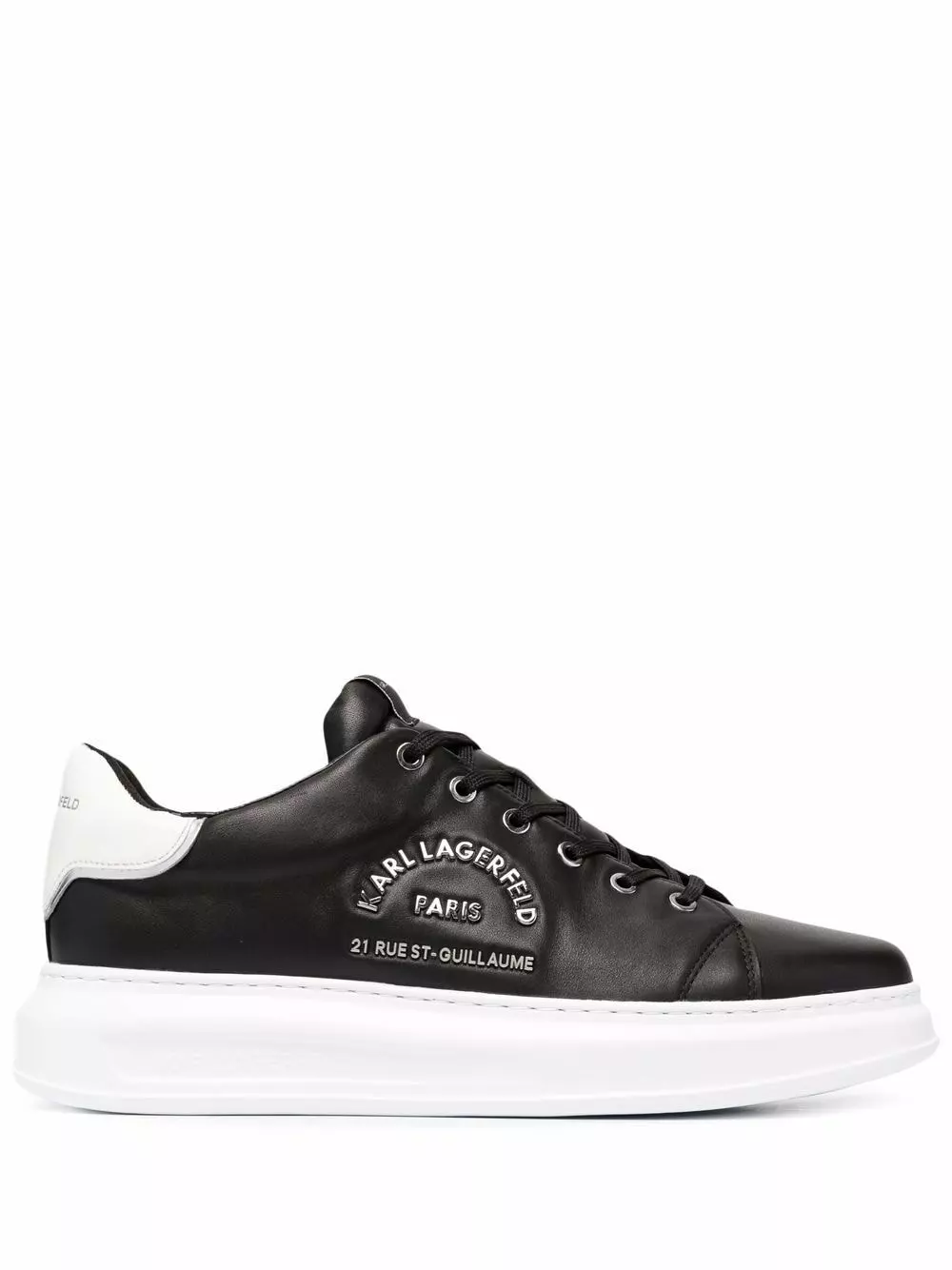 Karl Lagerfeld’s Rue St Guillaume low-top sneakers are detailed with the brand’s headquarters in silver-tone logo lettering. Produced from smooth black leather, they feature a contrasting white heel counter and central lace-up closure.