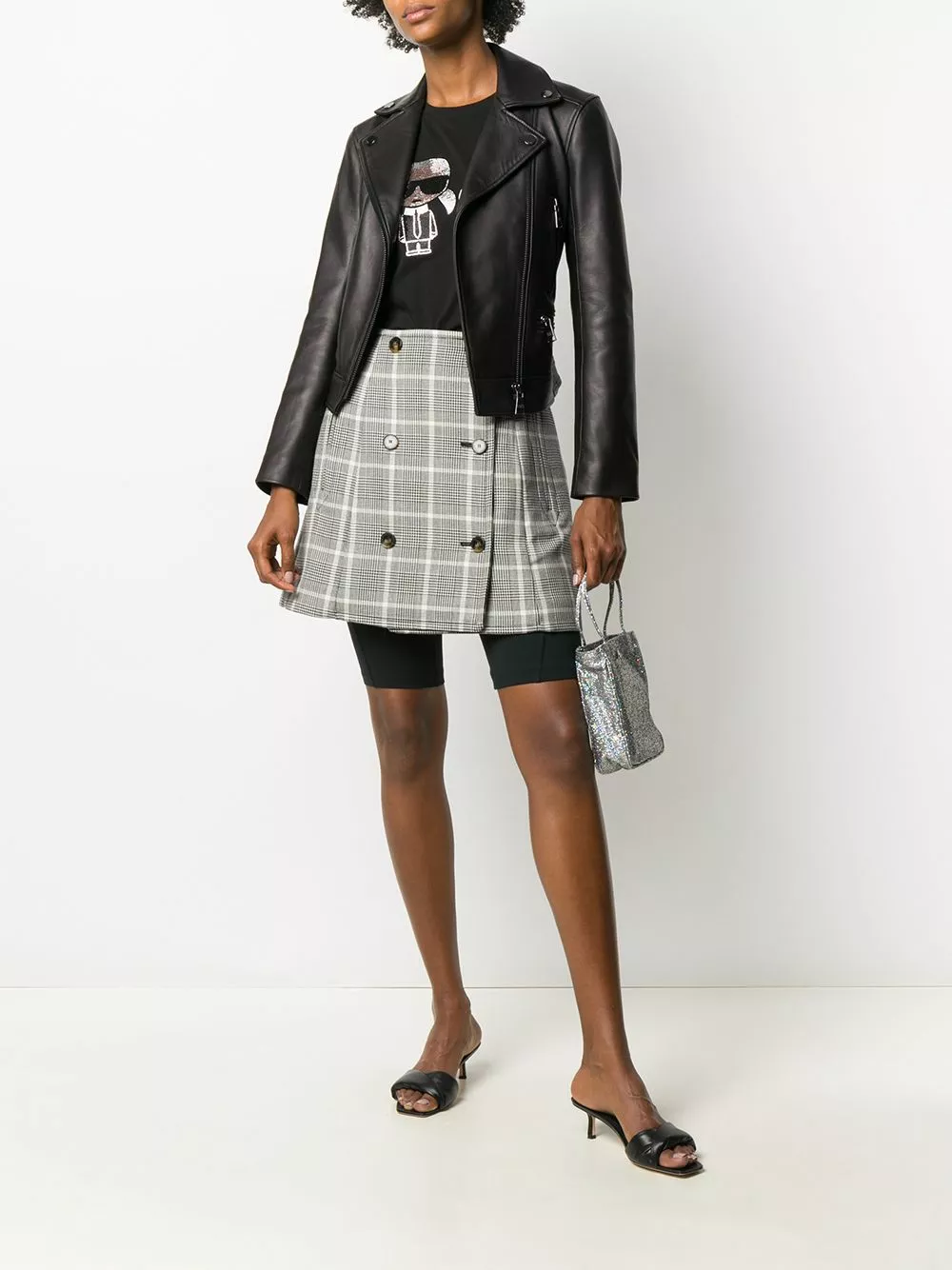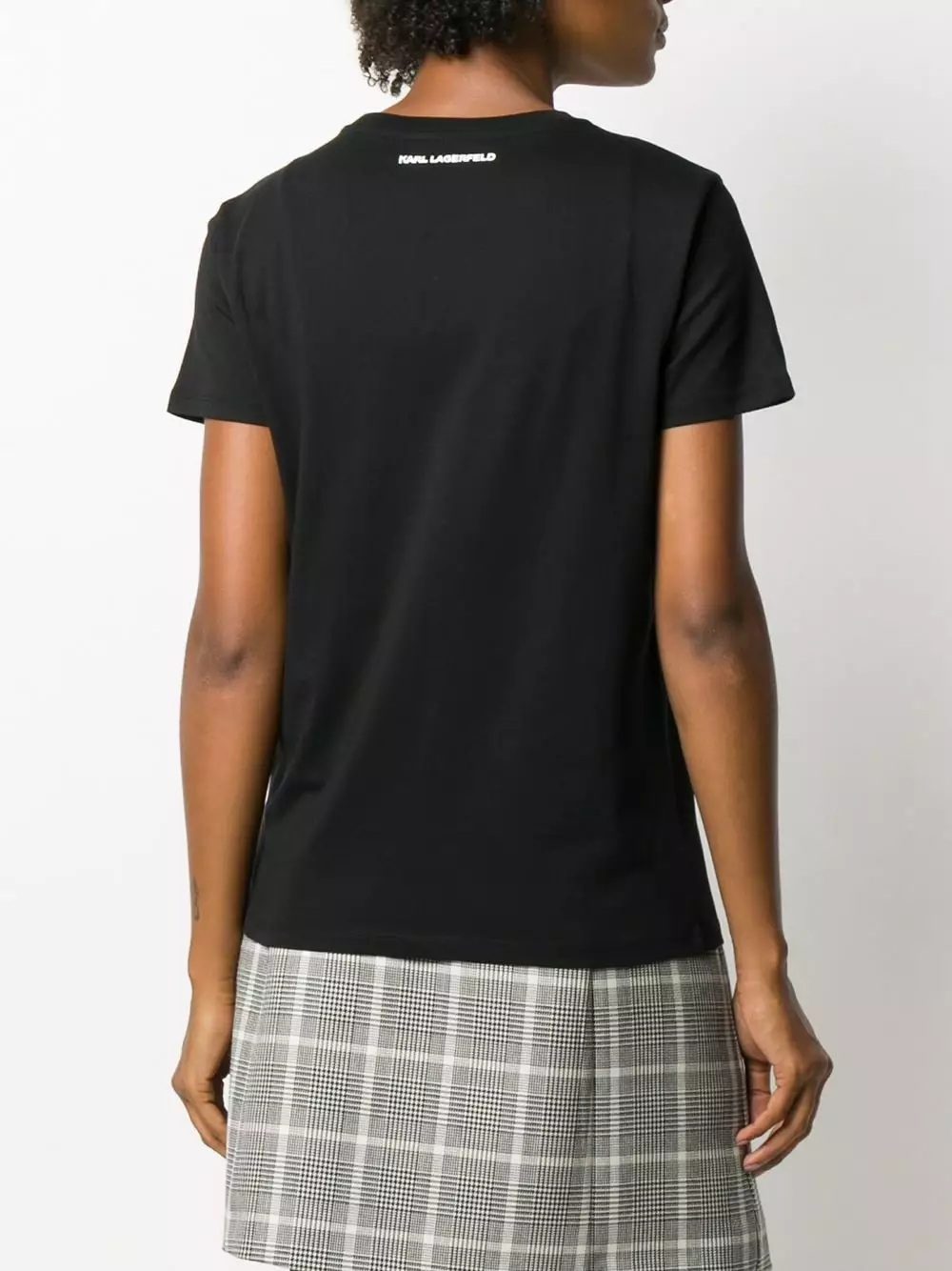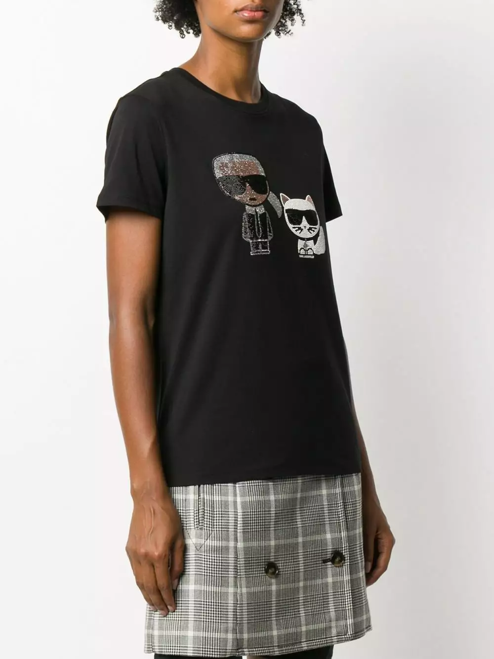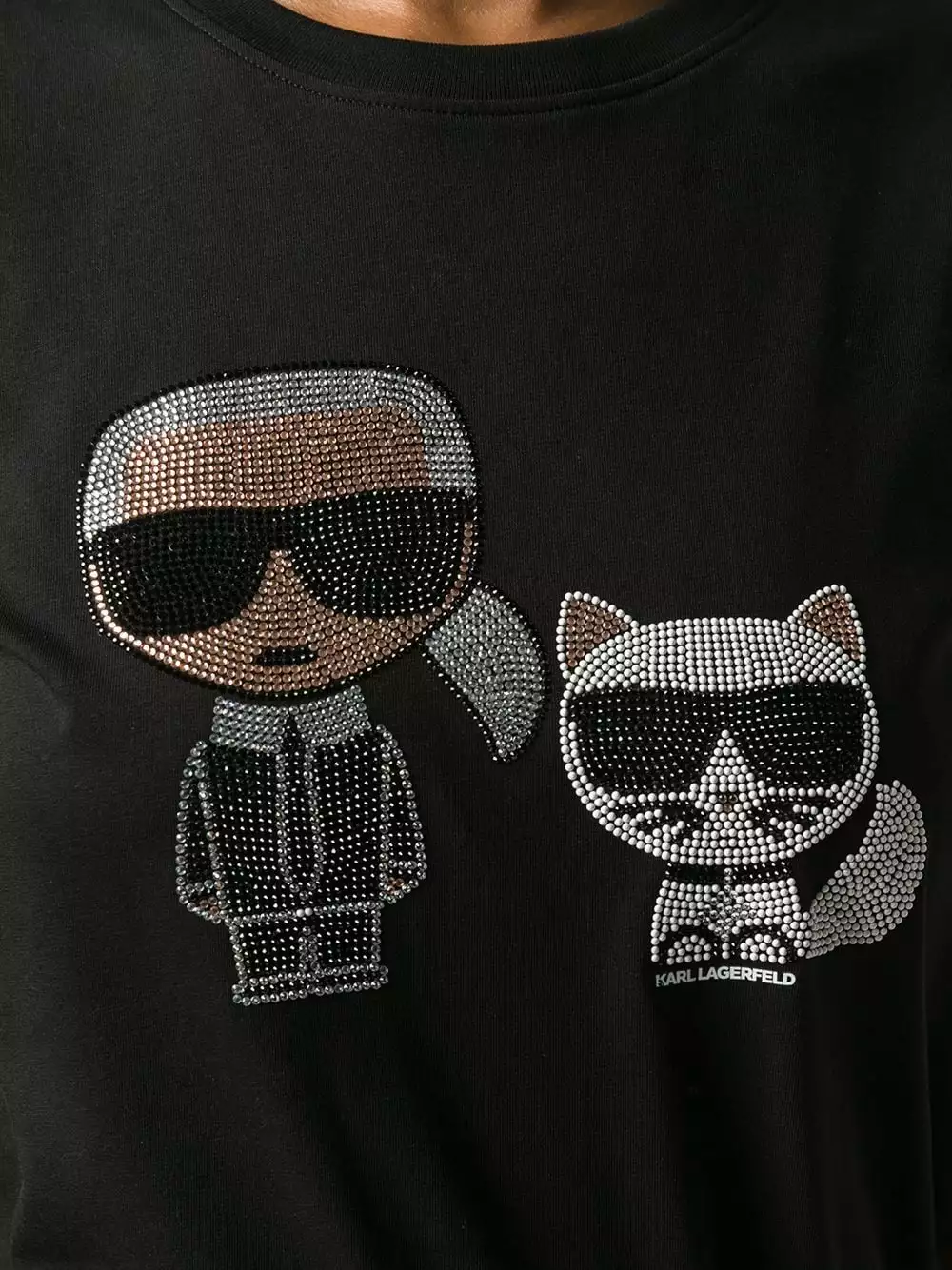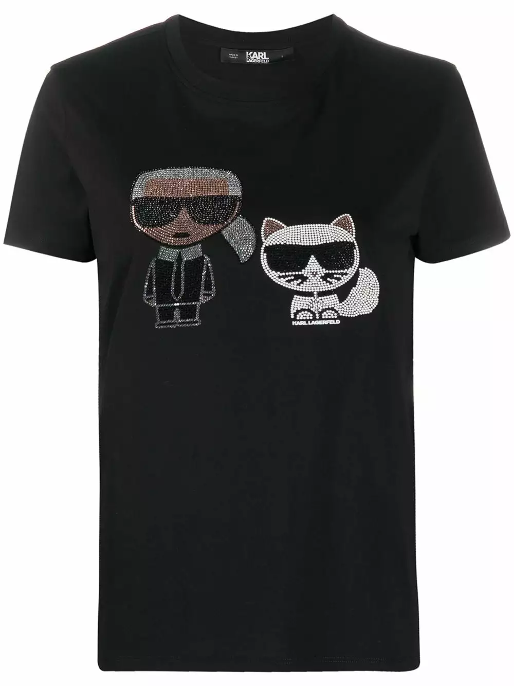 Black cotton and glass short sleeve rhinestone embellished T-shirt from Karl Lagerfeld featuring a round neck, short sleeves, rhinestone embellishments and a straight hem.