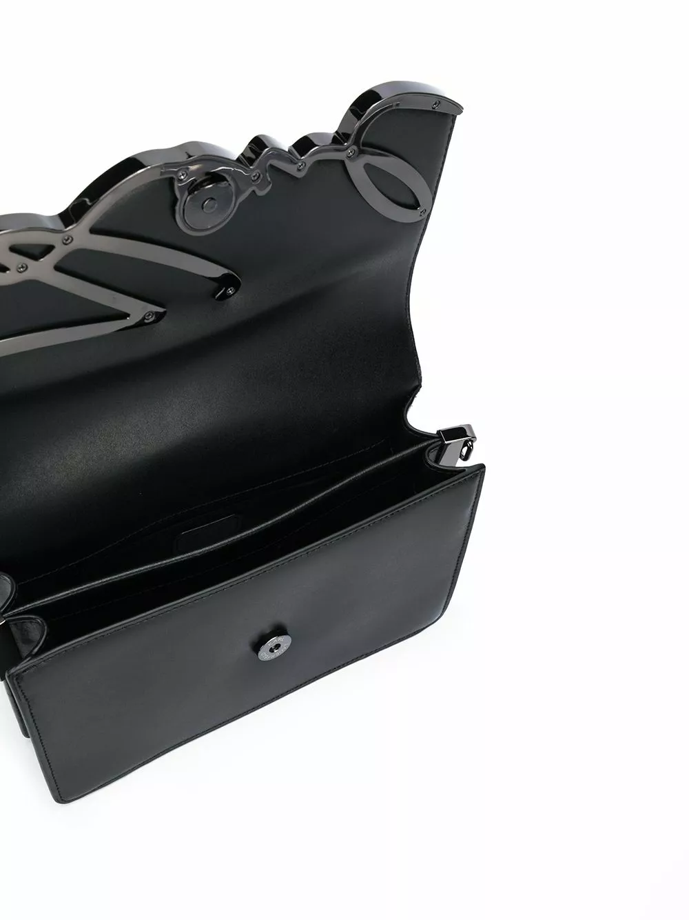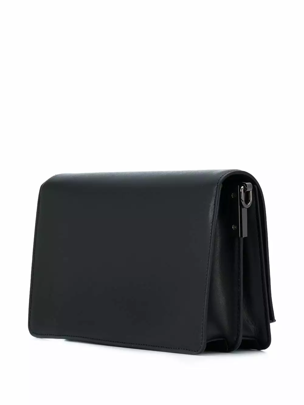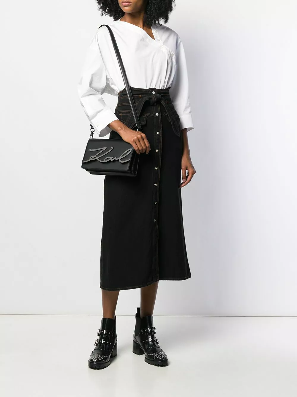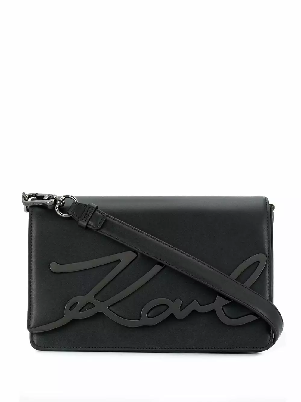Black leather small K/Signature shoulder bag from Karl Lagerfeld featuring a chain link strap, a front logo plaque and a foldover top with magnetic closure.