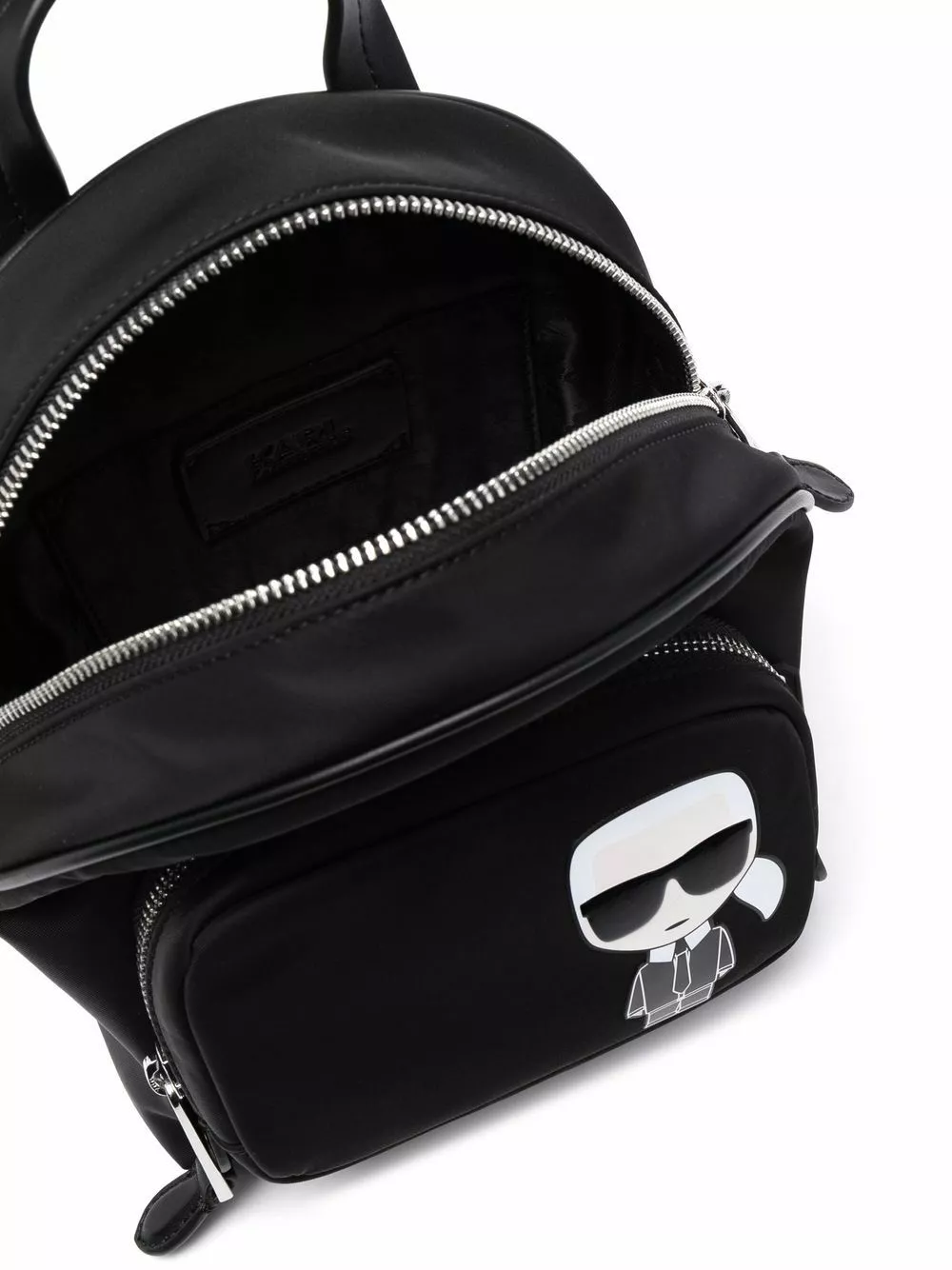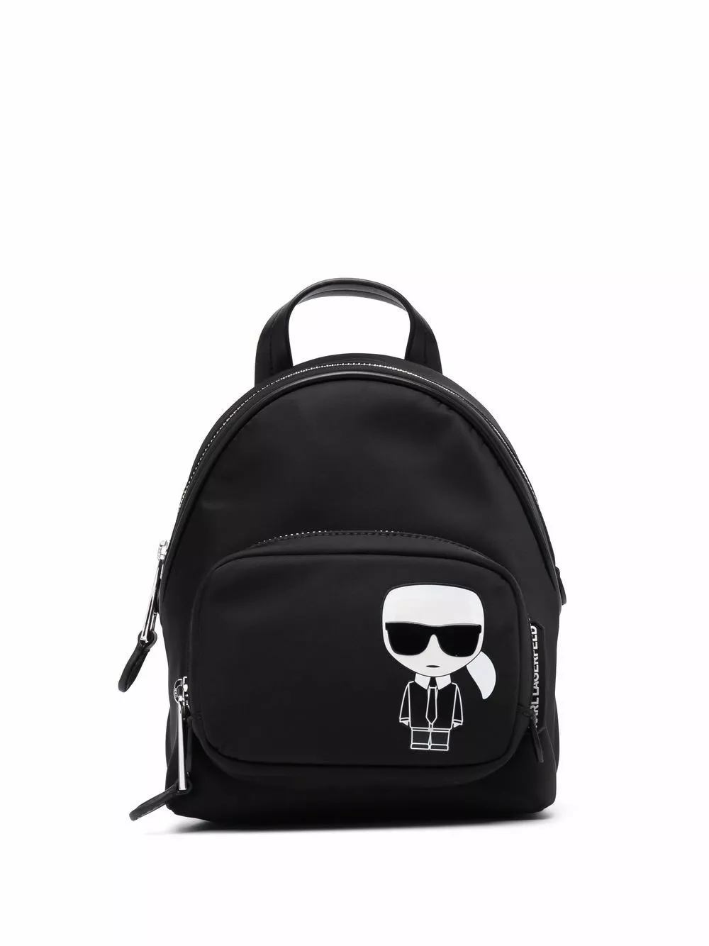 Designed with KARL Ikonik artwork, this small recycled nylon backpack is an iconic tribute to the late designer. The accessory features a zip-fastening main compartment and a zipped front compartment for maximum storage.