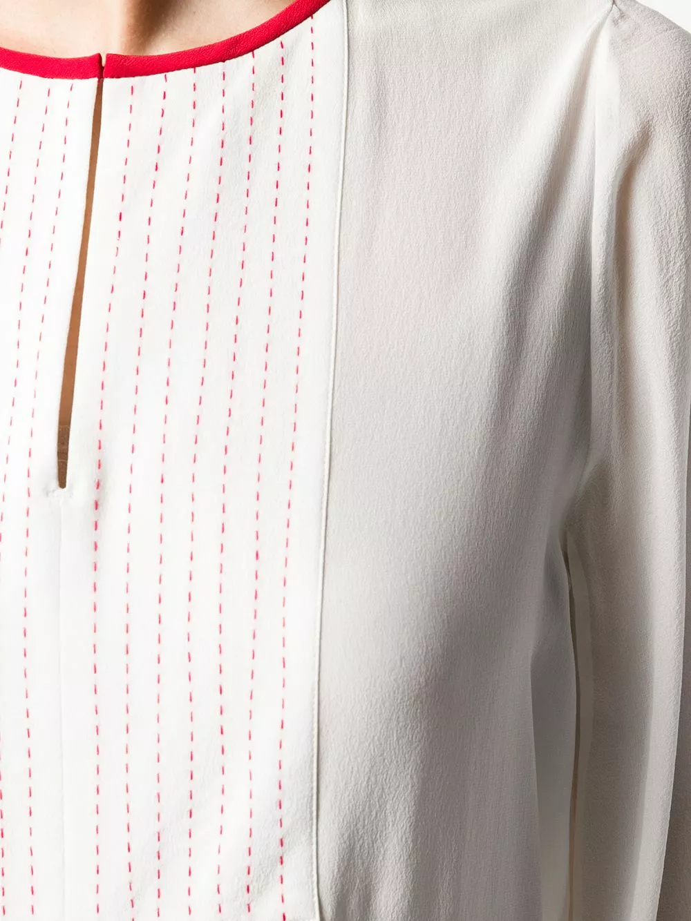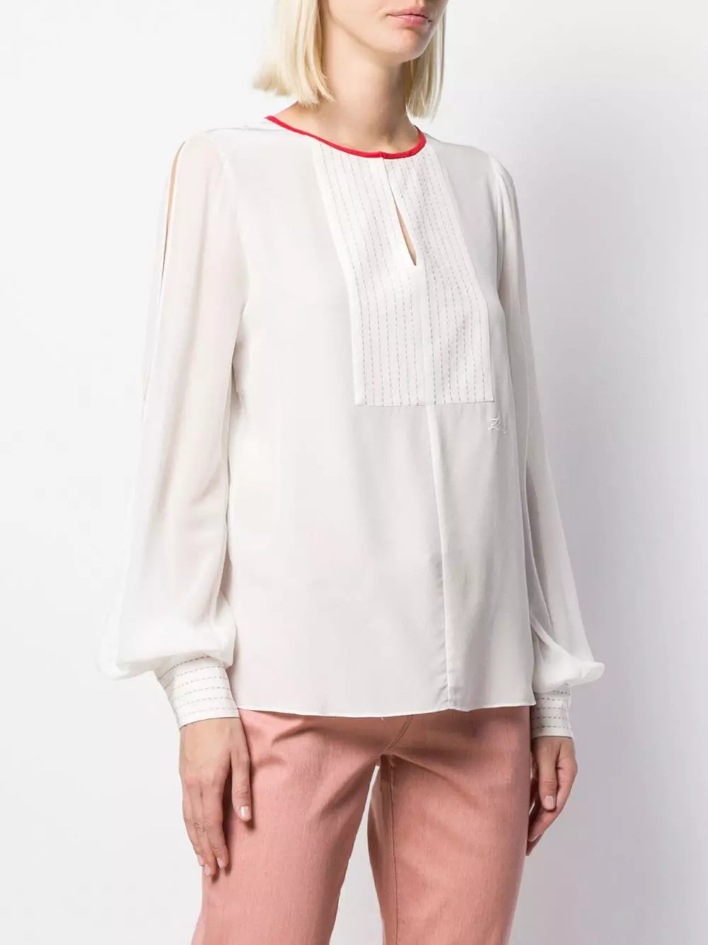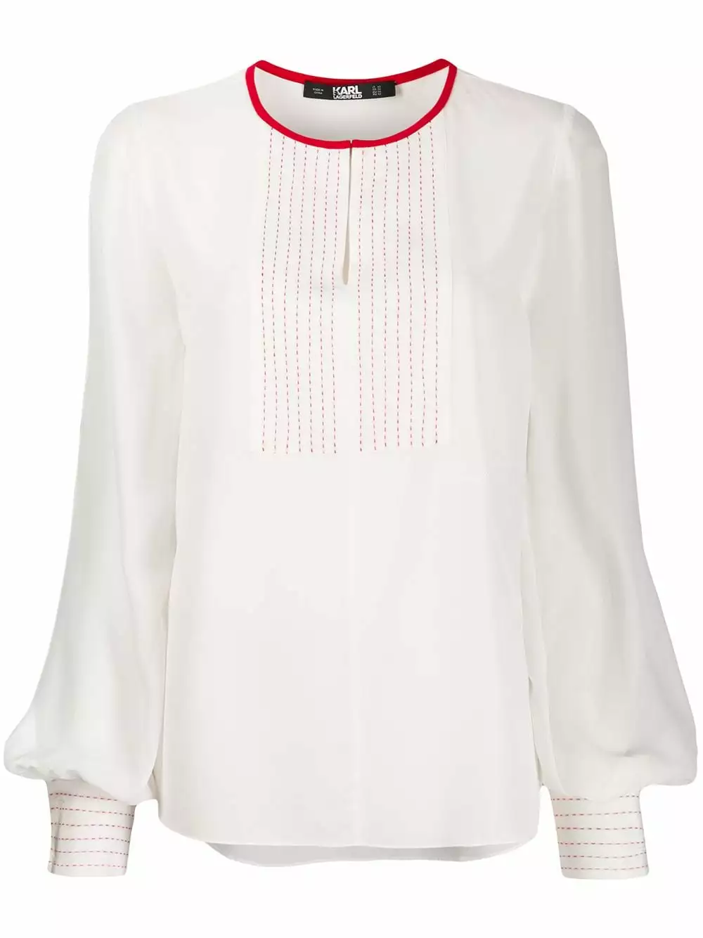 White silk stitched bib detail blouse from Karl Lagerfeld featuring a round neck, long sleeves and a straight hem.