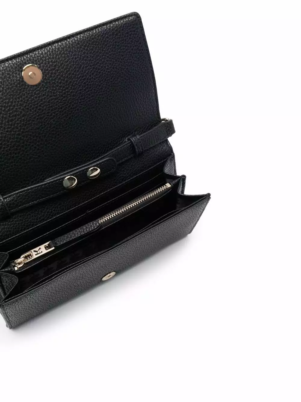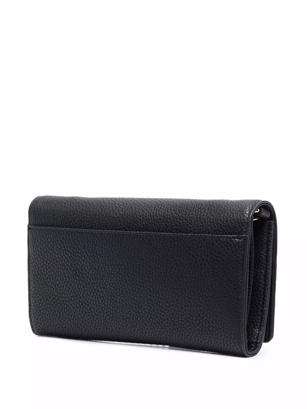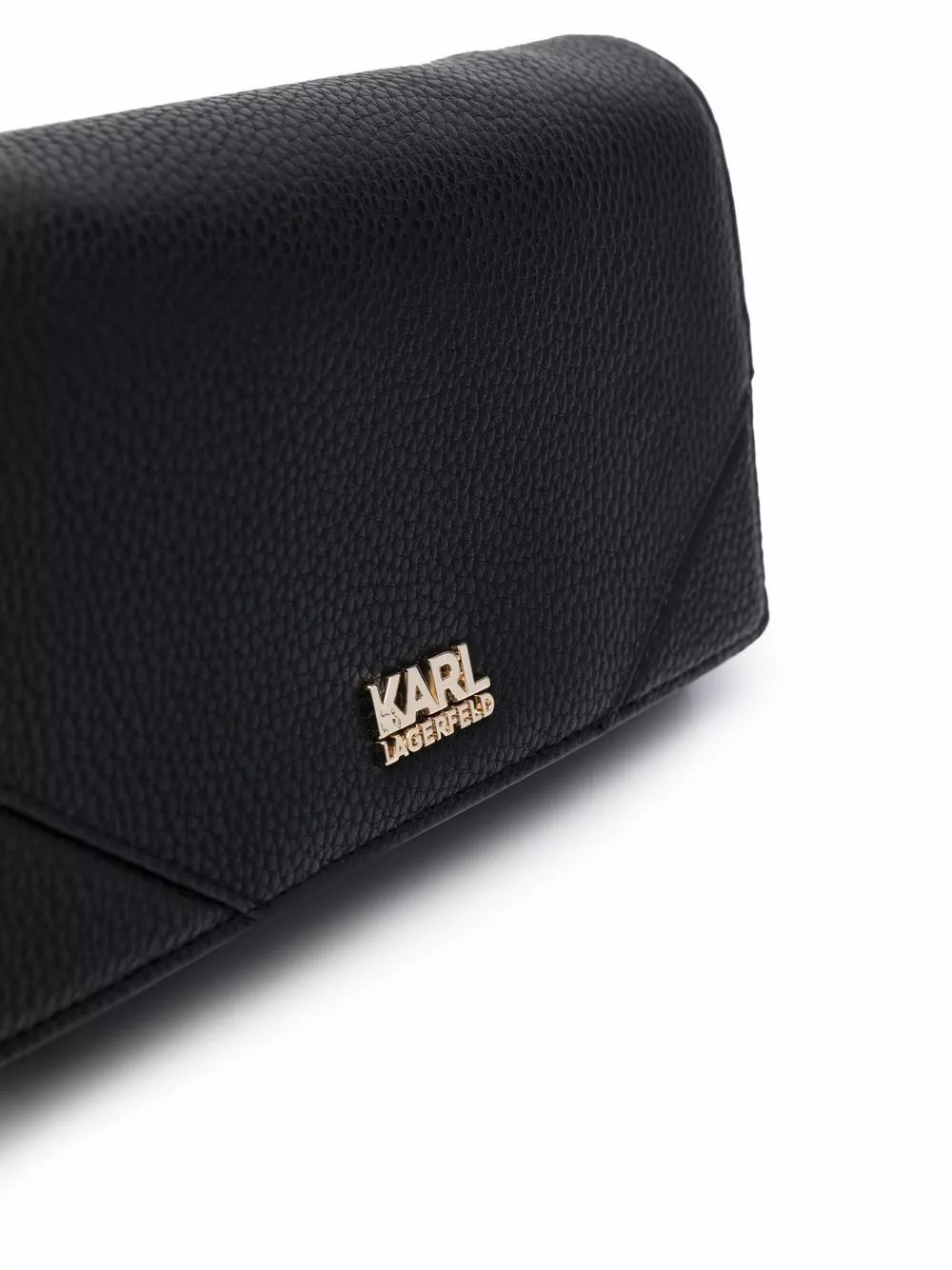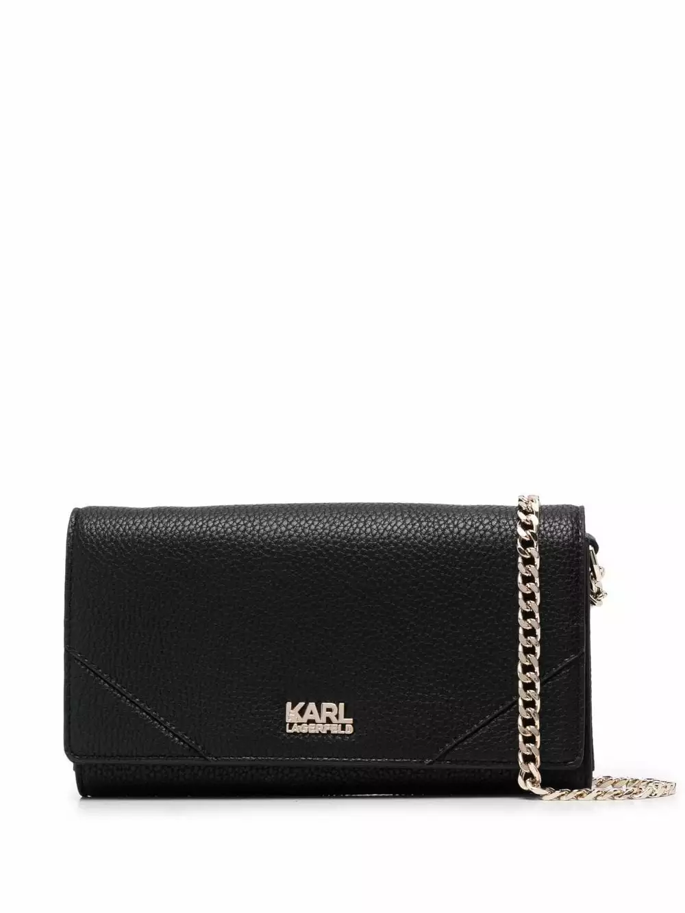 Black Stone Wallet chain-link crossbody bag from KARL LAGERFELD featuring pebbled texture, gold-tone logo plaque, foldover top, clasp fastening, chain-link shoulder strap, partitioned compartment and internal zip pocket.