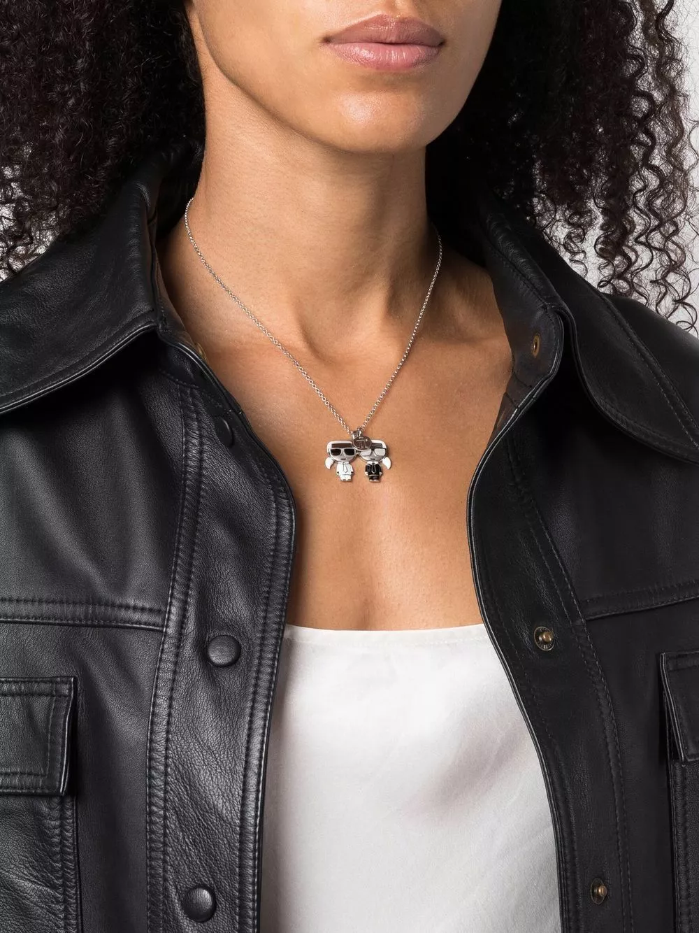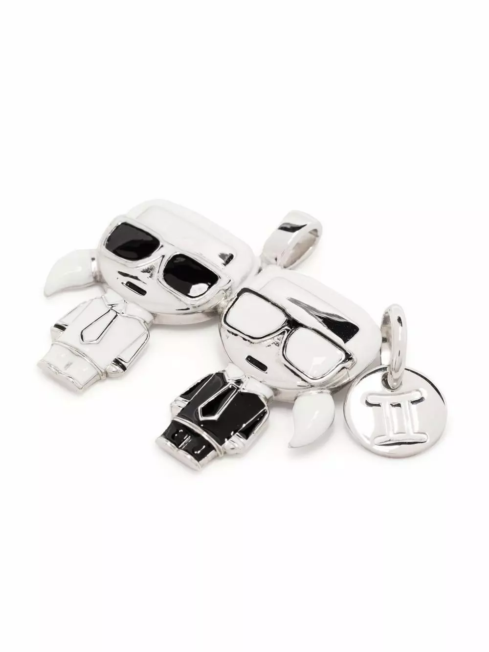From Karl Lagerfeld’s line-up of zodiac necklace pendants, this version symbolises the third astrological sign in the zodiac. The silver-tone sterling silver pendant showcases the Gemini symbol on a charm and an Ikonik iteration of the Gemini twins.